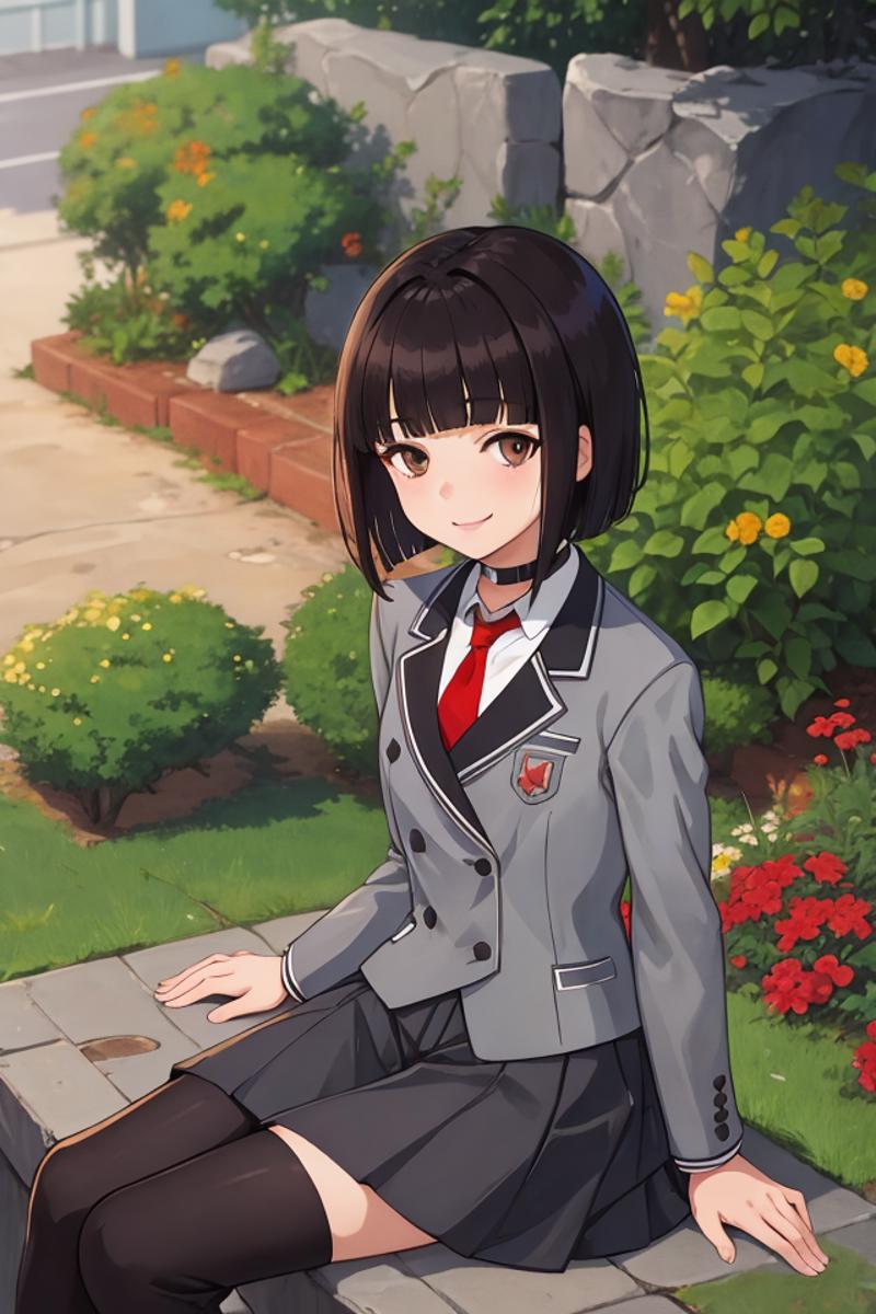 Outfit : choker, school uniform, grey jacket, red necktie, long skirt