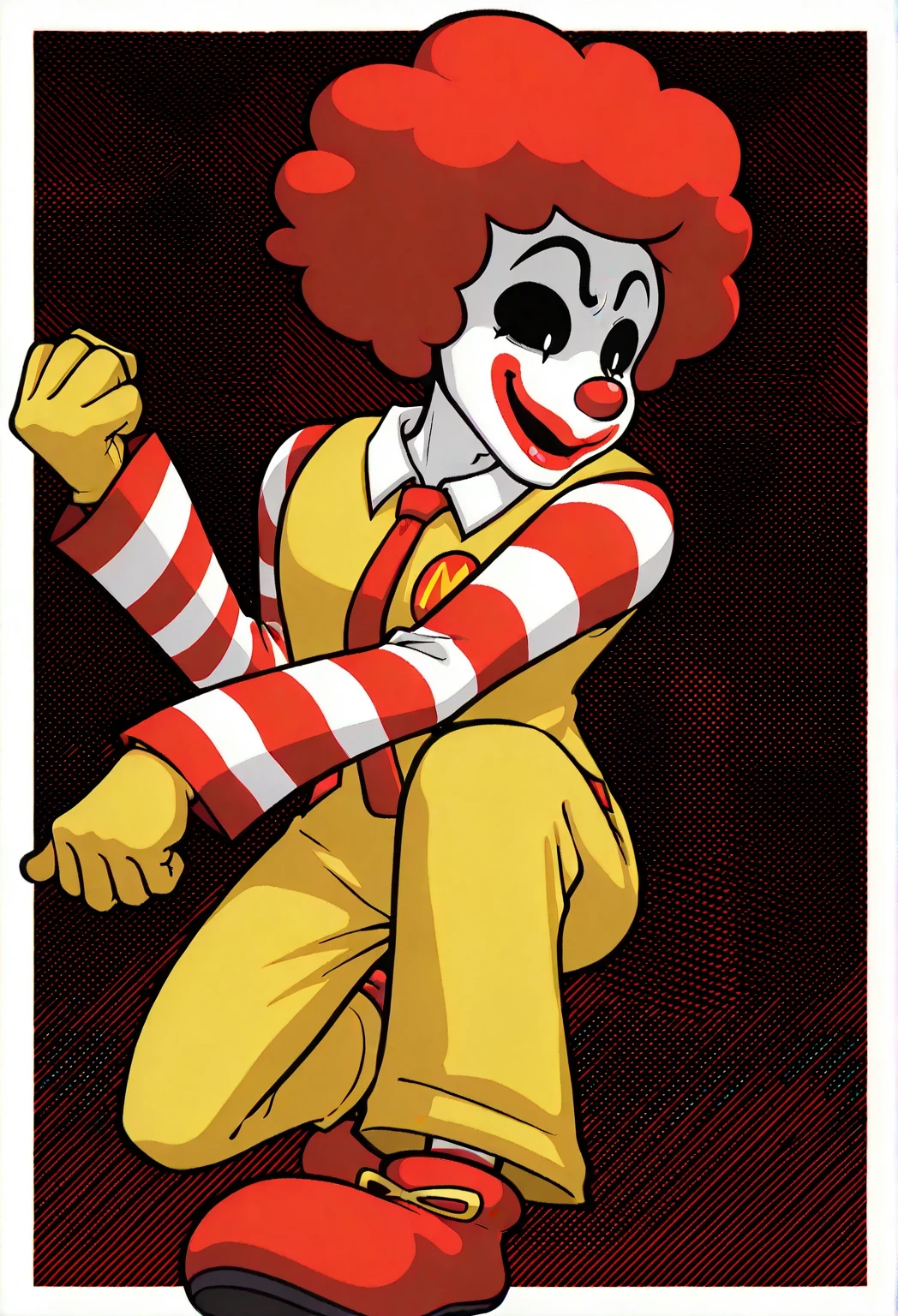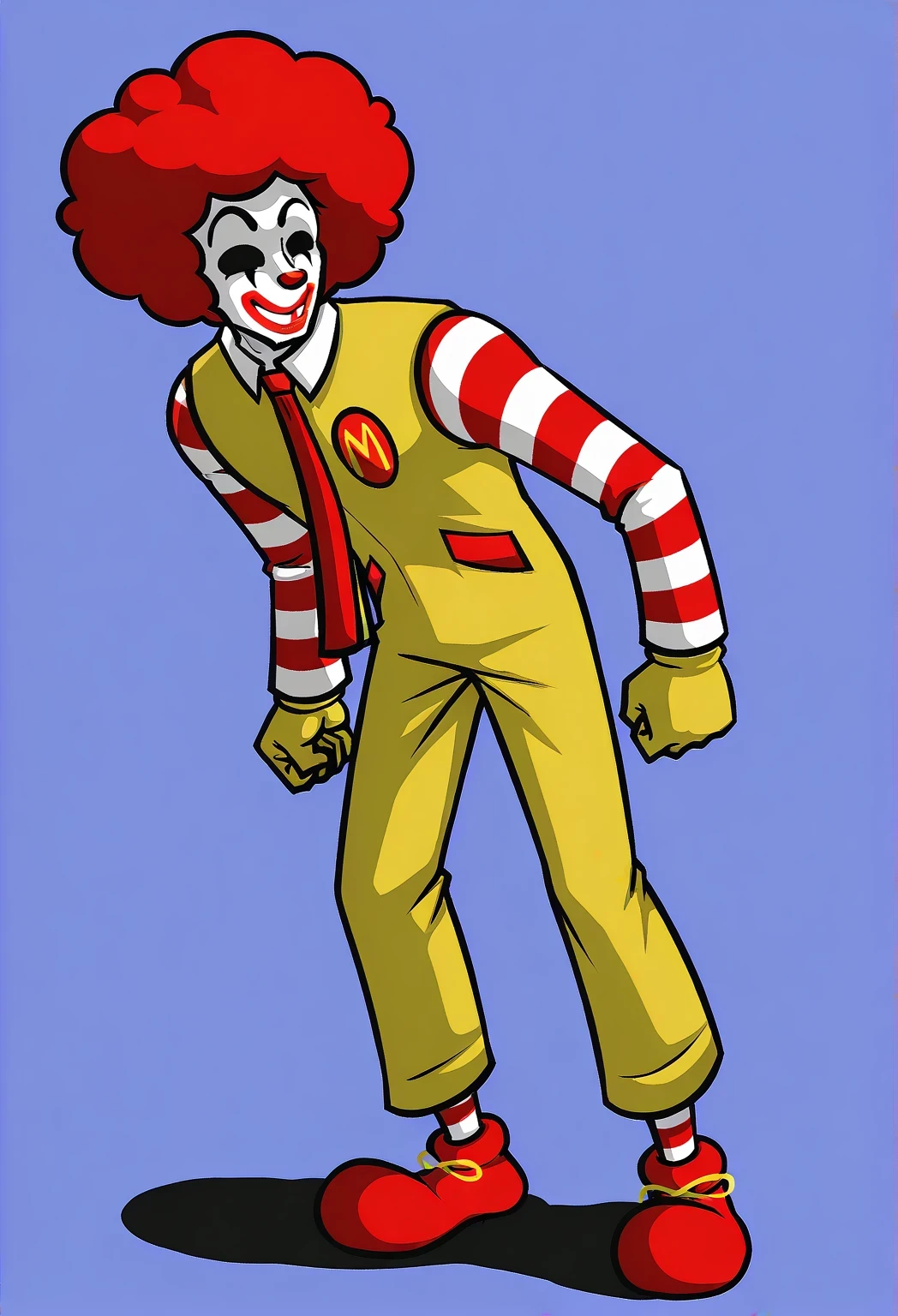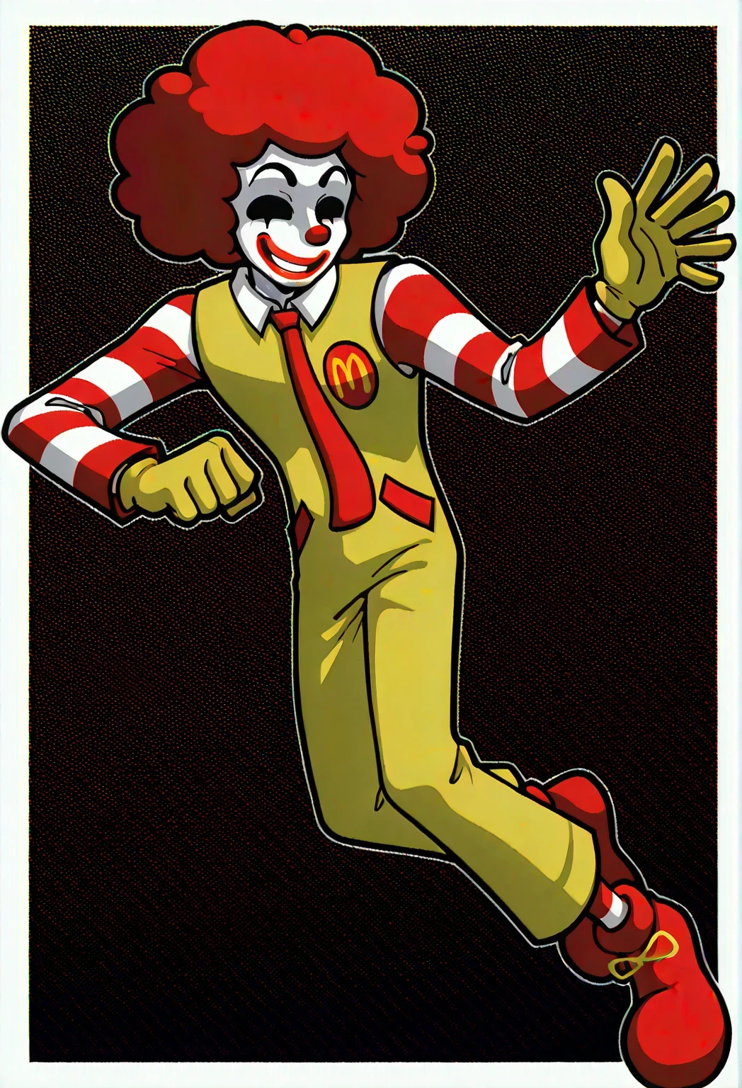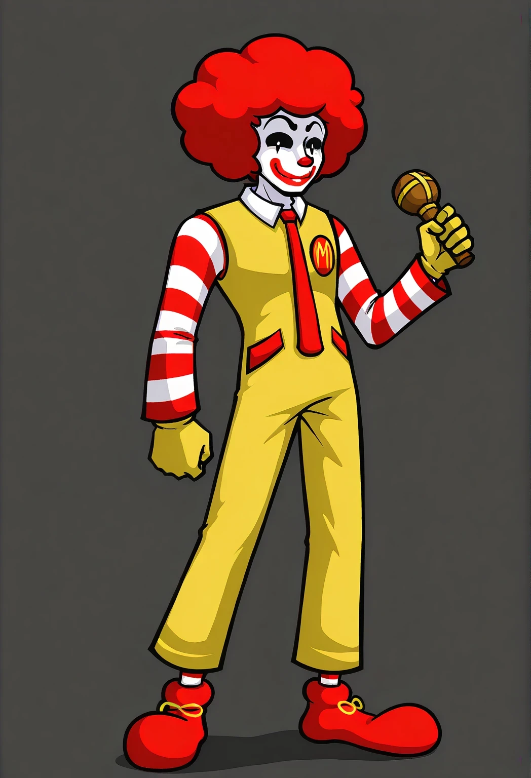 RoMcdo0naldFNF, 1boy, tall, clown, black hollow eyes, red nose, red lips, red hair, pale white skin, red-yellow clown costume, white collar, red-white striped sleeves, yellow gloves, red necktie, red shoes