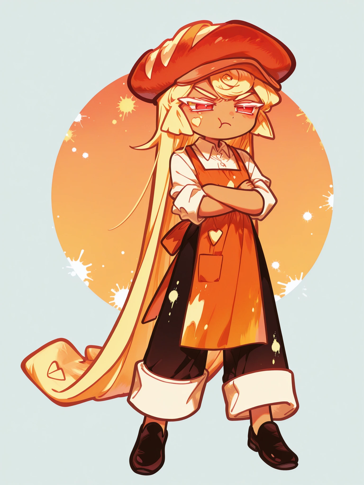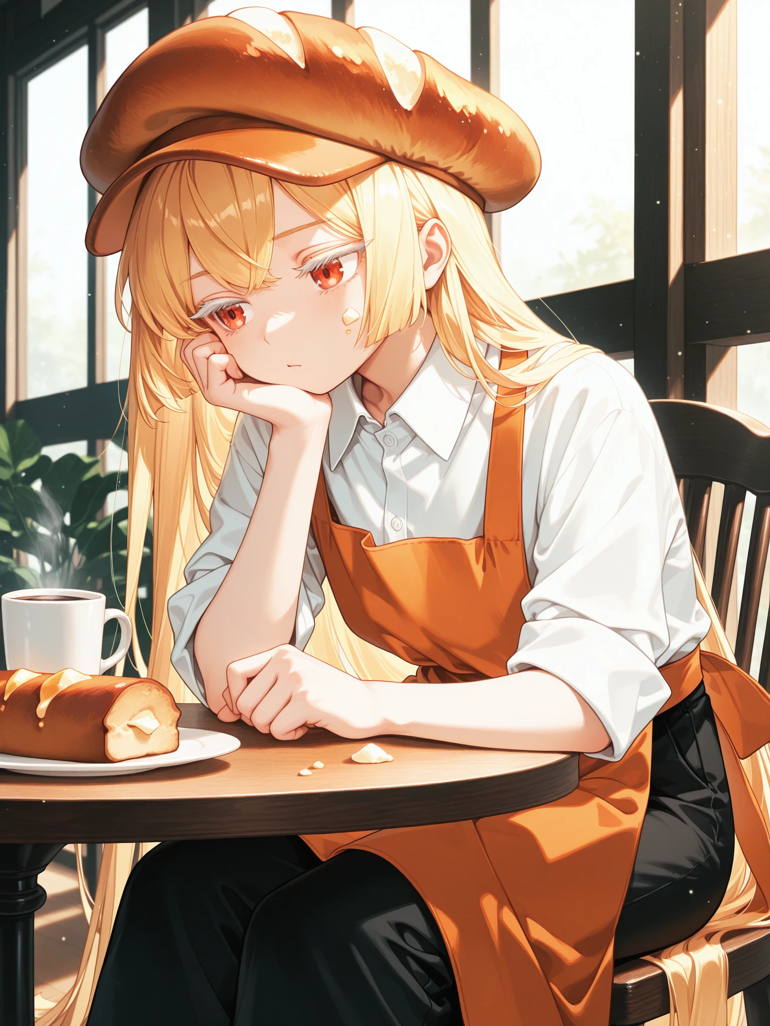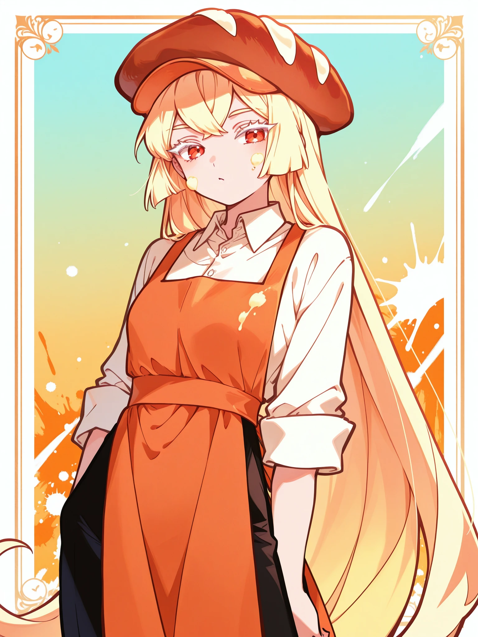 bread cabbie hat, collared shirt, sleeves rolled up, black pants, pants rolled up, black footwear, orange apron