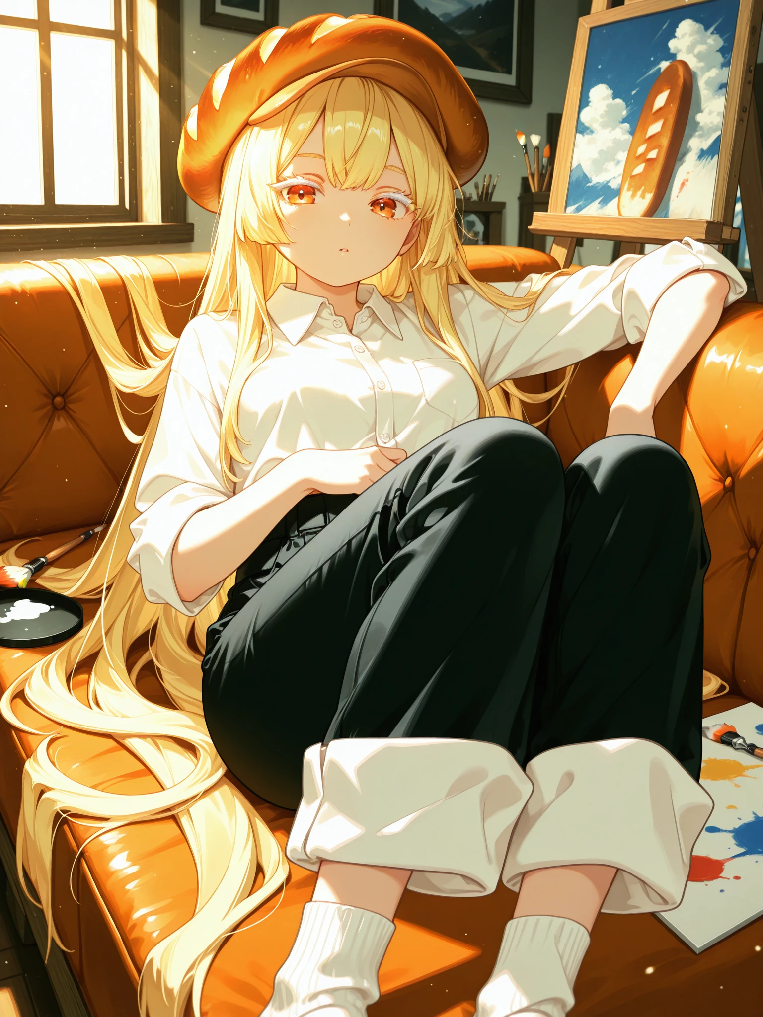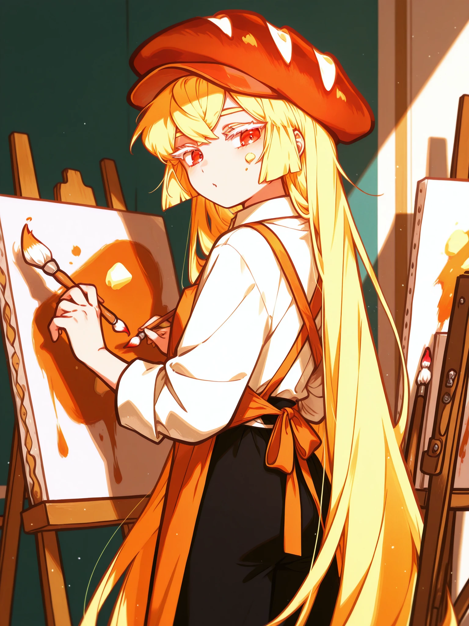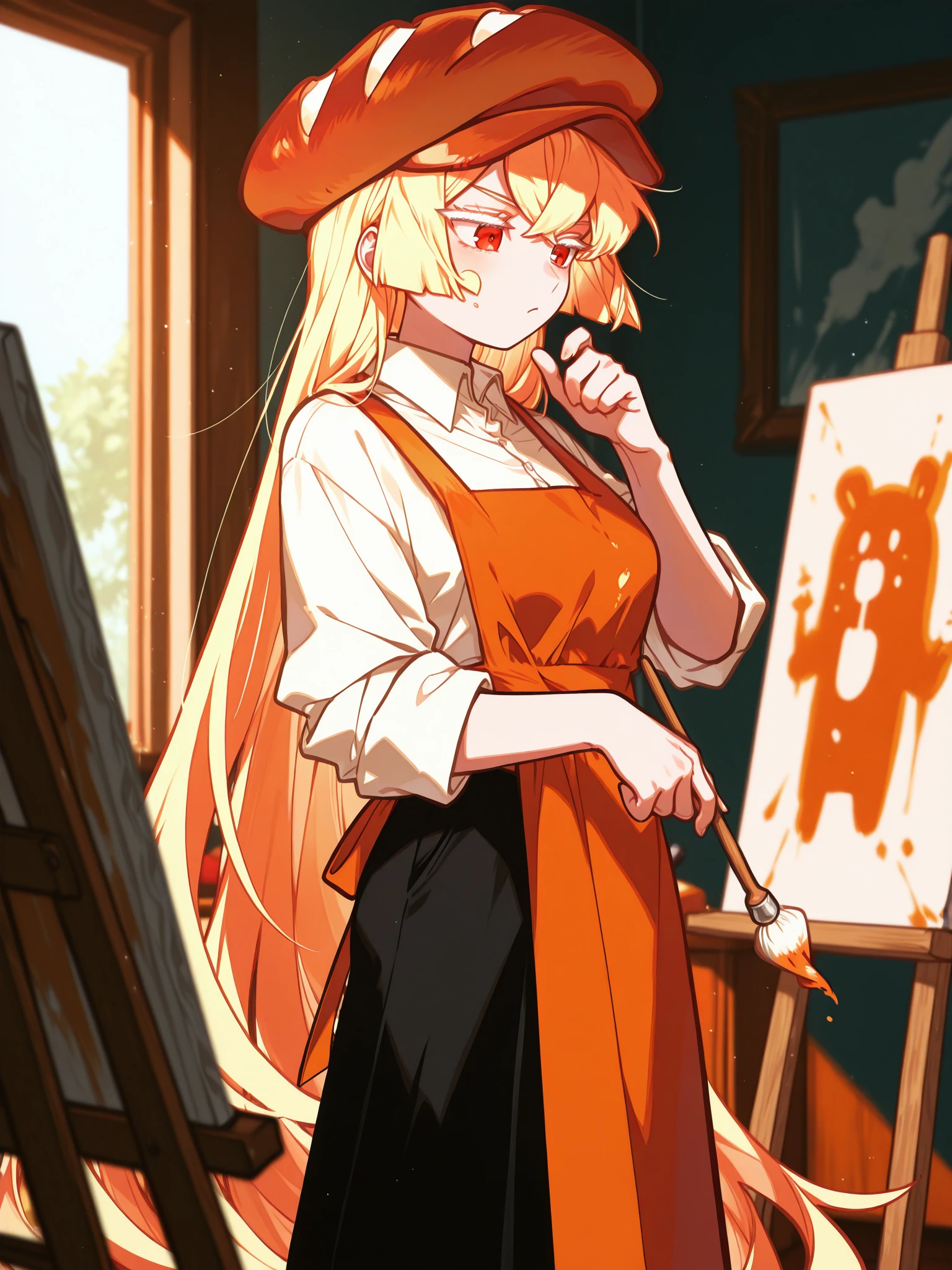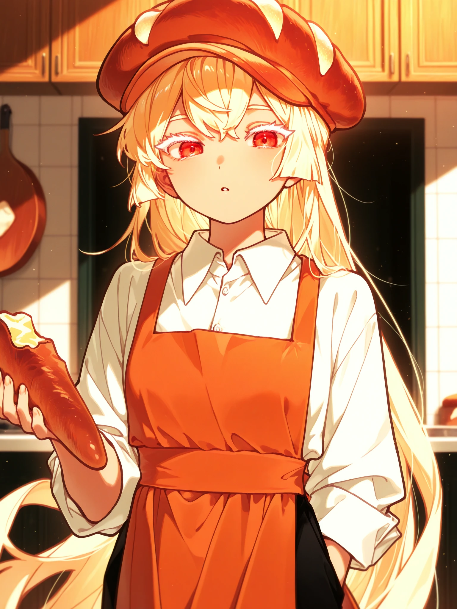bread cabbie hat, collared shirt, sleeves rolled up, black pants, pants rolled up, black footwear, orange apron