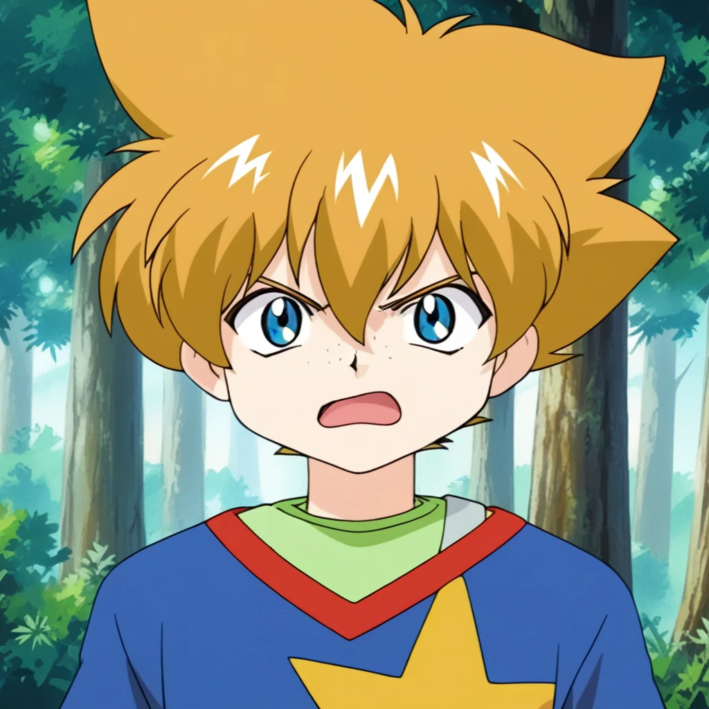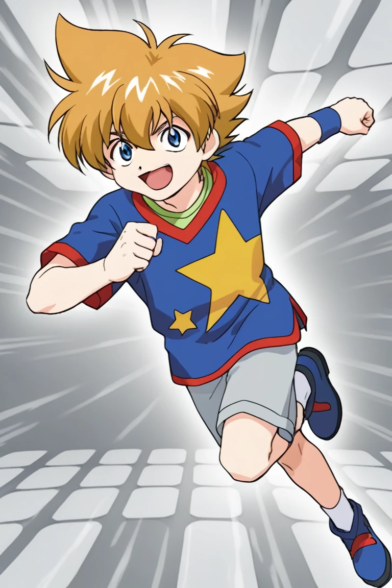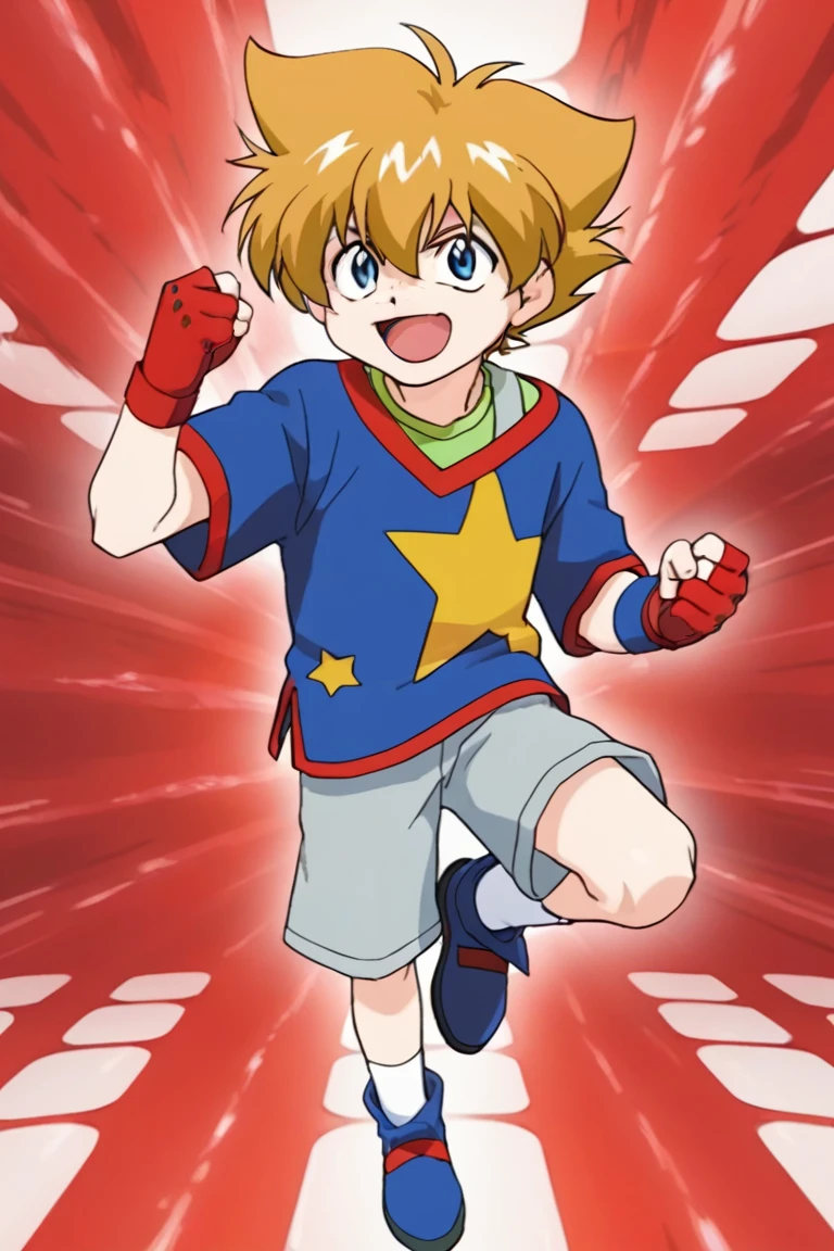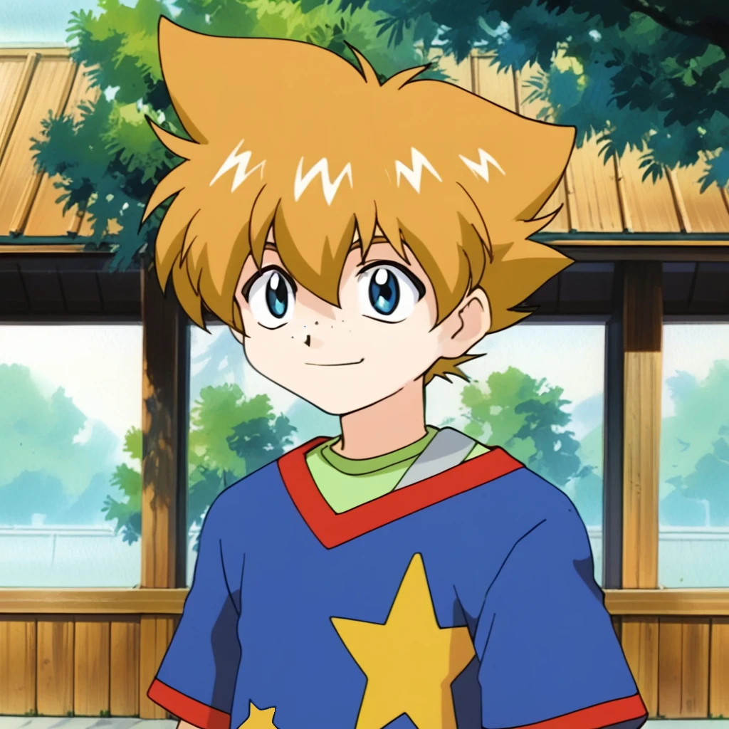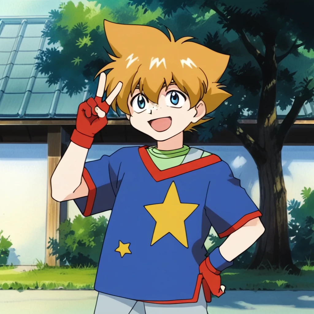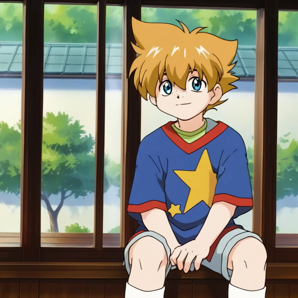 Prompts: male, blonde hair, blue eyes, freckles, t-shirt, star (symbol), two stars, green undershirt, short sleeves, single blue wristband, partially fingerless gloves, shorts, socks, shoes, indoors (dojo/window without glass), outdoors (dojo/sky/cloud/east Asian architecture/tree/bush), outdoors (forest/tree), grey background, red background
