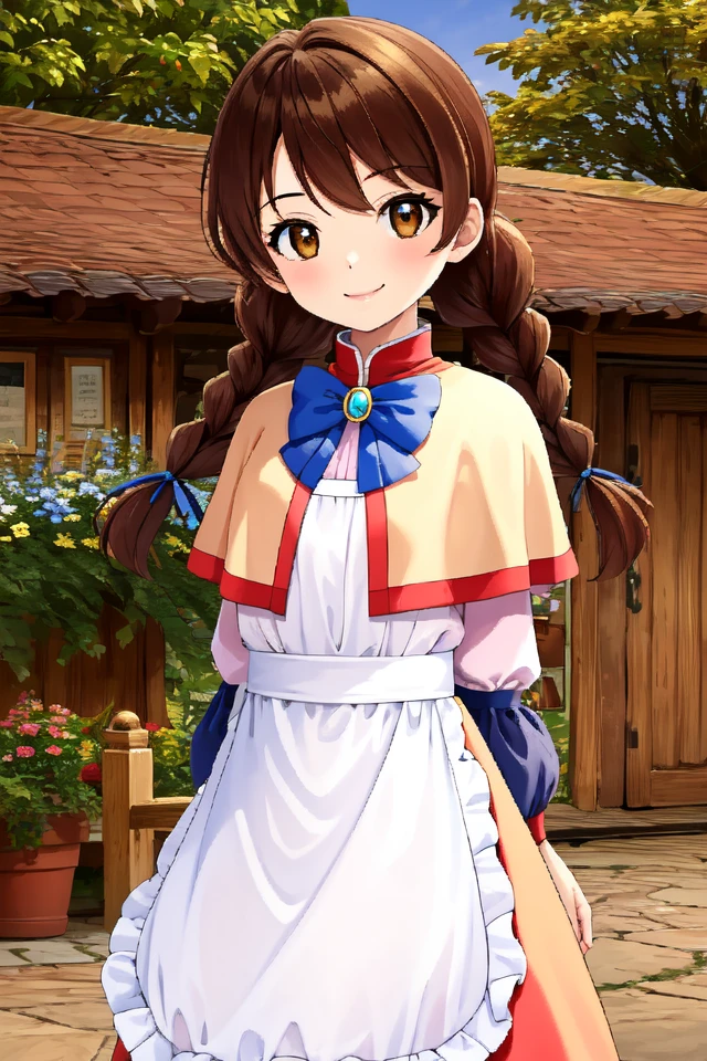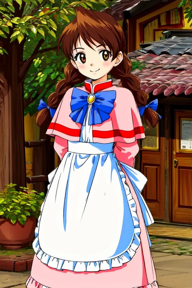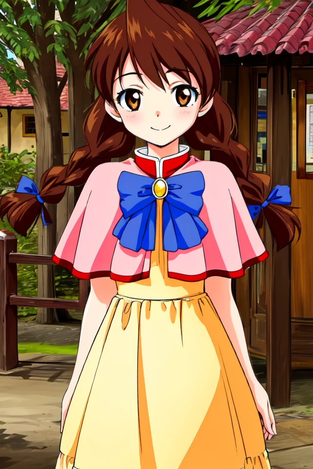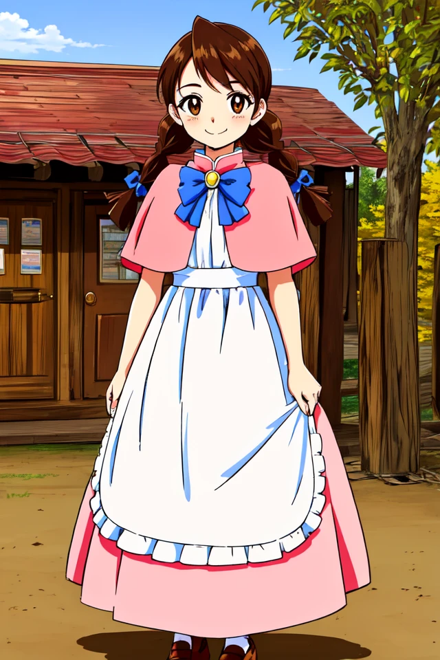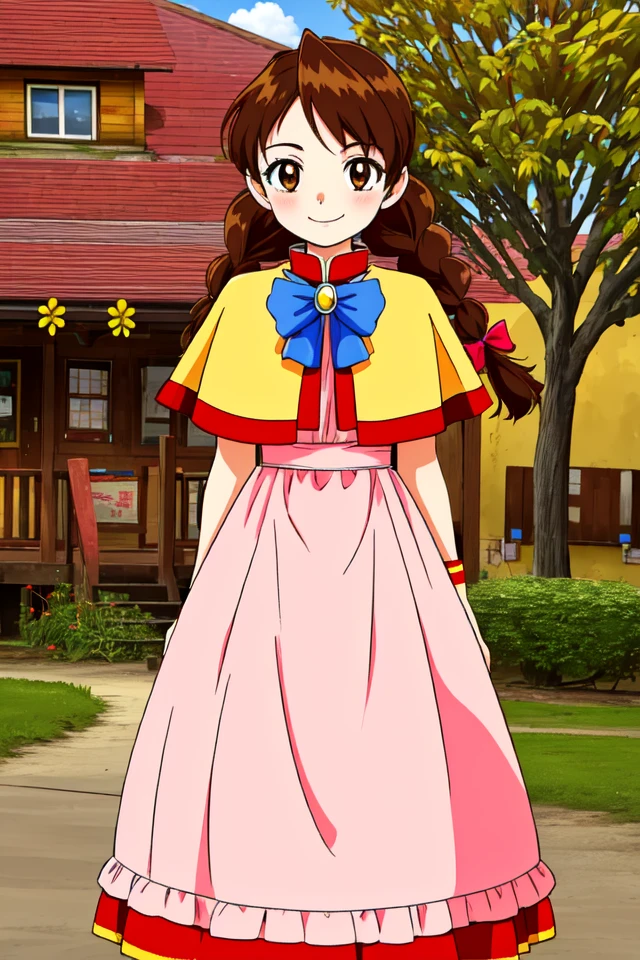pink capelet, blue bow, dress, long skirt, yellow skirt, apron,