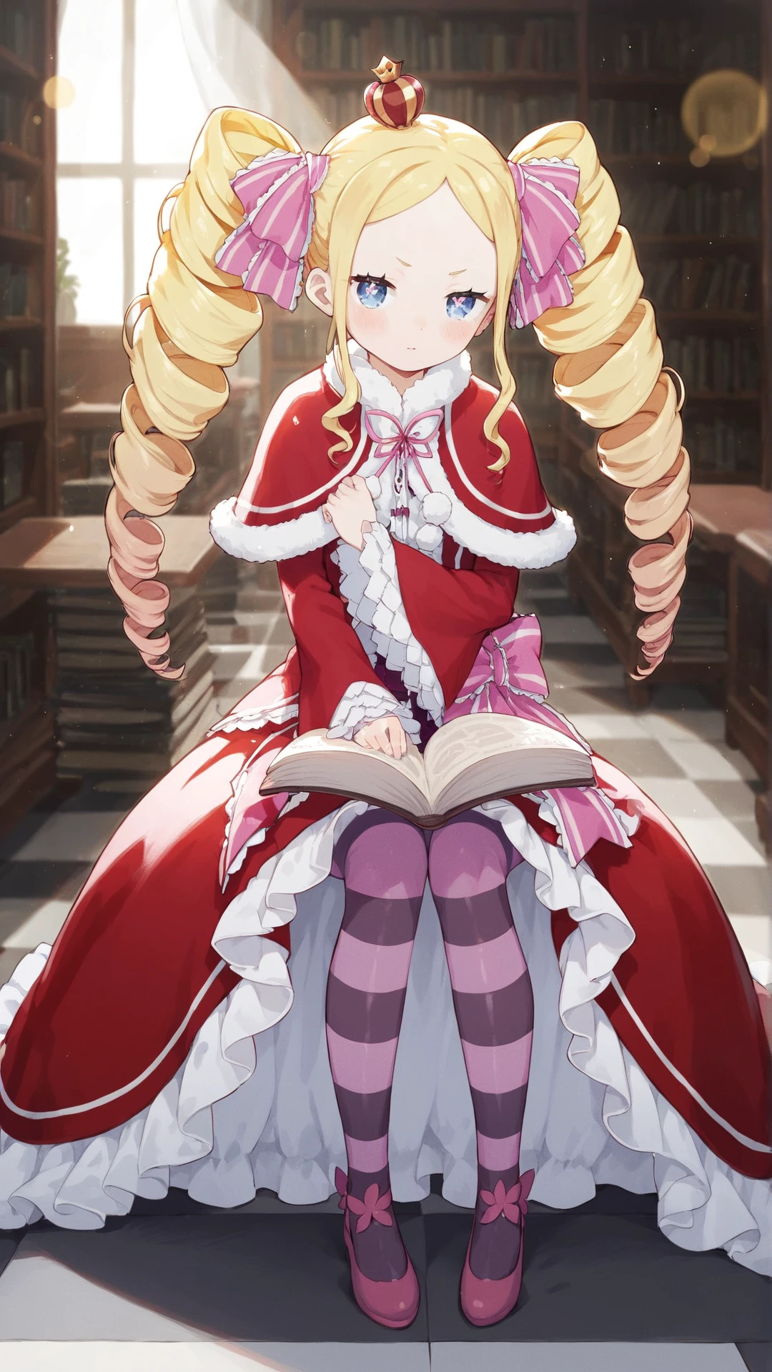 beatrice_rezero, an anime girl, 1girl, solo, long hair, looking at viewer, blush, blue eyes, blonde hair, long sleeves, dress, ribbon, twintails, sitting, hair ribbon, pantyhose, sidelocks, striped, indoors, book, symbol-shaped pupils, fur trim, capelet, drill hair, red dress, crown, twin drills, open book, bookshelf, mini crown, checkered floor, fur-trimmed capelet, library, striped pantyhose