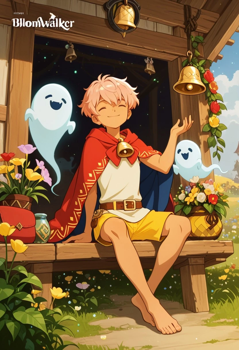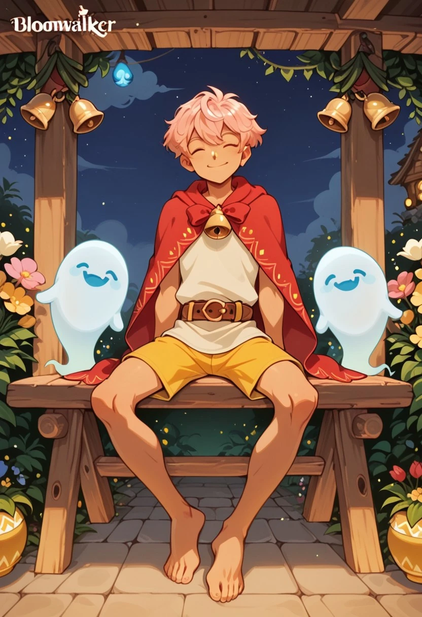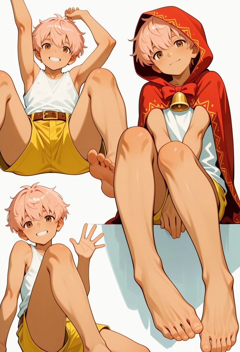 bloomwalker, 1boy, male focus, solo, male, pink hair, short hair, brown eyes, red cape, cape, yellow shorts, shorts, barefoot, sleeveless, accessories, belt, neck bell, hoodie, hood