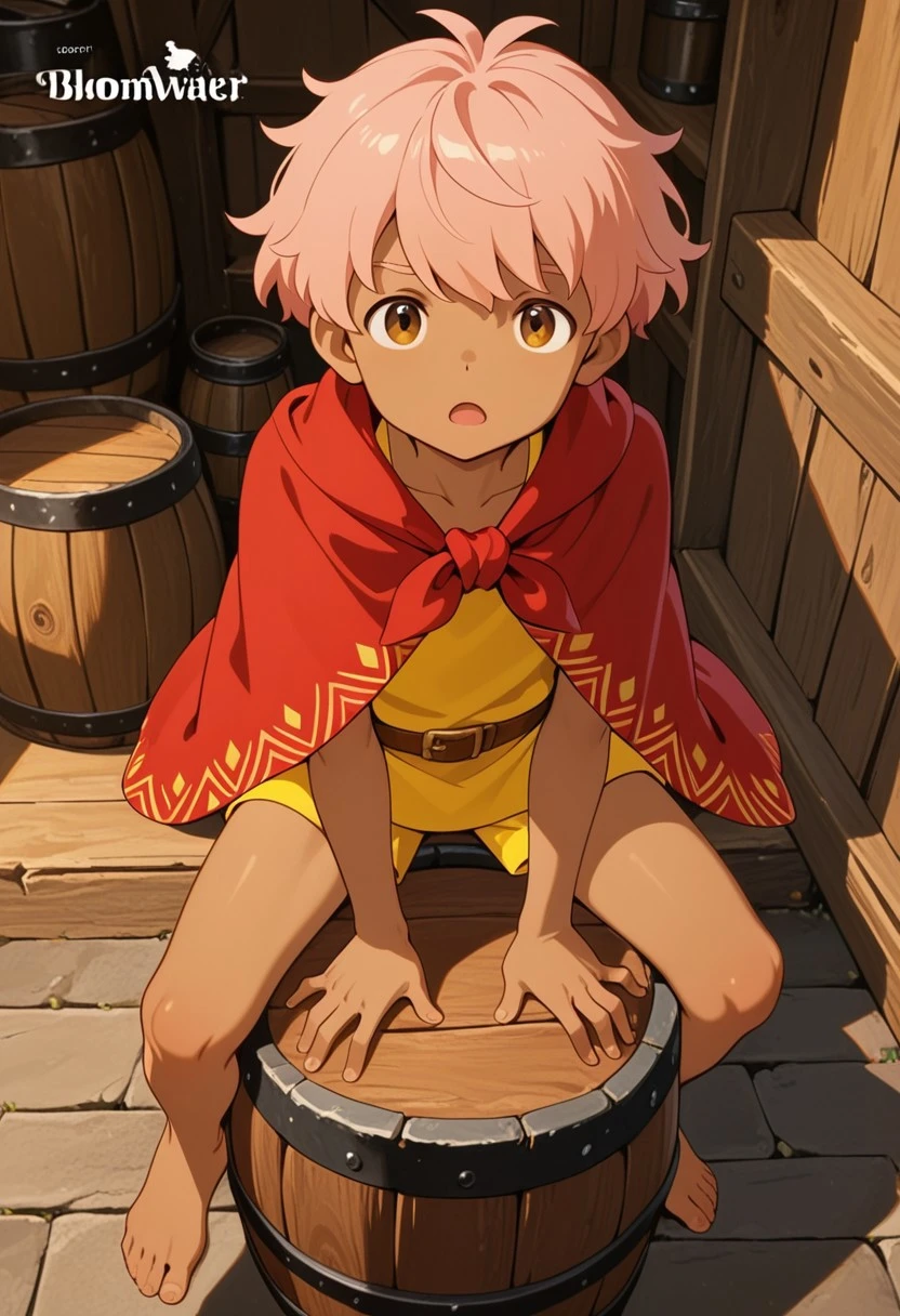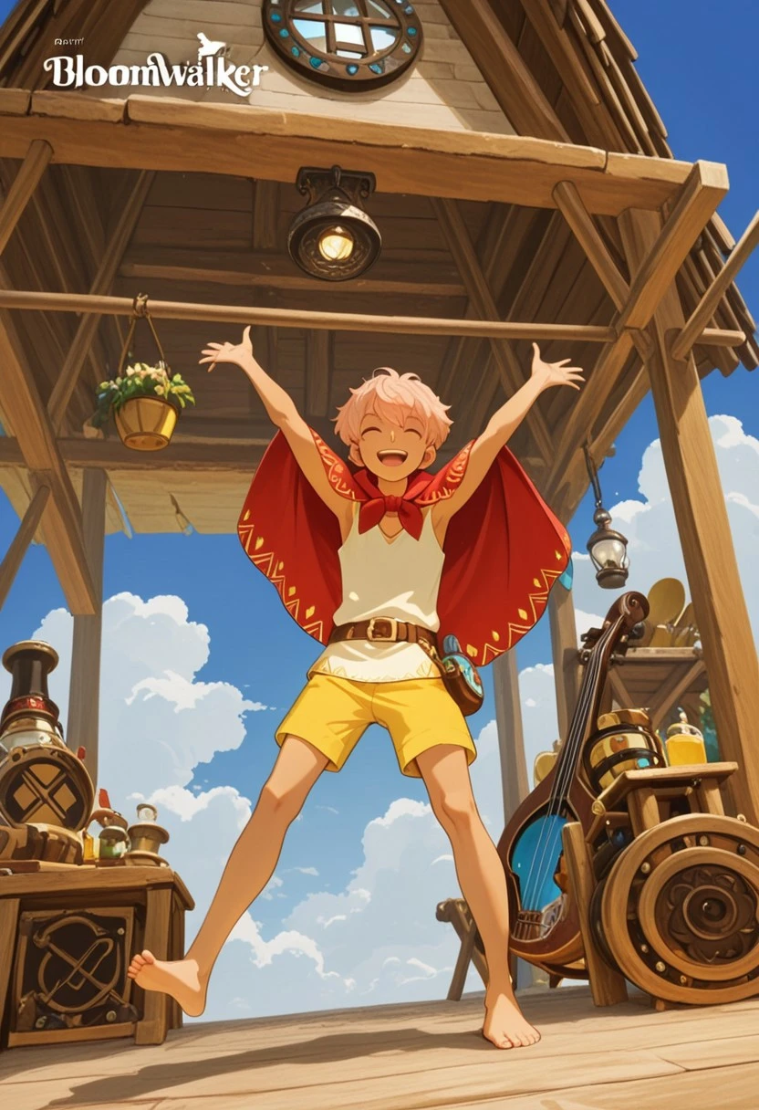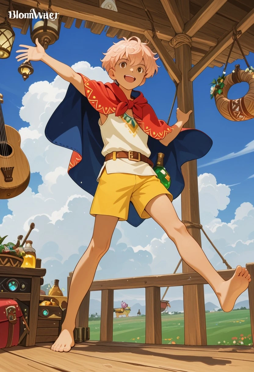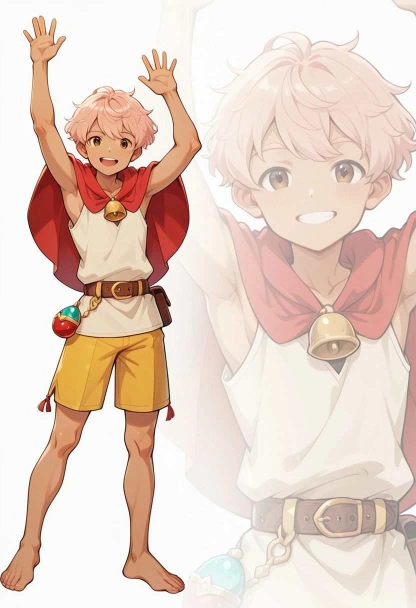 bloomwalker, 1boy, male focus, solo, male, pink hair, short hair, brown eyes, red cape, cape, yellow shorts, shorts, barefoot, sleeveless, accessories, belt, neck bell, hoodie, hood