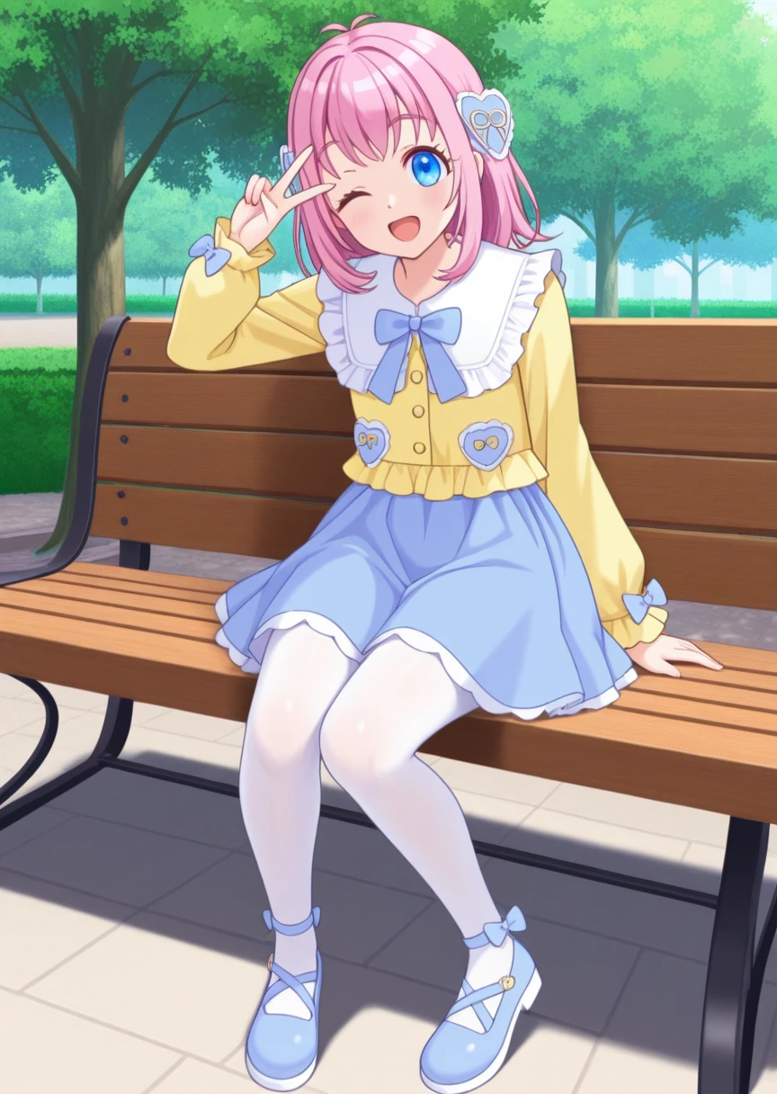 miruki, blue eyes, hair ornament, short hair, casual clothing, skirt, white pantyhose, blue footwear, yellow shirt,
