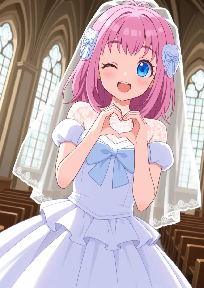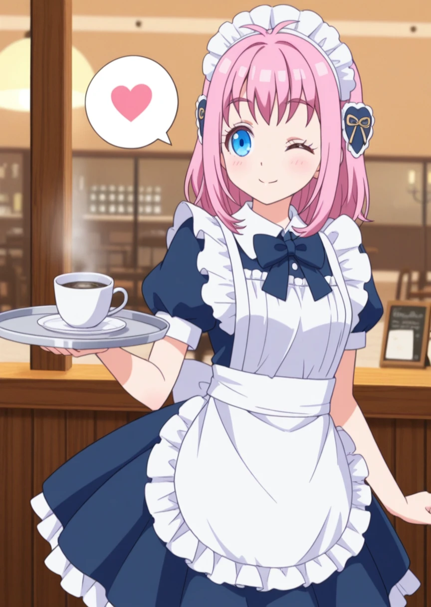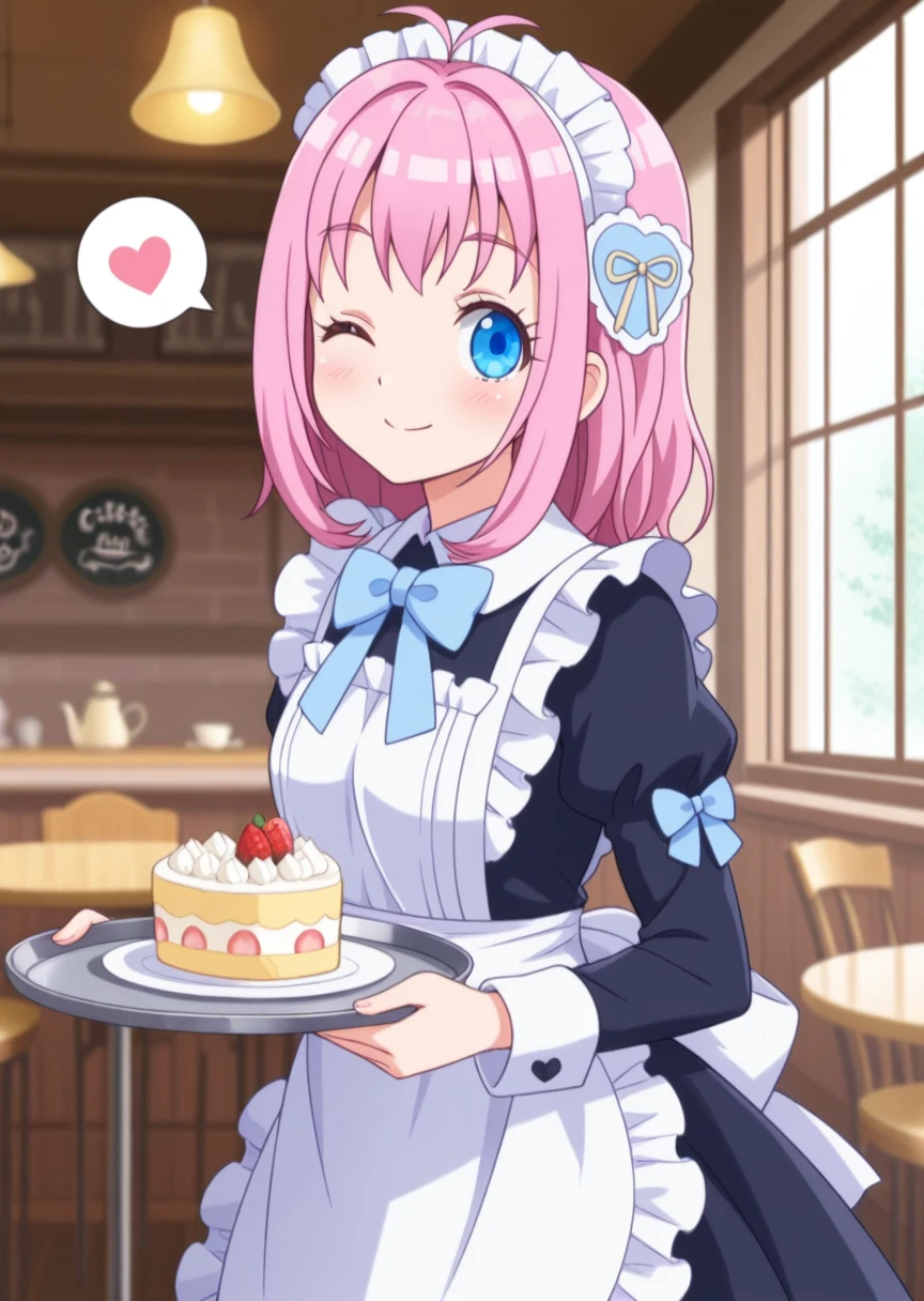 Model: mirudress, blue eyes, white beret, short hair, plaid dress, long sleeves, pink hair