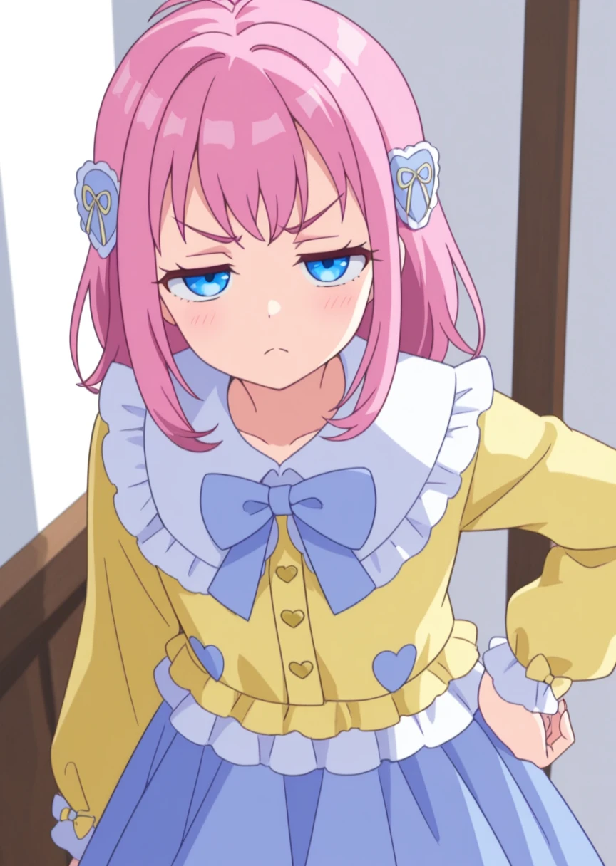 Casual: miruki, blue eyes, hair ornament, short hair, casual clothing, skirt, white pantyhose, blue footwear, yellow shirt,