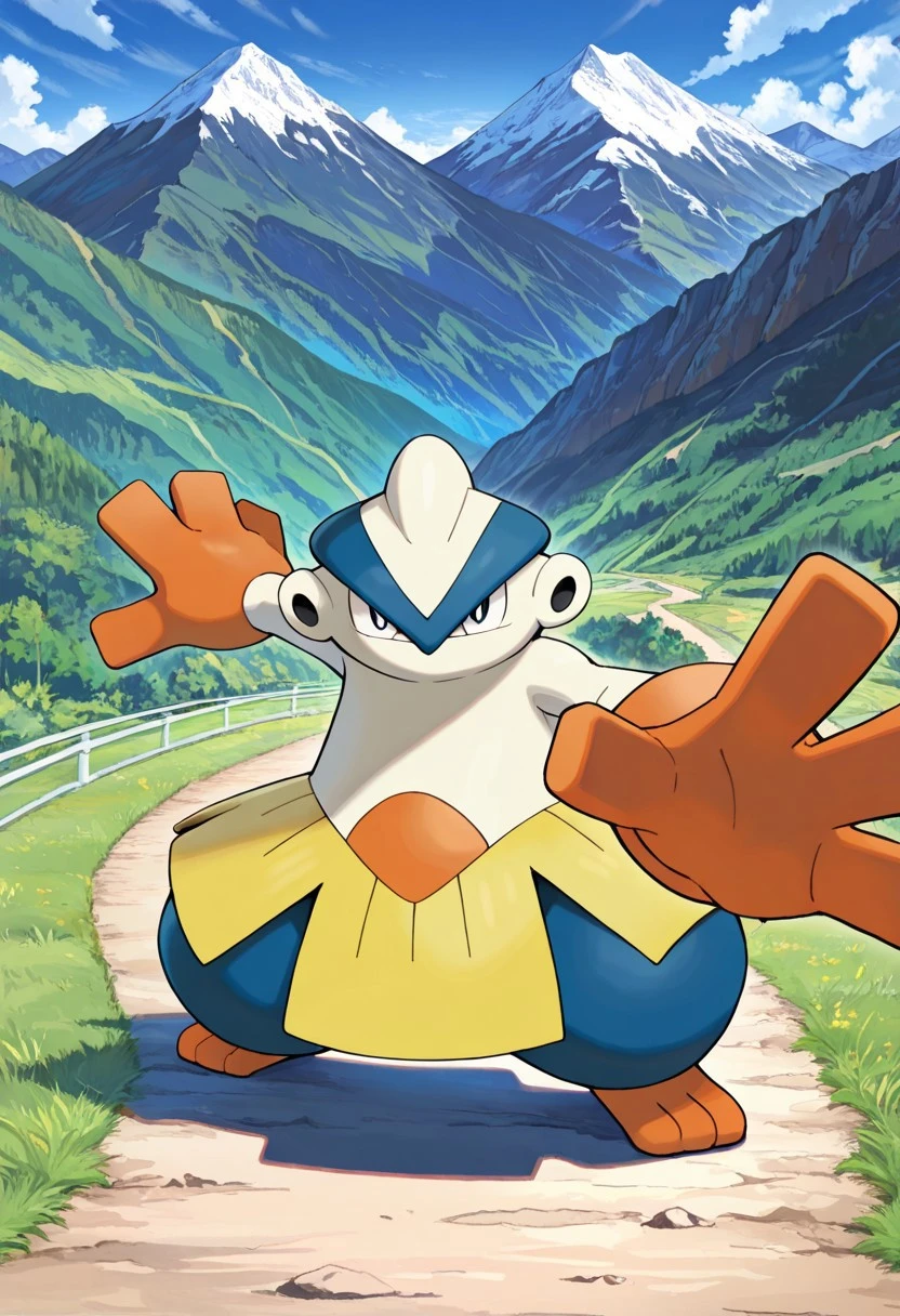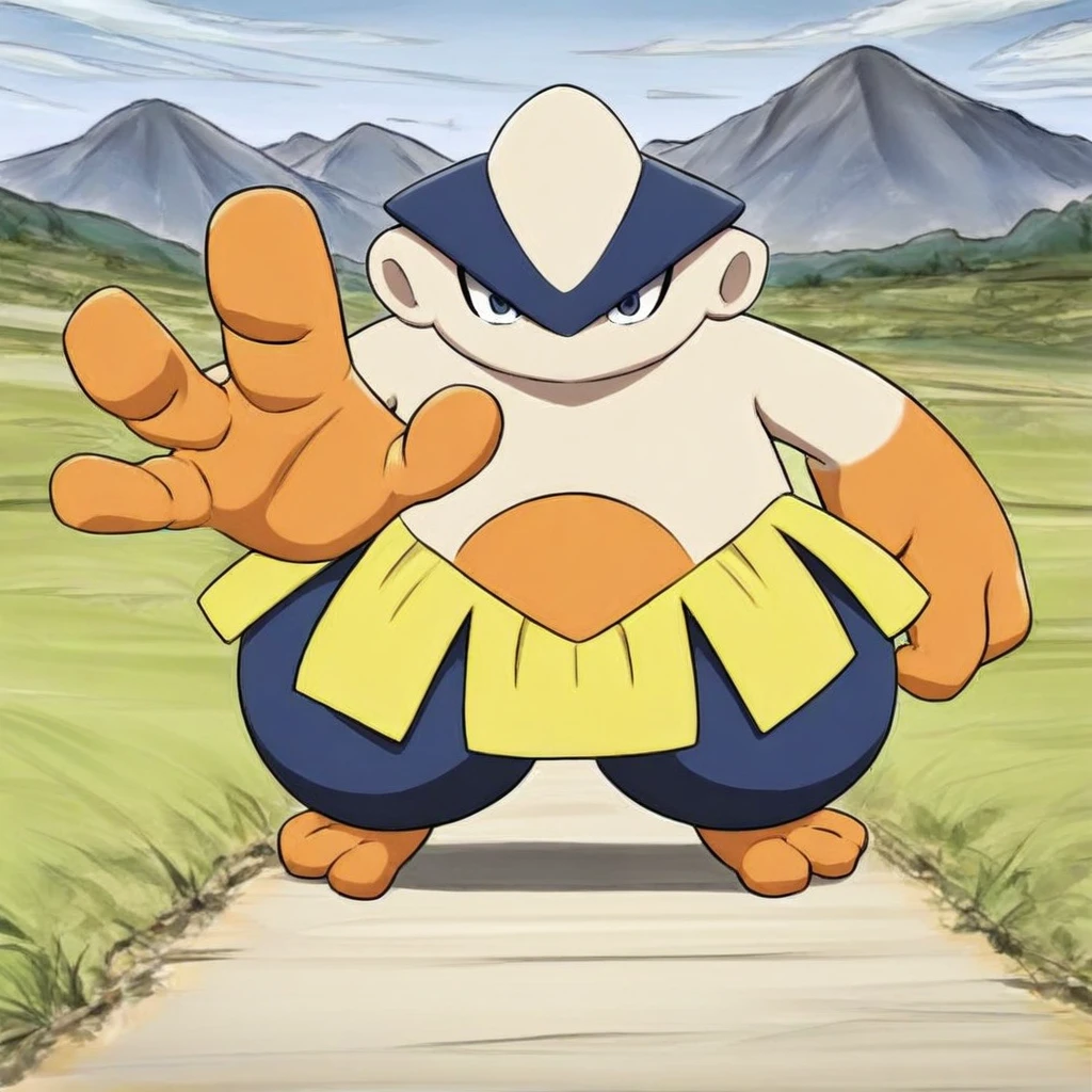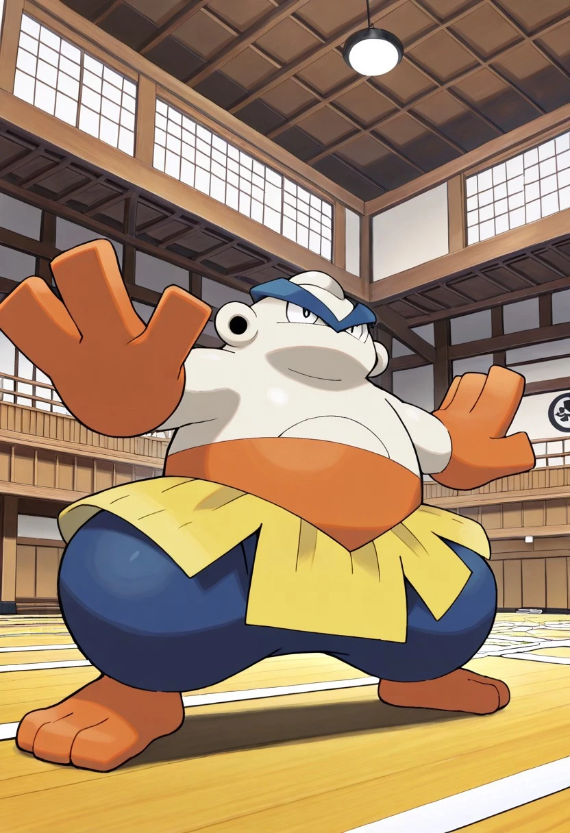 Hariyama_pkmn, orange hands, orange feet, orange abdomen, yellow frills, blue legs, blue eyebrows, three fingers