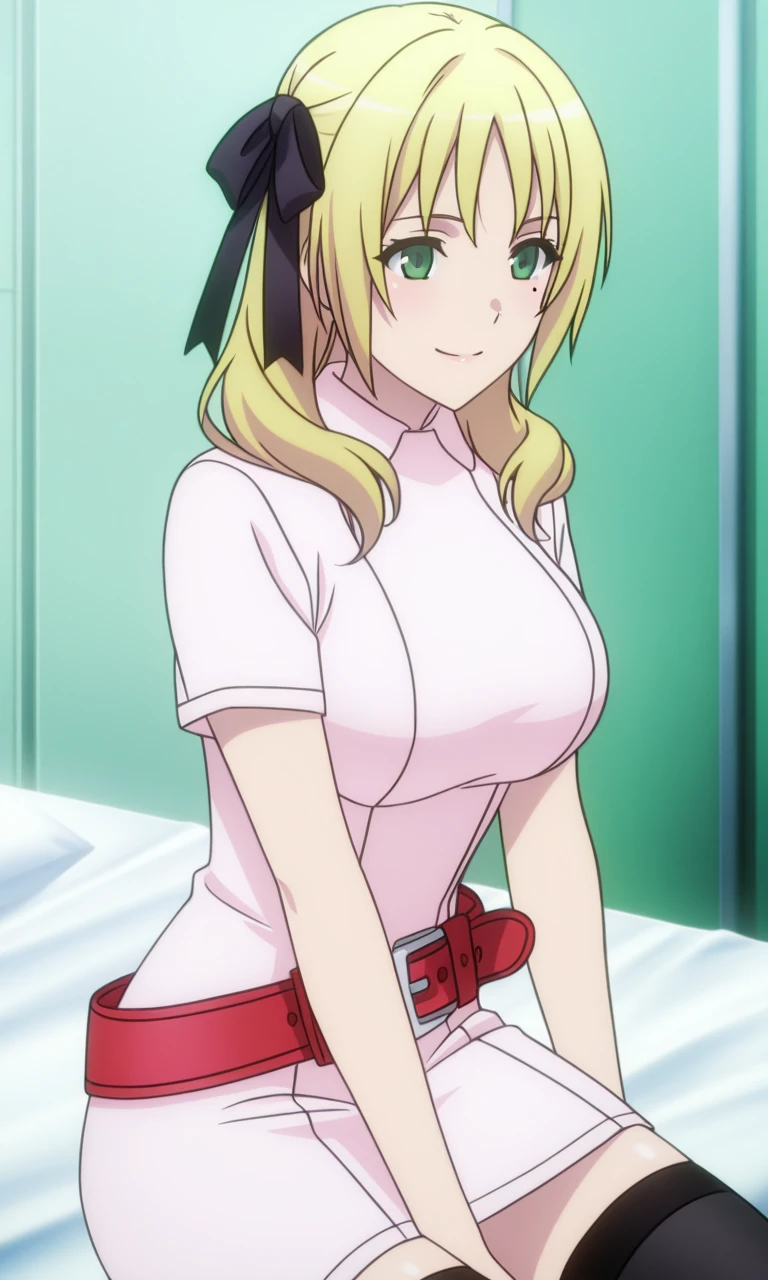 esther rosenthal,1girl,solo, long hair, blonde hair, green eyes, mole, mole under eye, black ribbon, black bow, hair ribbon,nurse, dress, pink dress, short sleeves, collar, belt, red belt,thighhighs,black thighhighs