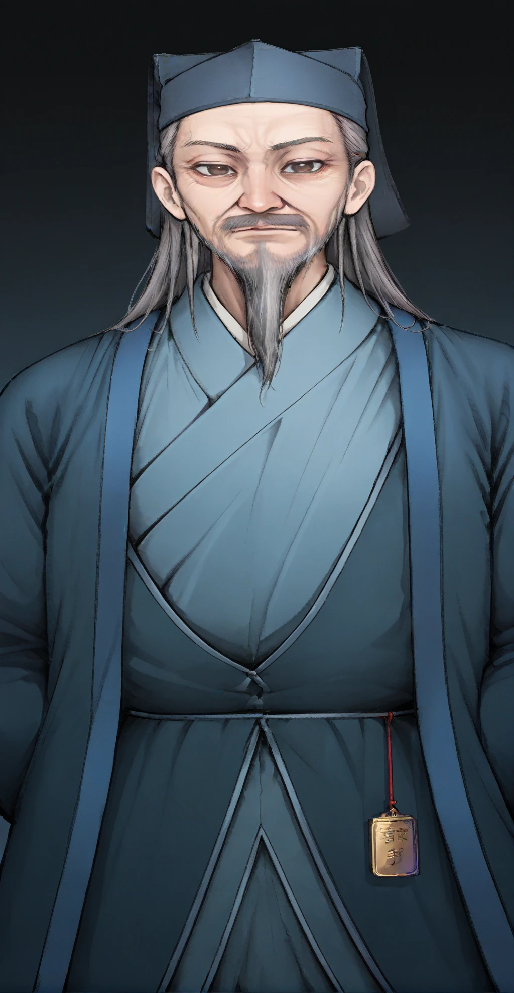 1boy, beard, solo, male focus, facial hair, holding, full body, standing, long sleeves, simple background, white background, hat, old man, mustache, chinese clothes, wide sleeves, black footwear, robe, transparent background, blue headwear, old, dangjungryeong