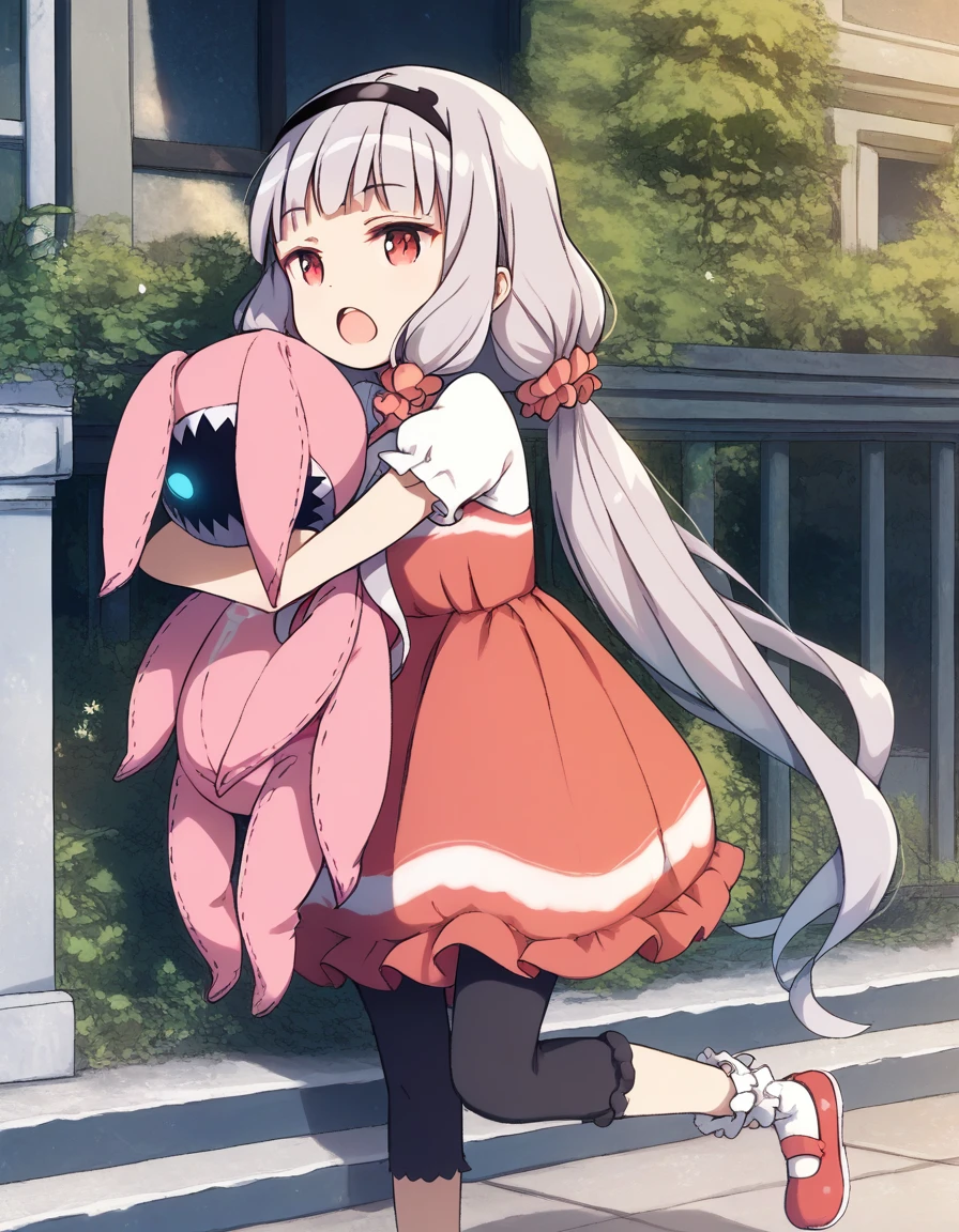 venera, hairband, hair scrunchie, red dress, white shirt, vertical-striped shirt, puffy short sleeves, leggings, socks, mary janesgalaktika