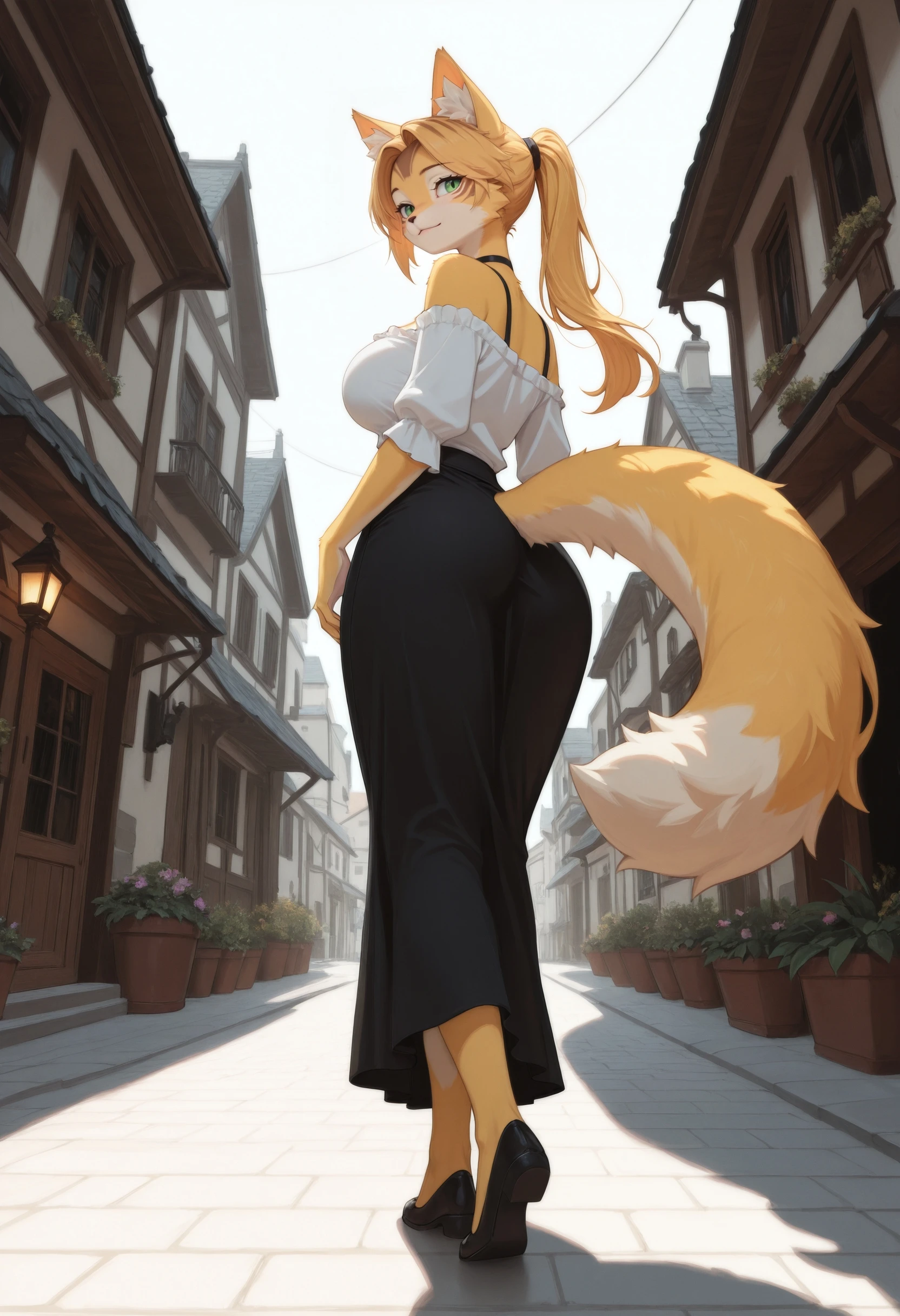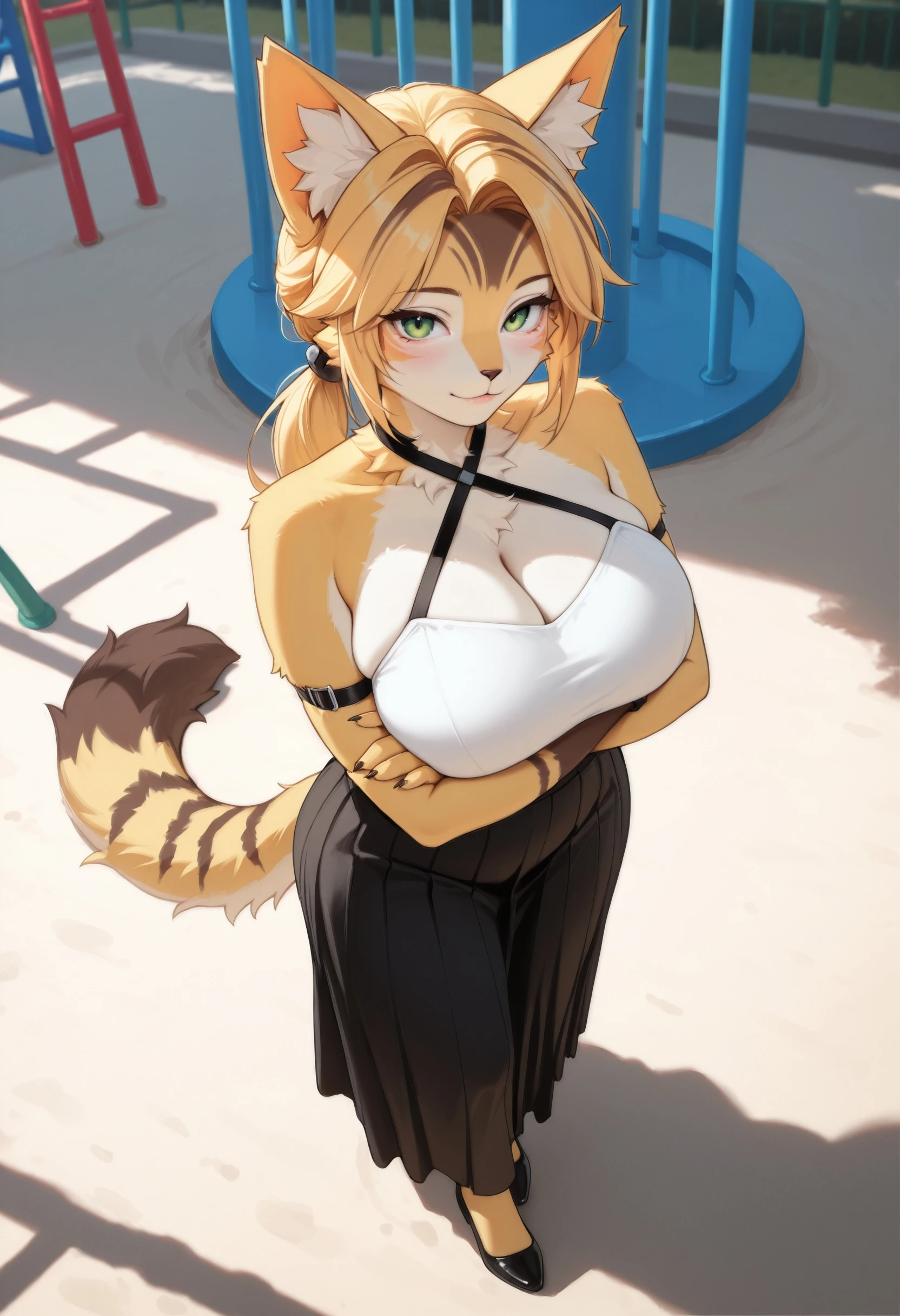 (Positive Prompts) zpulchra, pulchra, cat girl, cat ears, cat tail, furry, furry female, animal ear fluff, fluffy tail, yellow fur, ponytail, green eyes, parted bangs, large breasts,