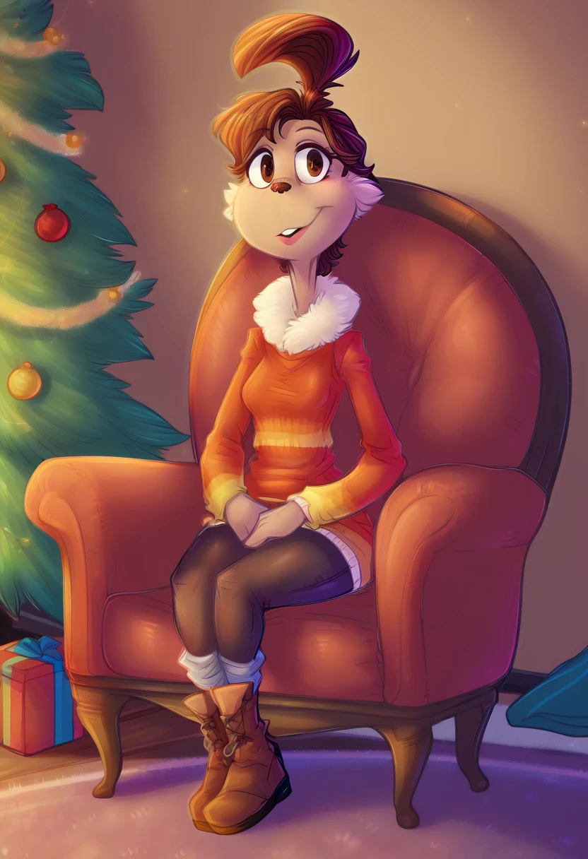 sally, brown hair, brown eyes, topknot, yellow-orange fluffy sweater, brown pants, brown shoes, fluffy clothes