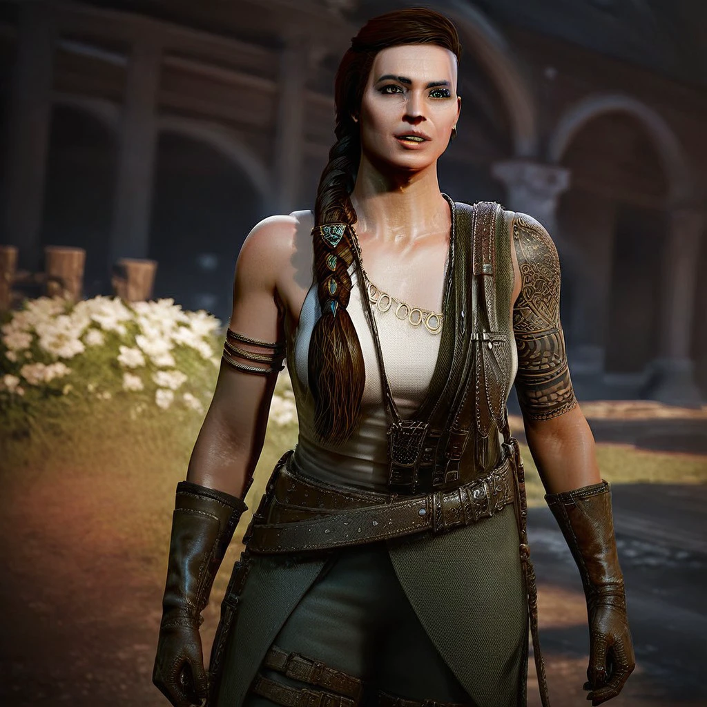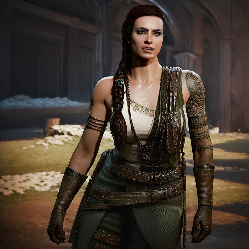 1girl, solo, big breast, belt, braid, parted lips, hair over shoulder, boots, necklace, tattoo, gloves, shoulder tattoo,