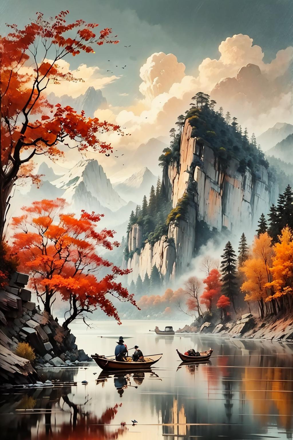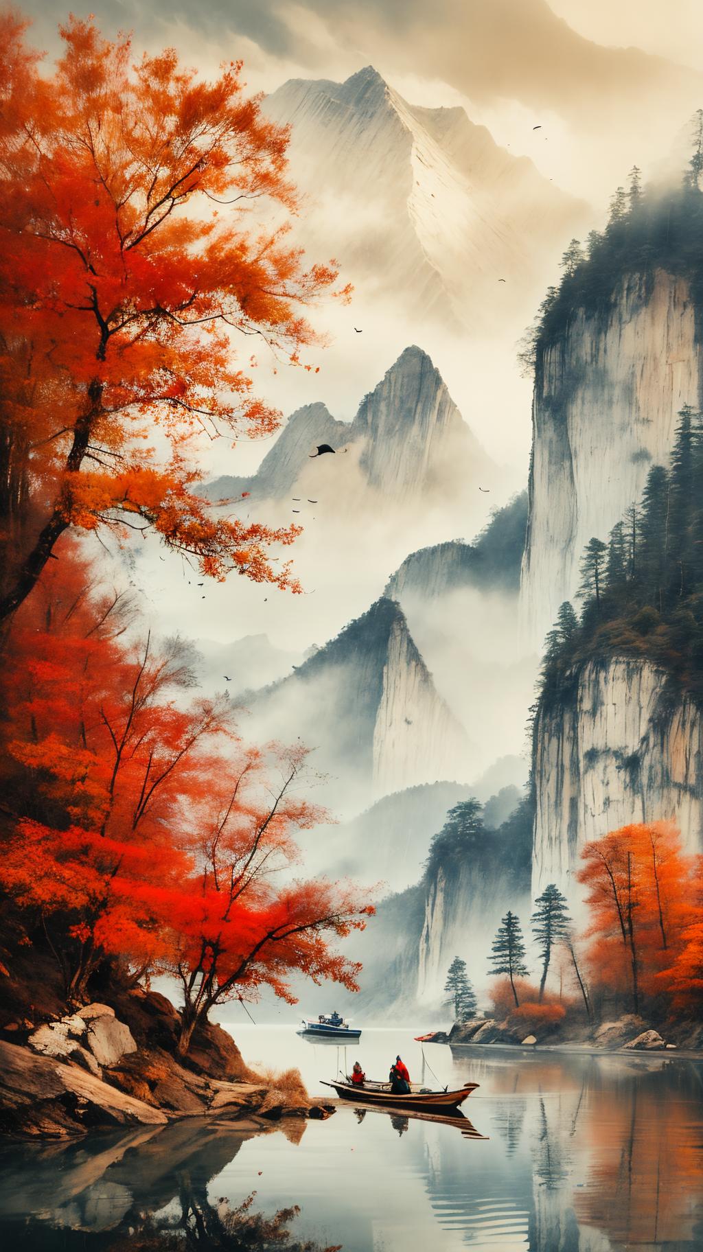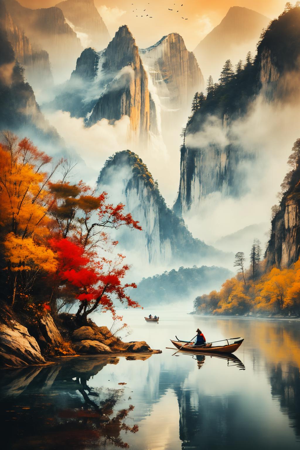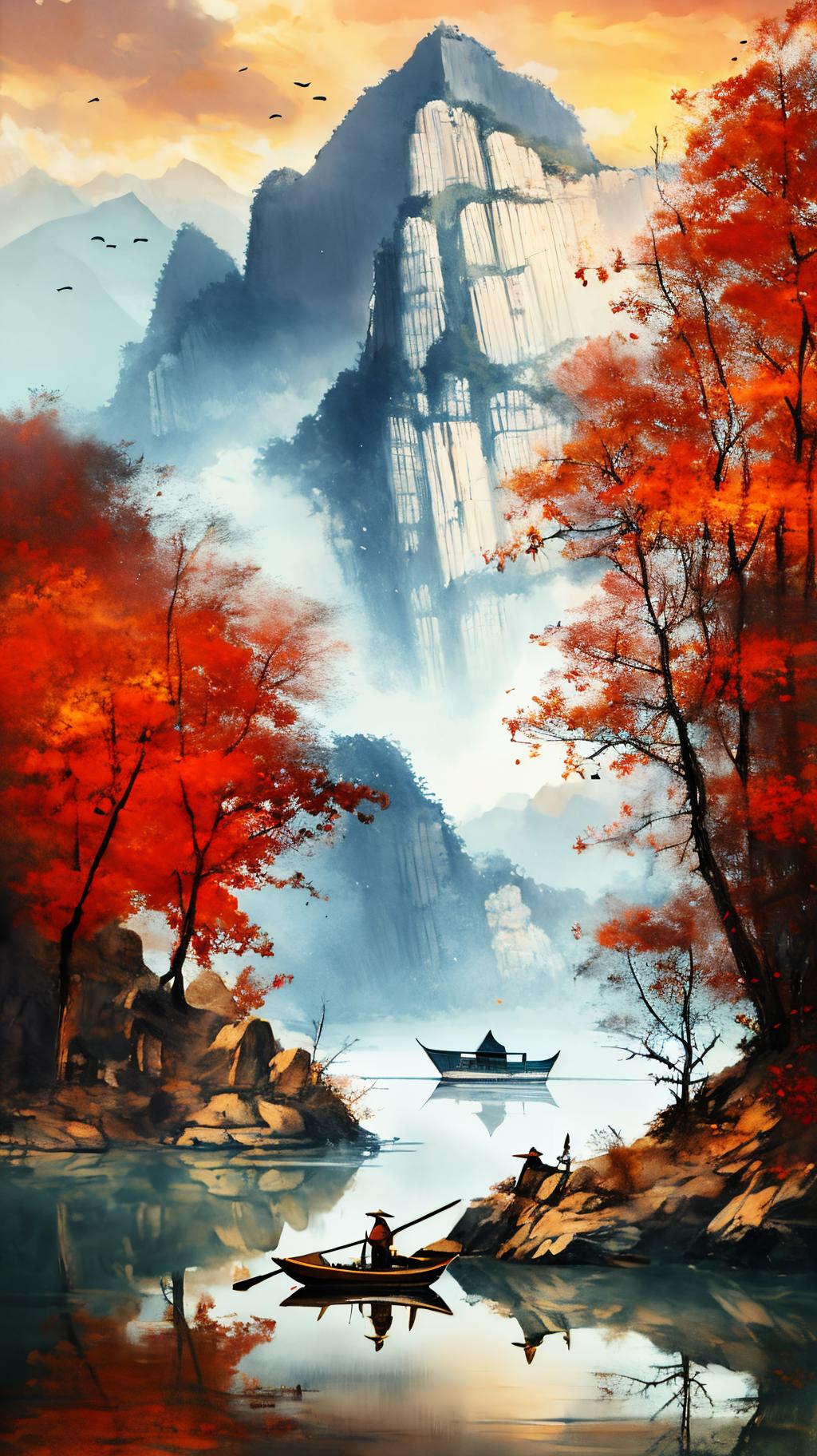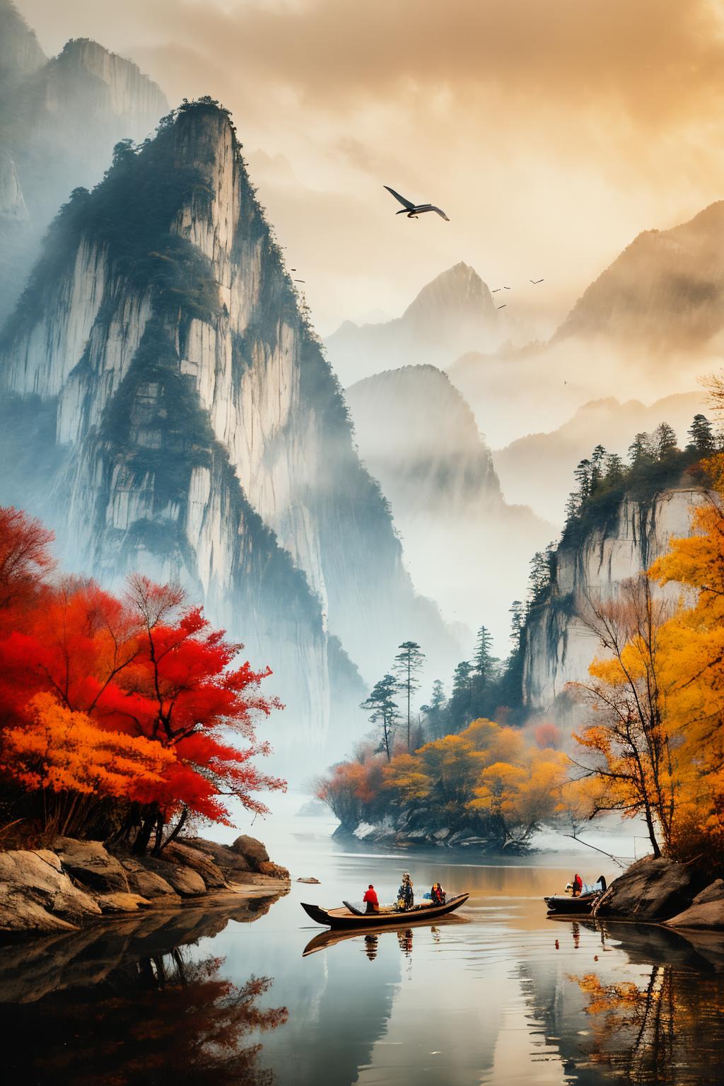 <lora:1.5:0.9>,shan,watercraf11t,boat,bird,tree,scenery,water,lake,mountain,outdoors,reflection,nature,river,