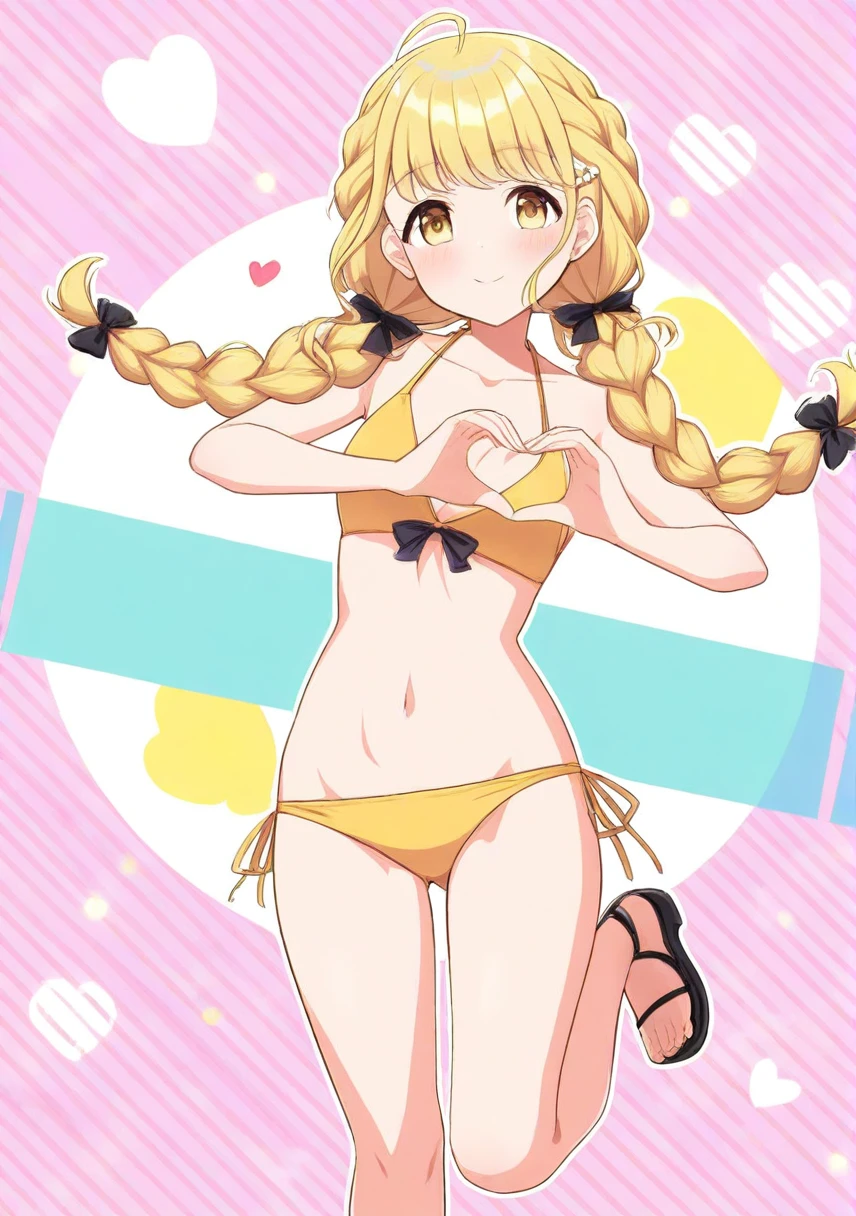 1girl,solo,blonde hair,braid,twin braids,yellow eyes,twintails,low twintails,ahoge,hair bow,black bow,