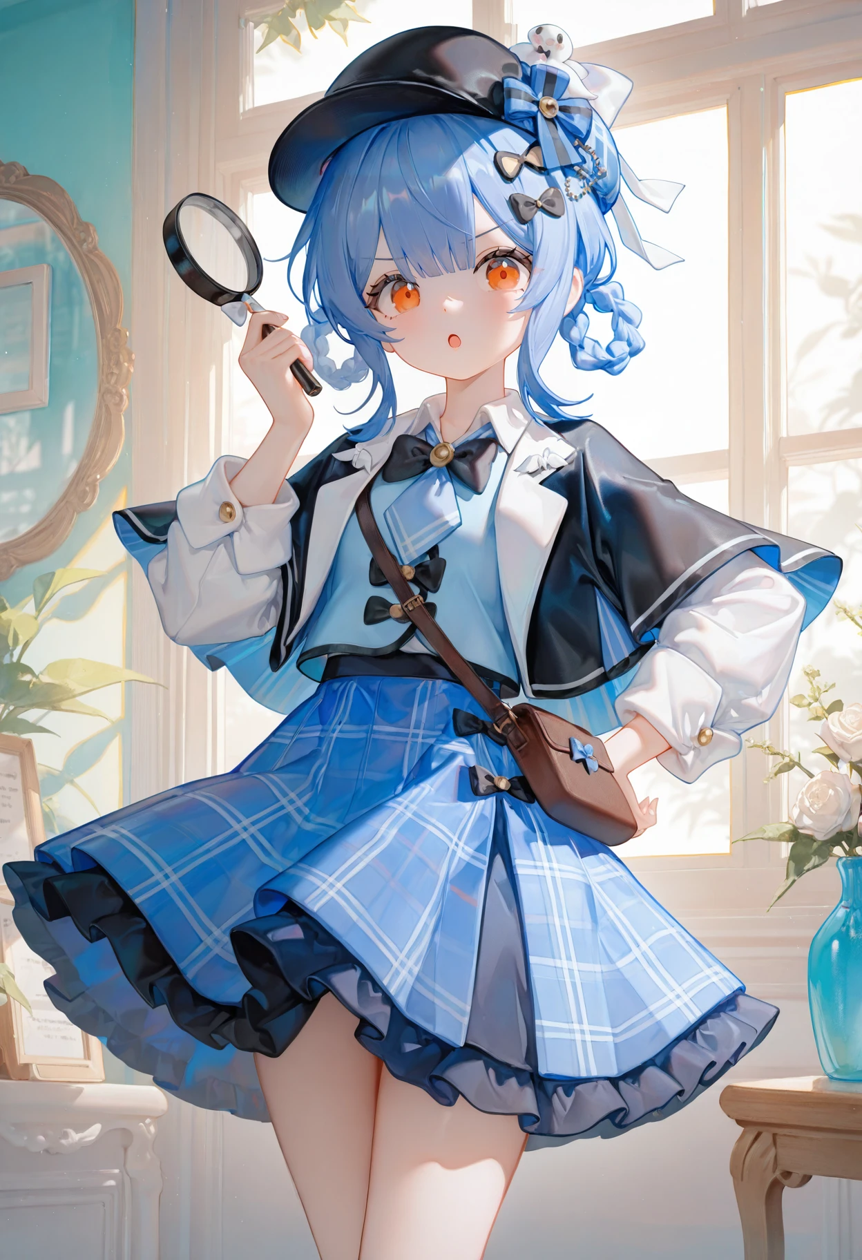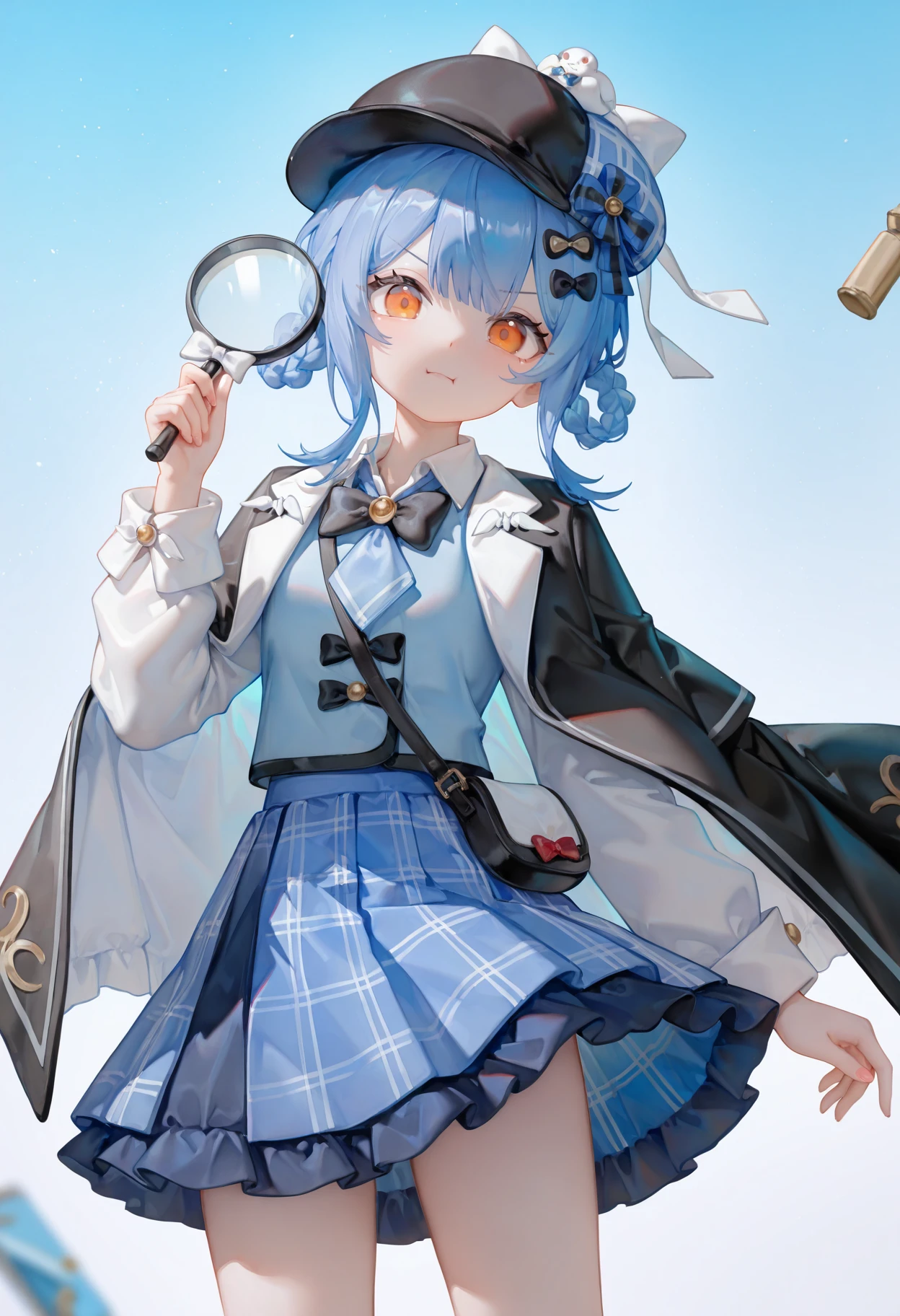 tachibana sherry,1girl,solo,blue hair,skirt,hat,magnifying glass,bow,blue skirt,braid,orange eyes,plaid,如果你喜欢我的lora,欢迎来我的爱发电支持我,也可以定制角色/画风lora(爱发电推送机制有问题,如果没有回复请在c站私信)。闲鱼同名Wenaka_,多平台同名