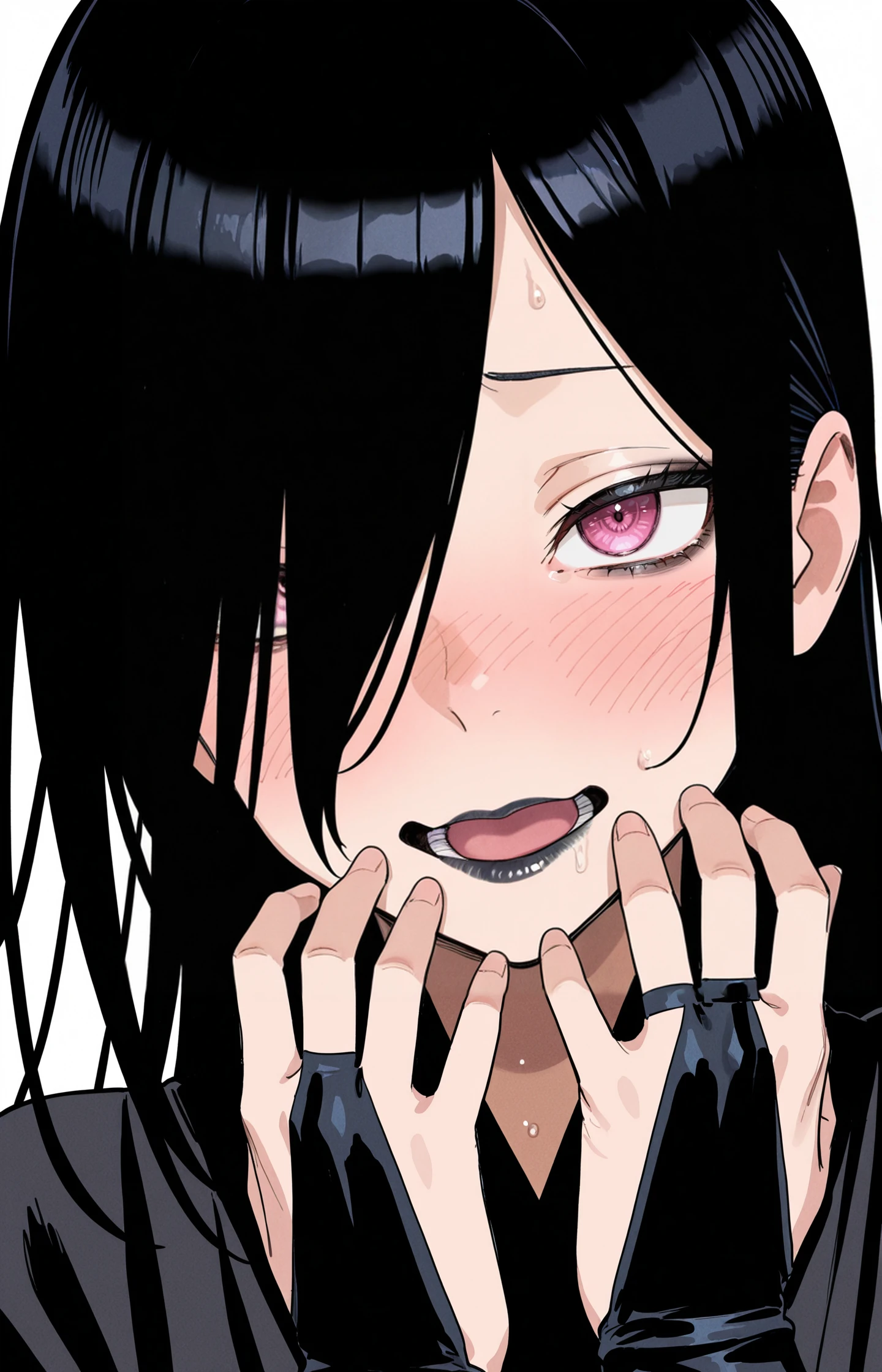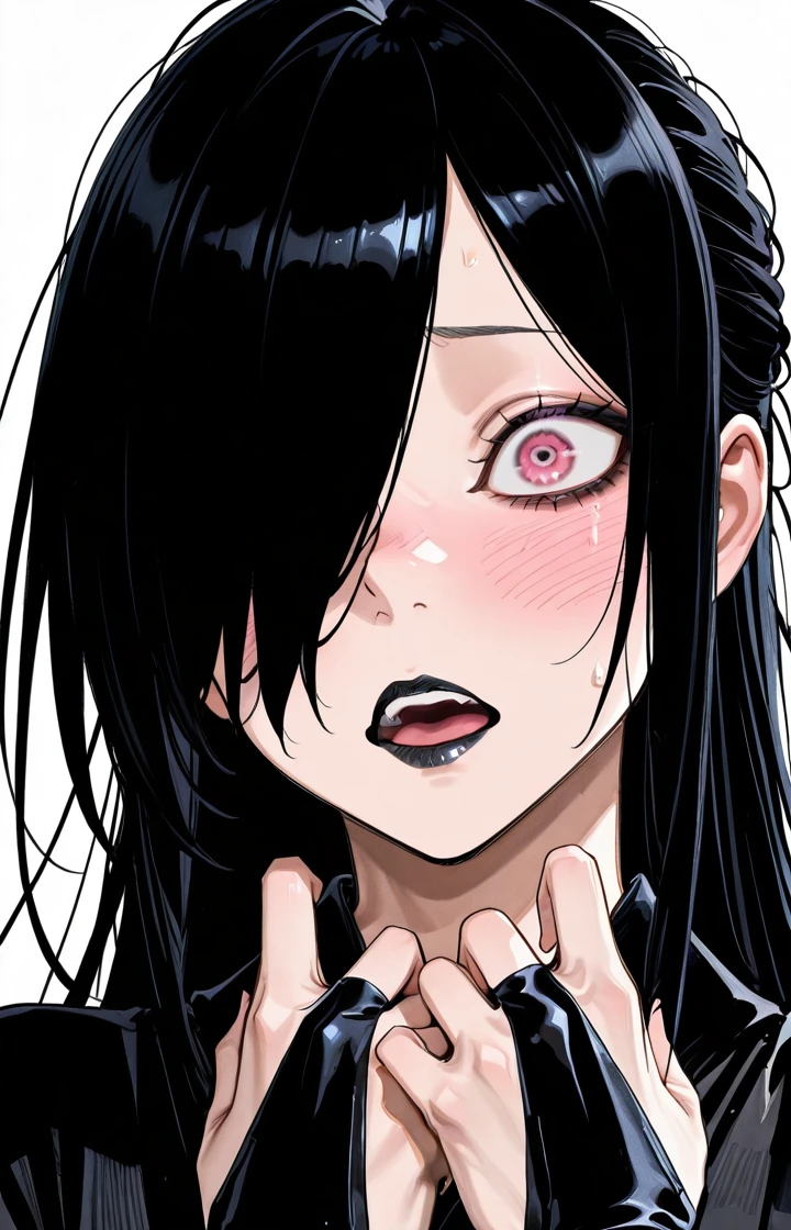 shijahpv1, black hair, long hair, black lipstick, hair over one eye, pink eyes