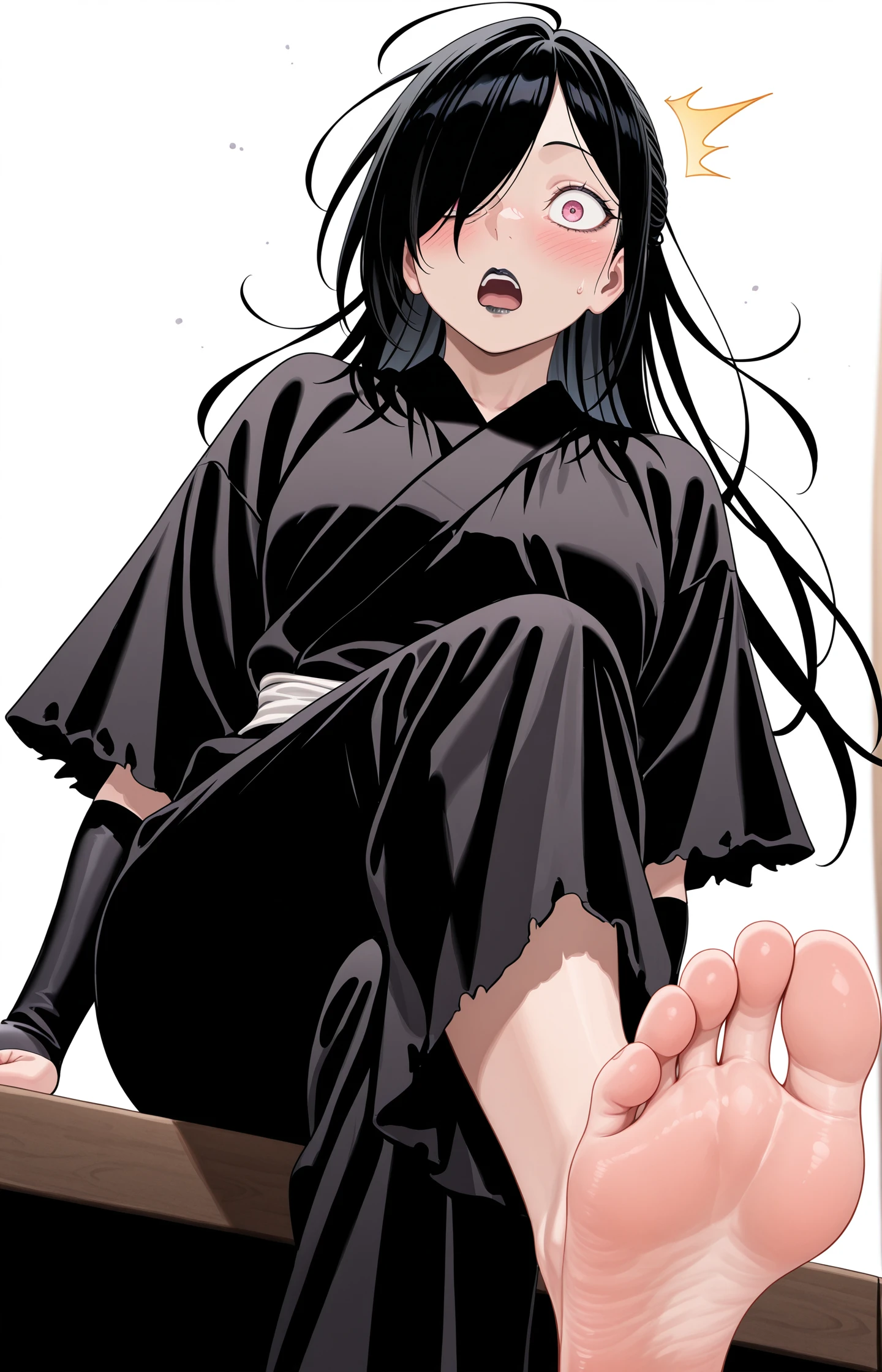 shijahpv1, black hair, long hair, black lipstick, hair over one eye, pink eyes, japanese clothes, black kimono, bridal gauntlets, black pants, sash,sandals, tabi, 1girl