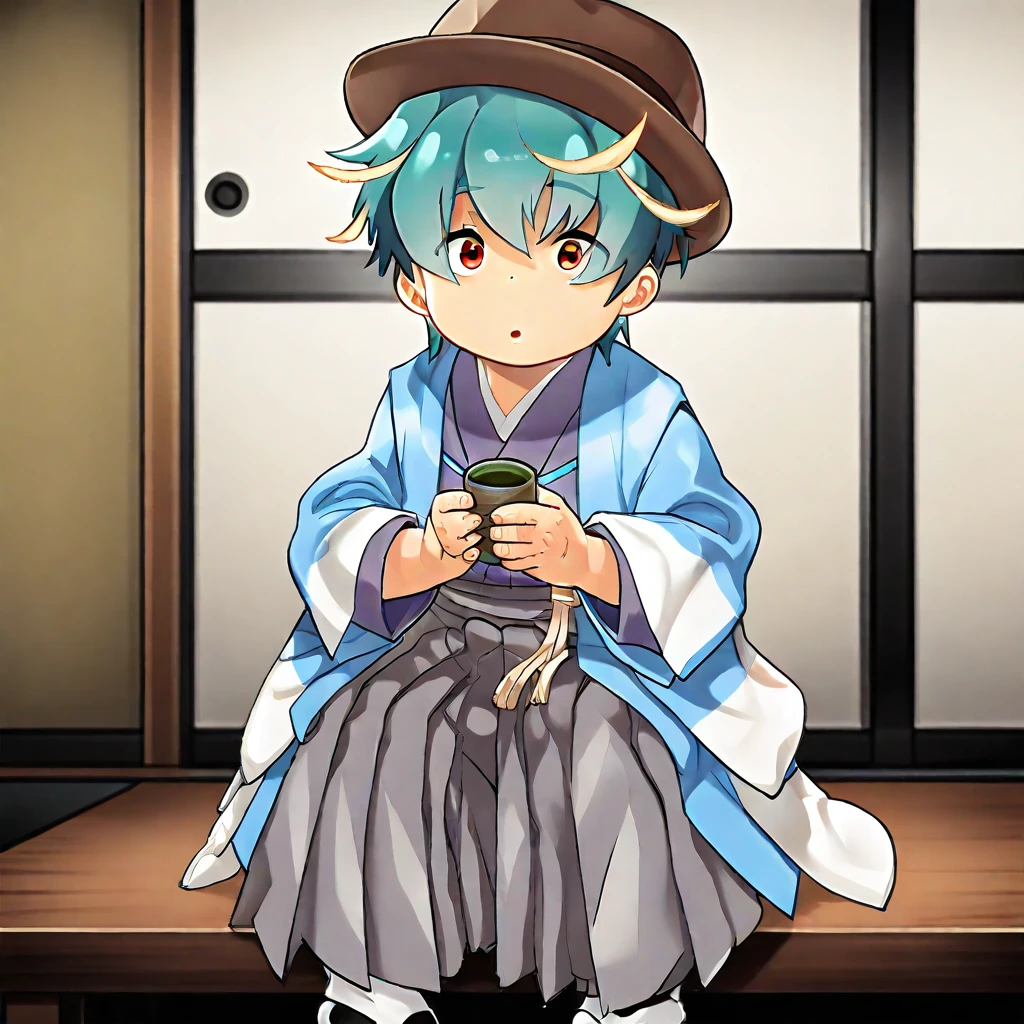 General ???????: 1boy, male focus, solo, young, soft round face, fair skin, short hair, teal hair, layered hair, yellow cowlicks, ahoge, small nose, large expressive eyes, dark red eyes, small mouth