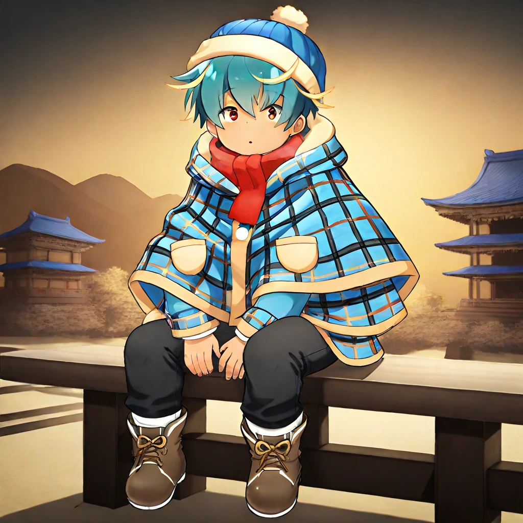 Winter: winter clothing, (blue plaid poncho, tan trim, yellow plaid pattern, duffle coat style, large rounded pockets), red scarf, white undershirt, black pants, (brown winter boots, white soles, tan laces), (blue knit hat, cream trim, beige pom-pom),