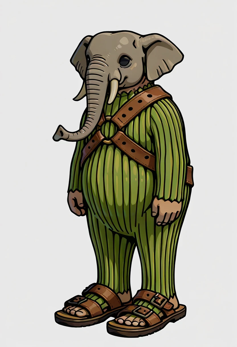LirilìLarilà, 1boy, gray elephant head with a long trunk, green cactus for body with vertical ridges, brown leather sandals with two buckle straps, imaginative and absurdist design, black eyes, chubby