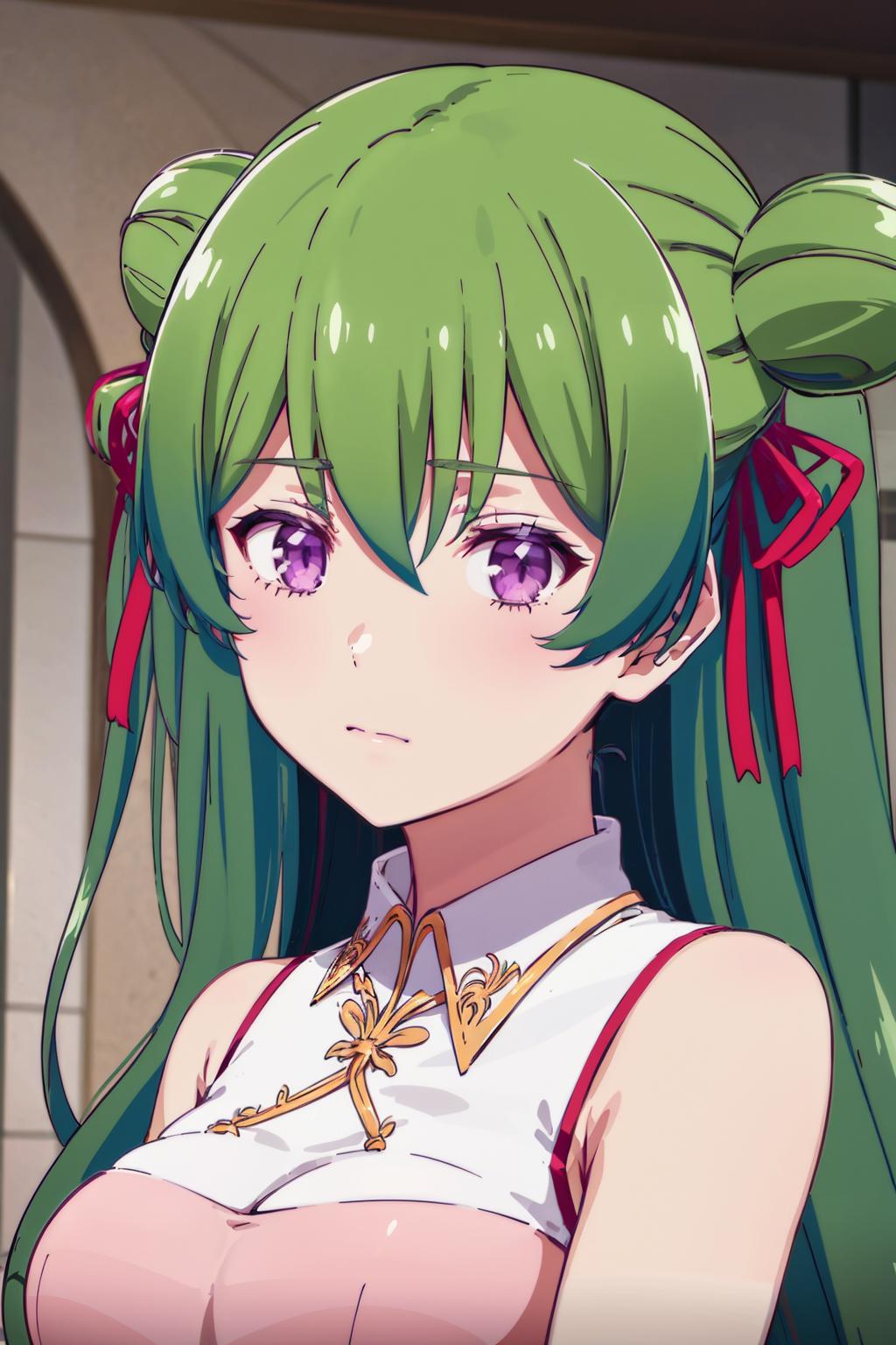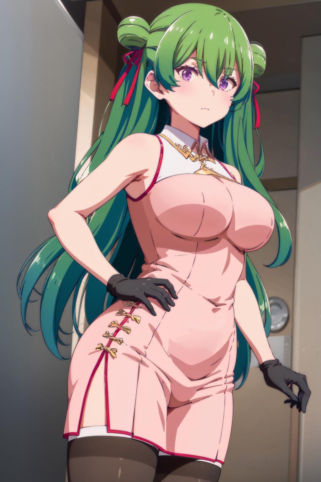 trigger words for her default outfits ; pink dress,chinease dress,ribbon,bare shoulders,black thighhighs,green hair,purple eyes
