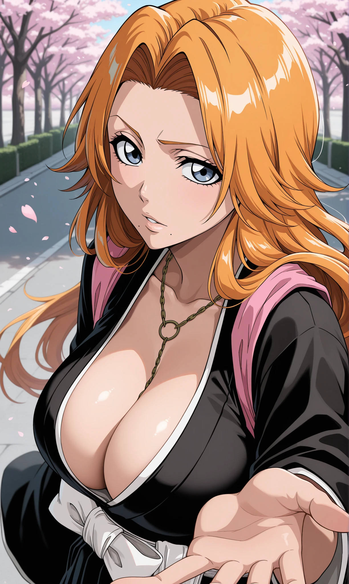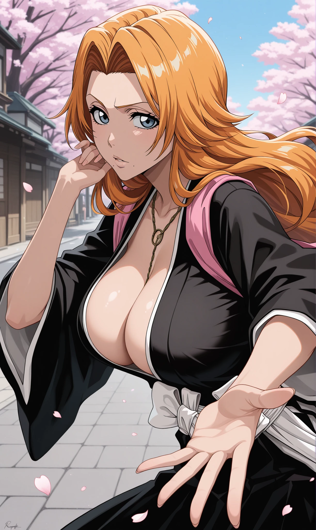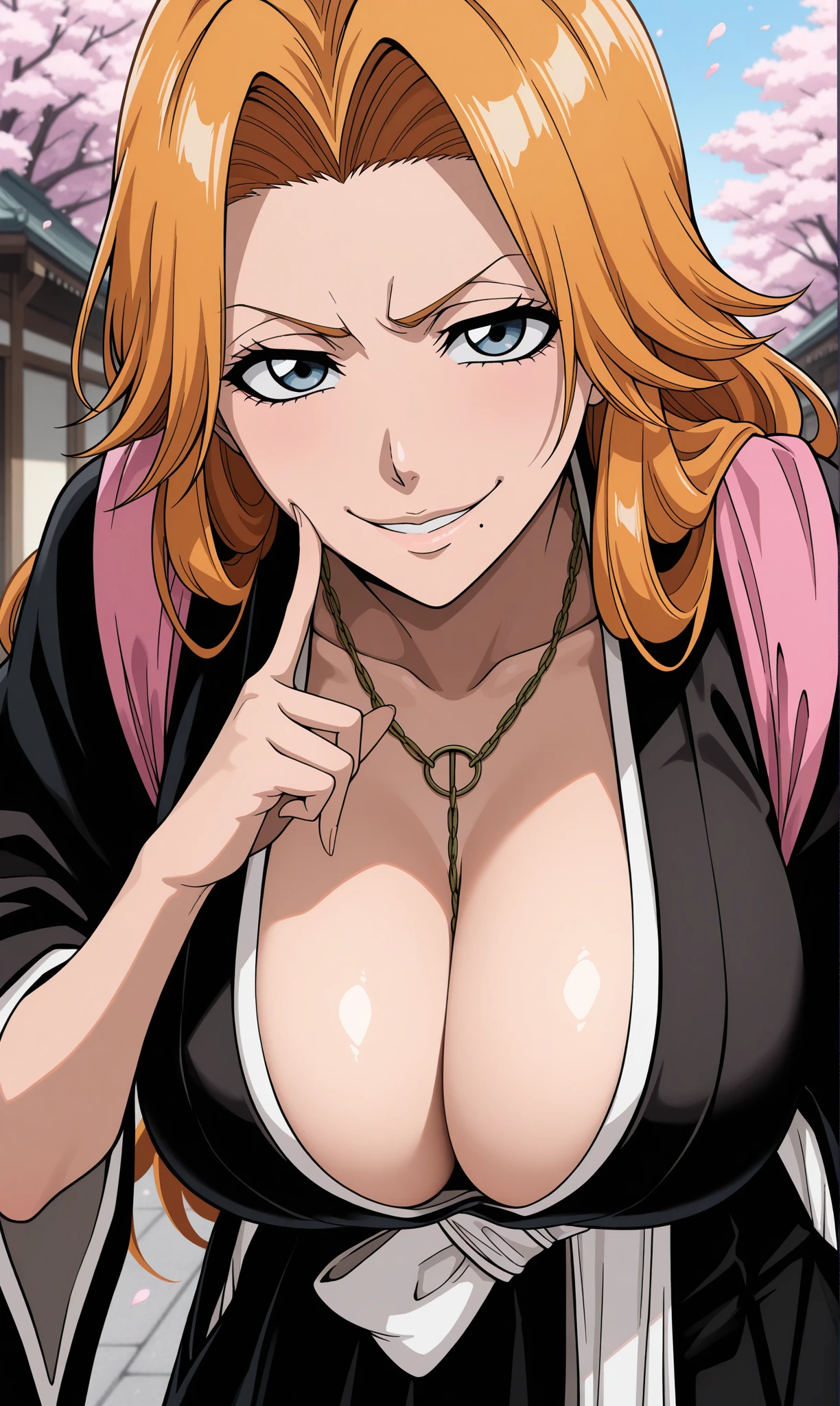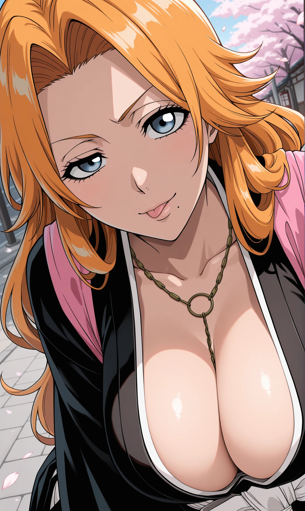matsumoto rangiku, orange hair, parted bangs, long hair, blue eyes, mole under mouth, necklace, bleach style๐ข๐๐๐ณ๐ถ๐: