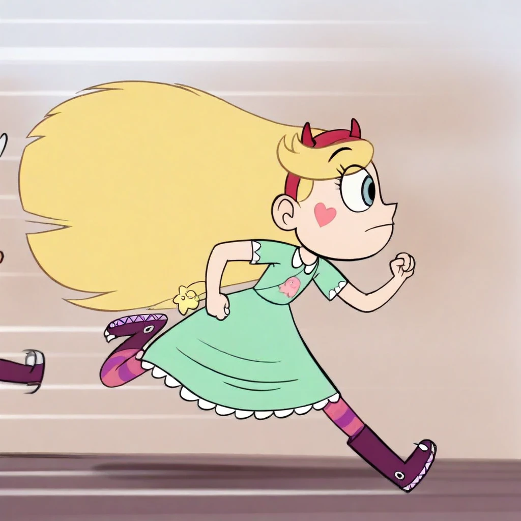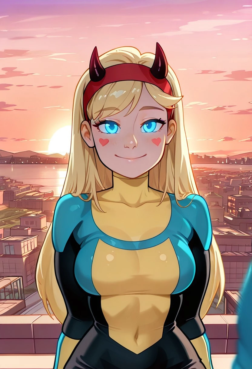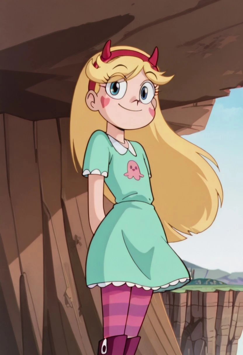 starbb, 1girl, long hair, blonde hair, red headband, little demon horns on headband, blue eyes, heart cheek marks, teal collared dress, short puff sleeves, lace trim hem, striped tights, pink and purple striped pantyhose, violet boots, eye design on boots, horn on boots, calarts art style, cartoon style,