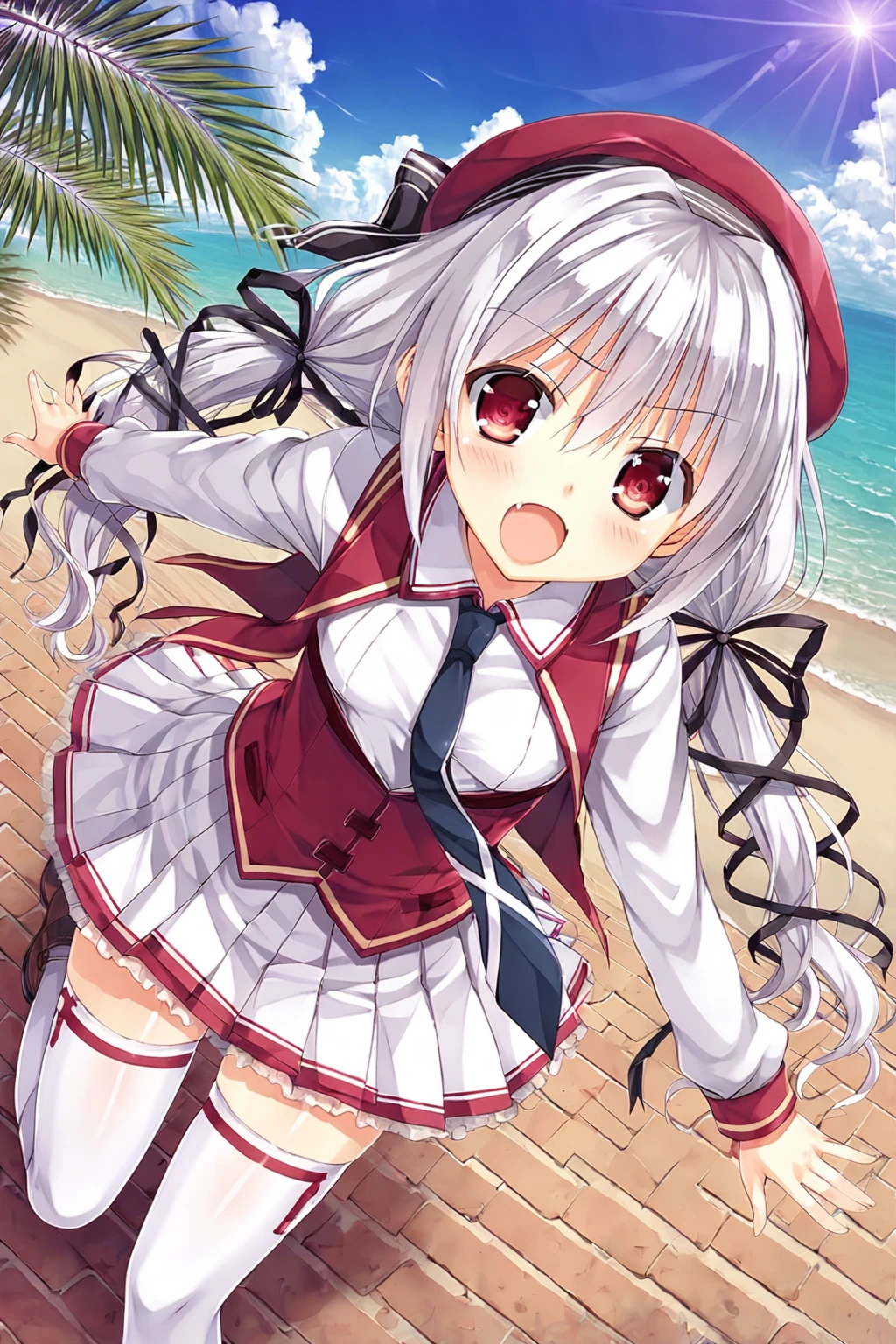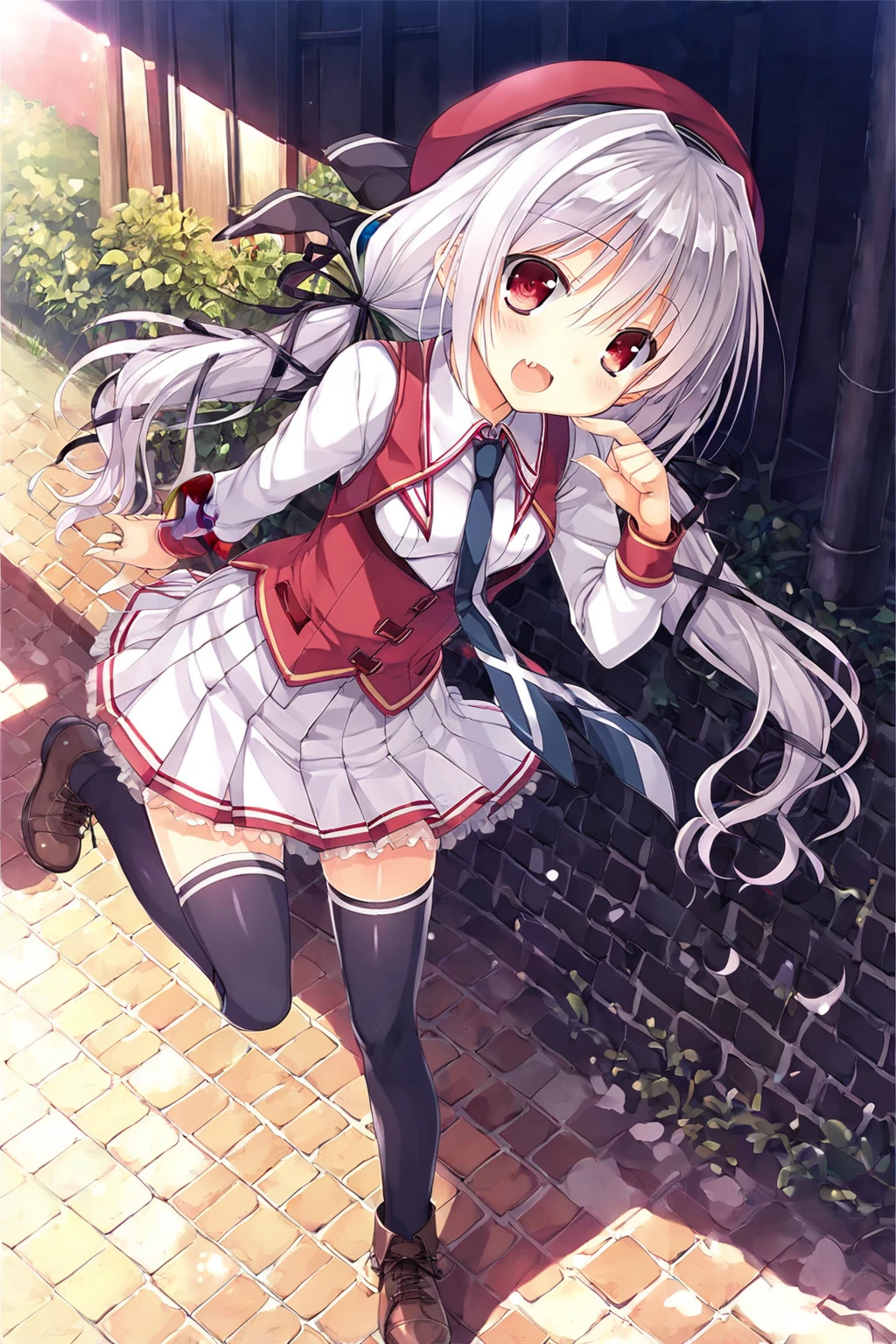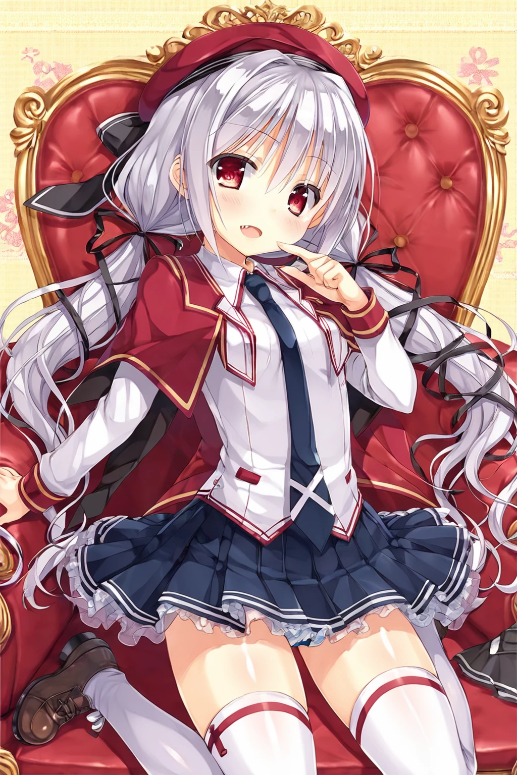 necktie,thighhighs,skirt,hat,blue necktie,bangs,frills,ribbon,shirt,pleated skirt,black ribbonvest,shoes,white shirt,collared shirt,white skirt,miniskirt,beret,frilled skirt,red headwear,twintails,
