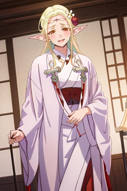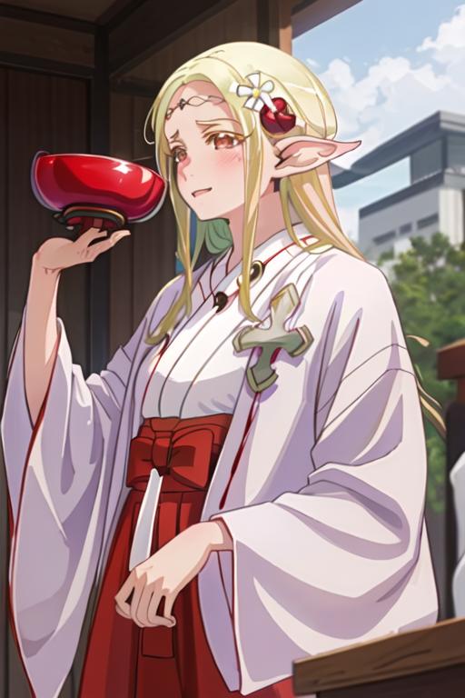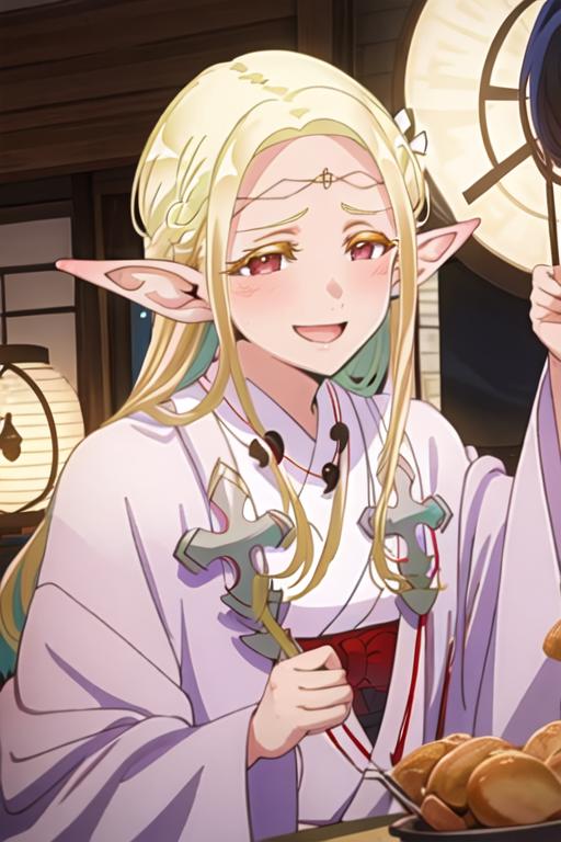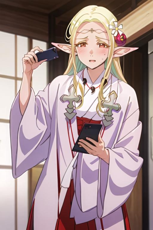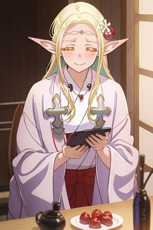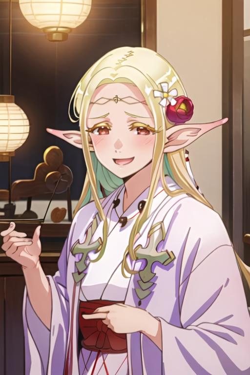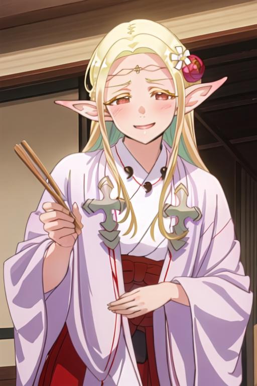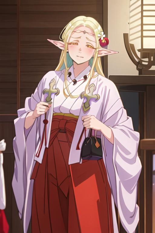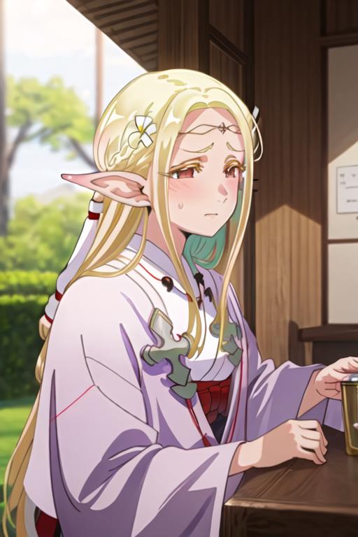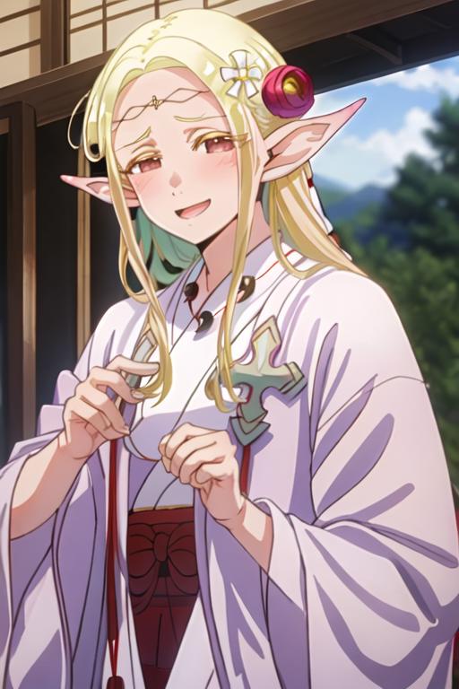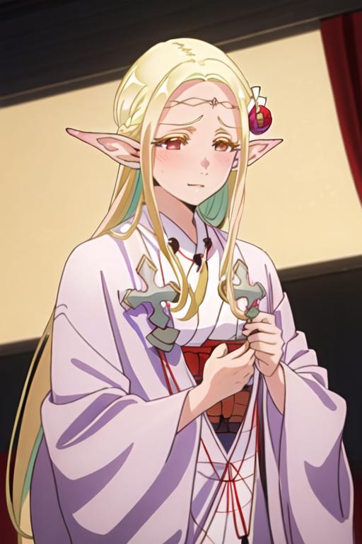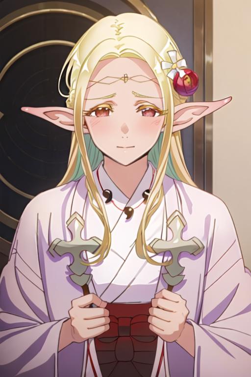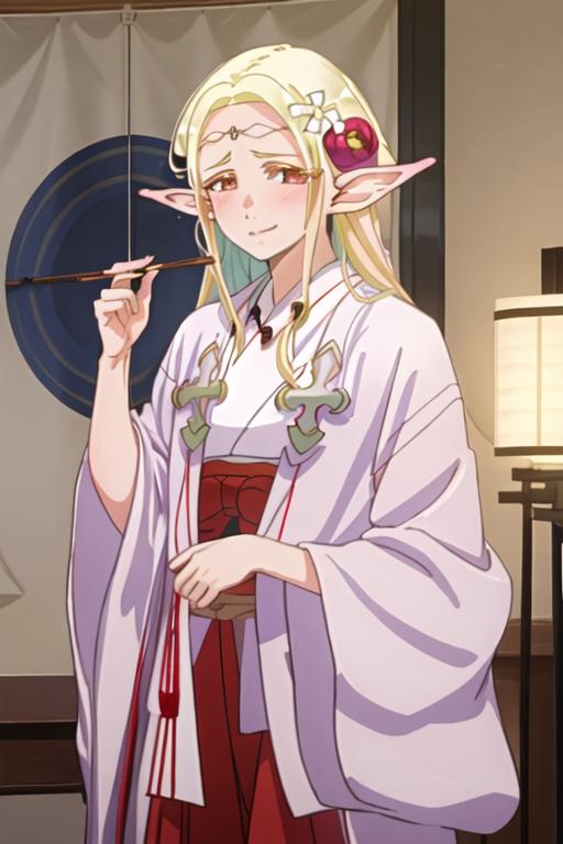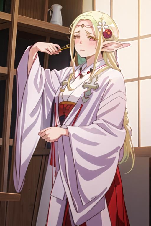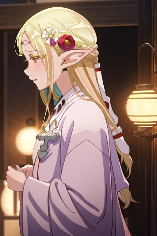 The trigger word is eruda_edomaeelf, and the recommended tags are best quality, masterpiece, highres, solo, {eruda_edomaeelf:1.15}, blonde_hair, pointy_ears, long_hair, elf, blush, circlet, hair_ornament, flower, hair_flower, red_eyes.