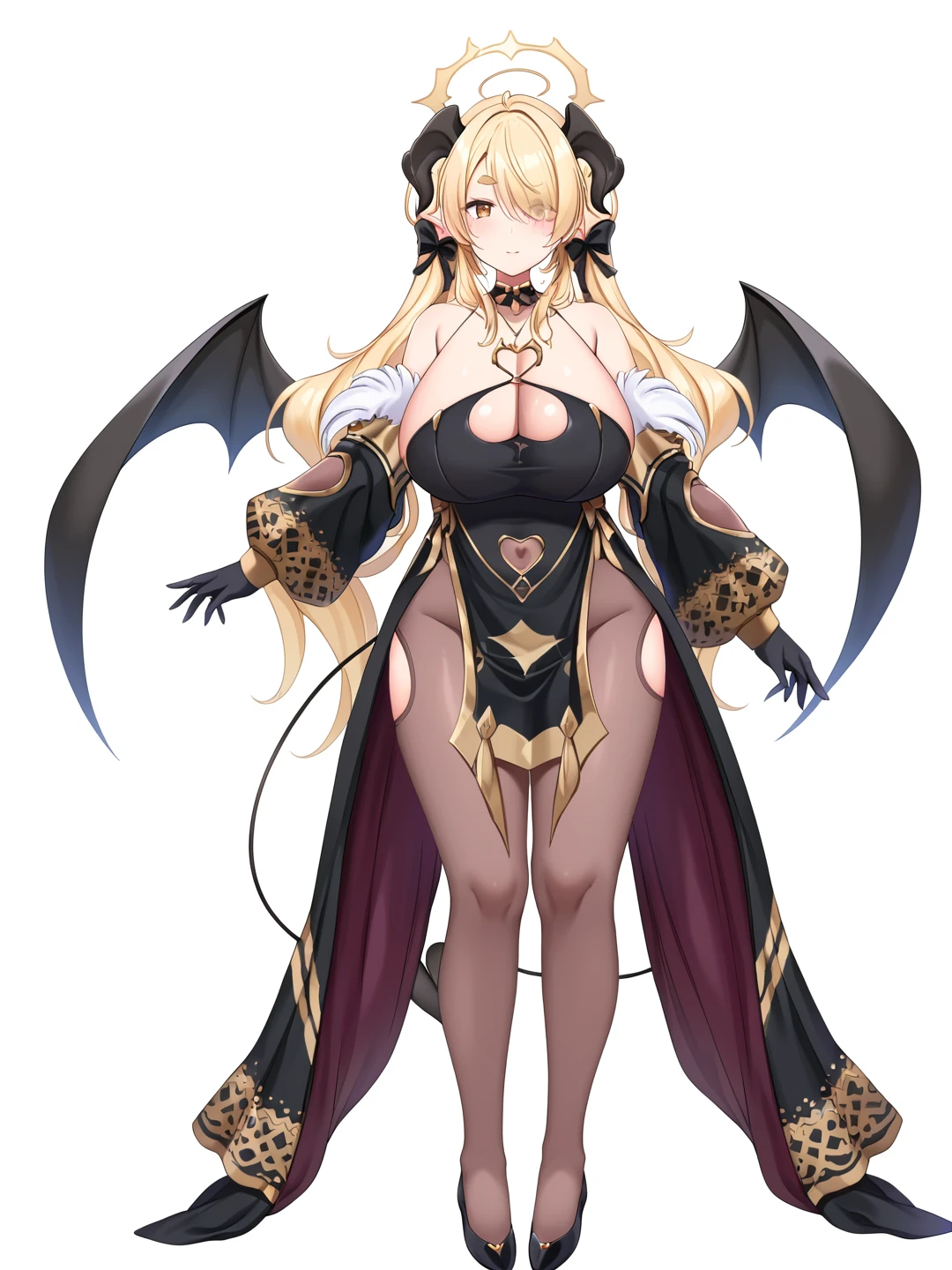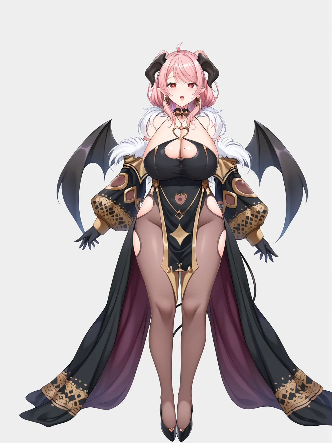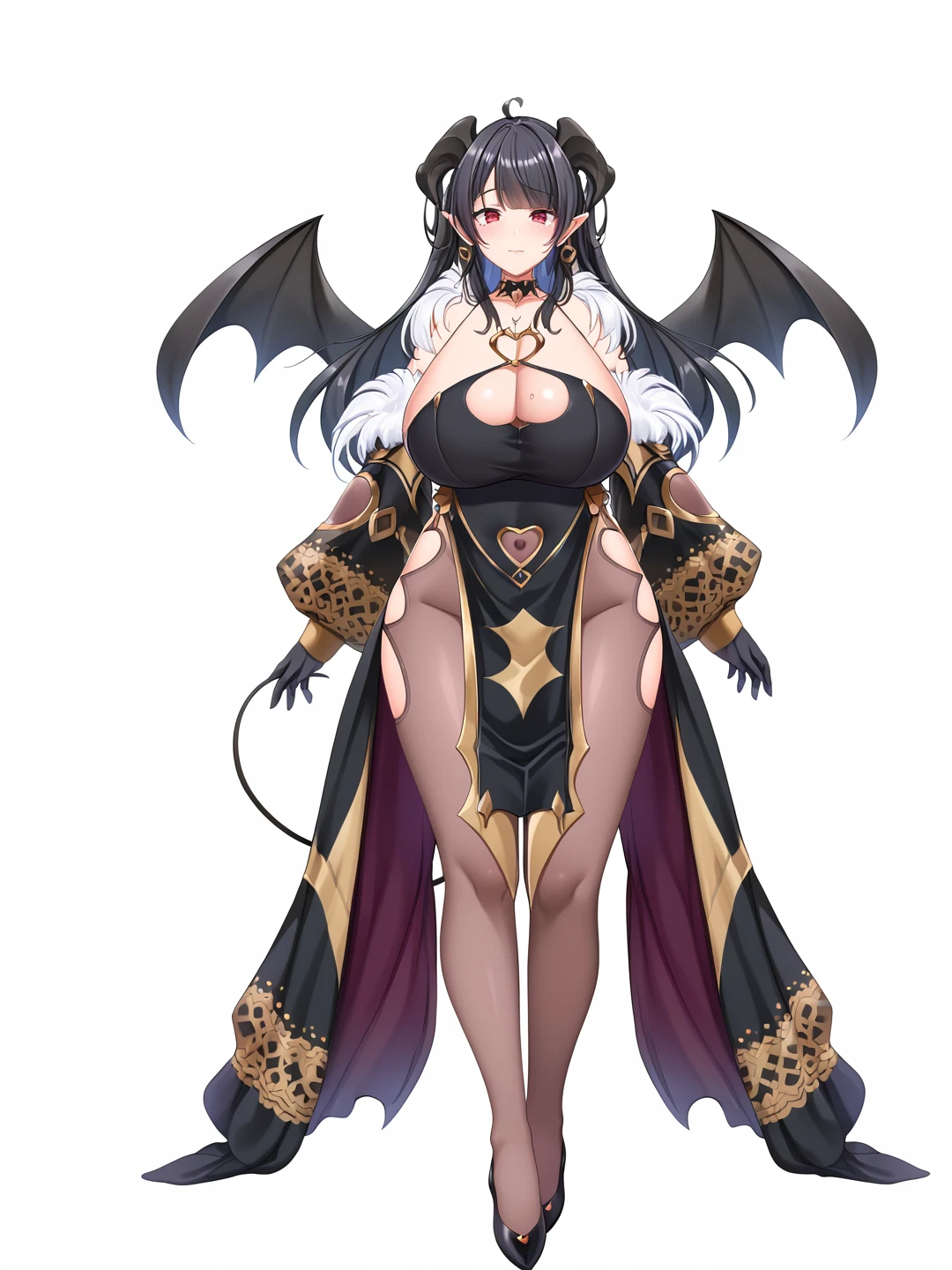succubus_heart,1girl, solo, gloves, long sleeves,dress, navel, cleavage, bare shoulders, tail, pantyhose, thighs, detached sleeves, wings, horns, black gloves, black footwear, mole, huge breasts, black dress, high heels, fur trim, clothing cutout, cleavage cutout, demon girl, animal print, demon horns, demon tail, pelvic curtain, black wings, demon wings, mole on breast, brown pantyhose, low wings, navel cutout, heart cutout
