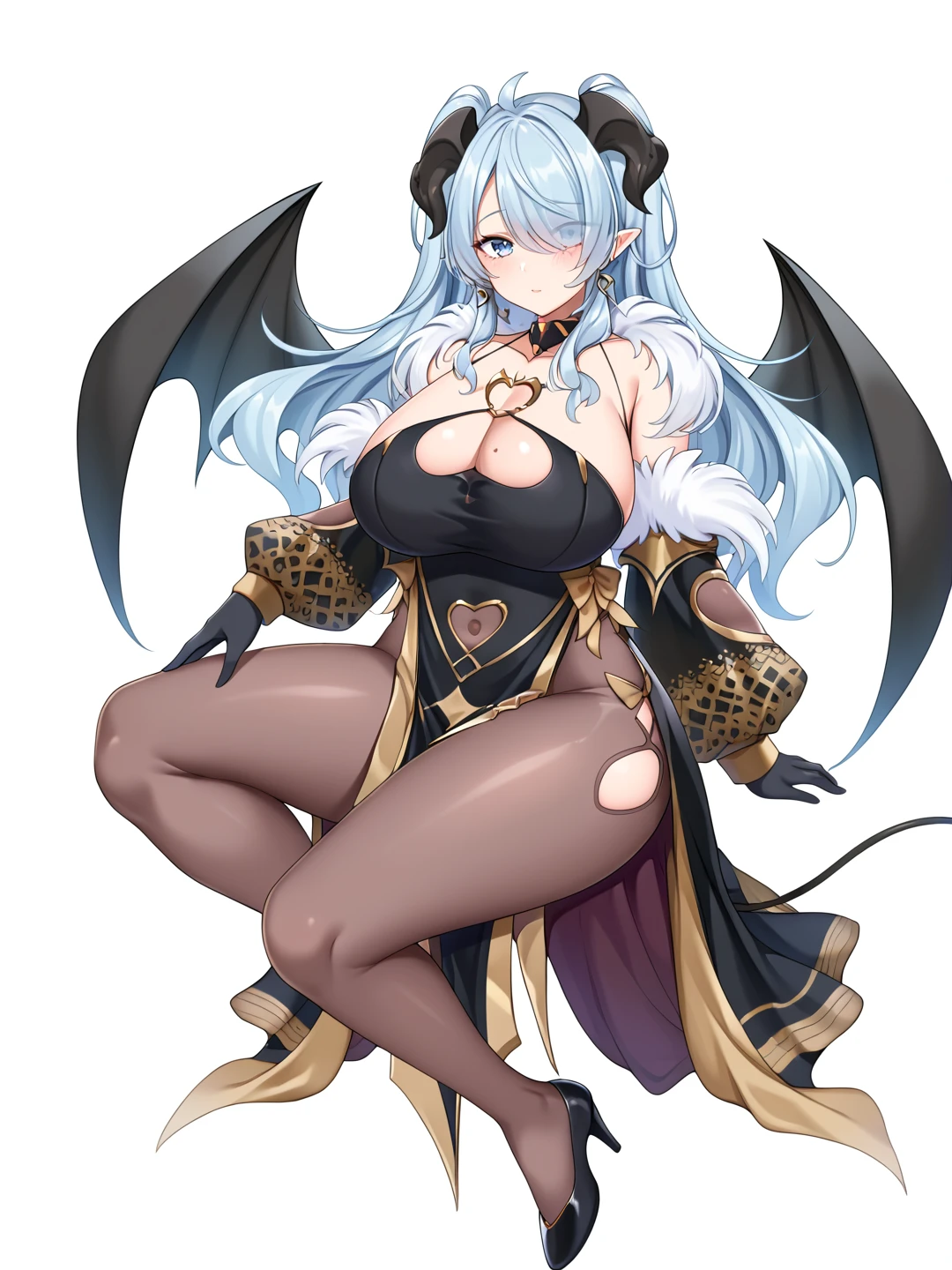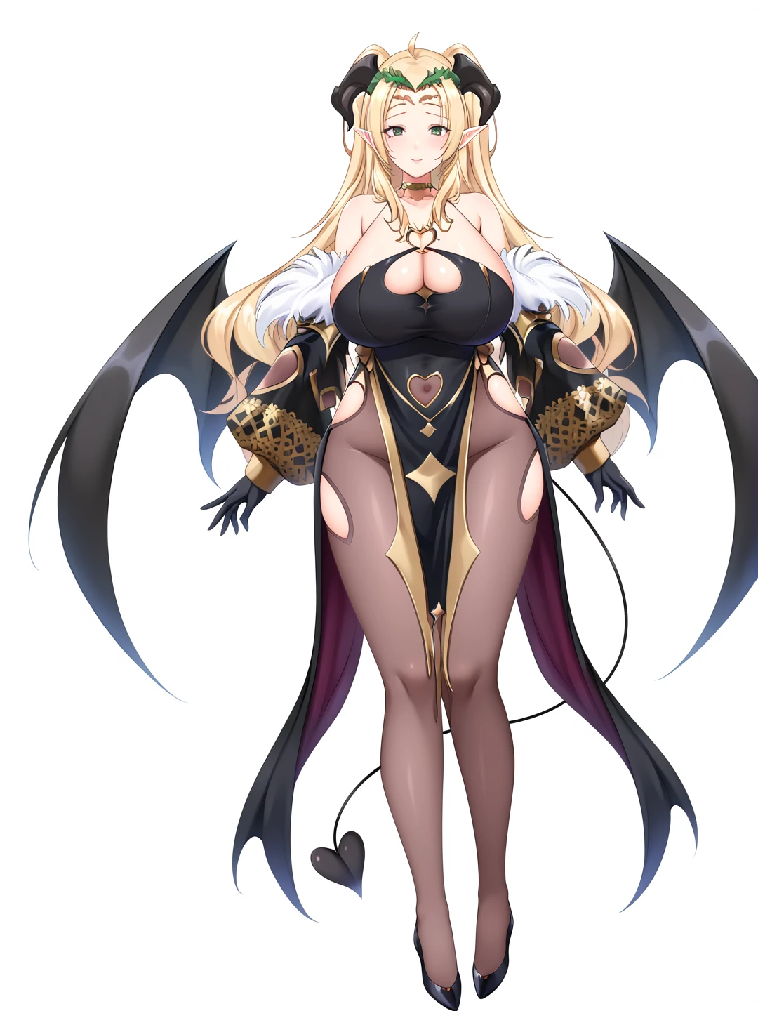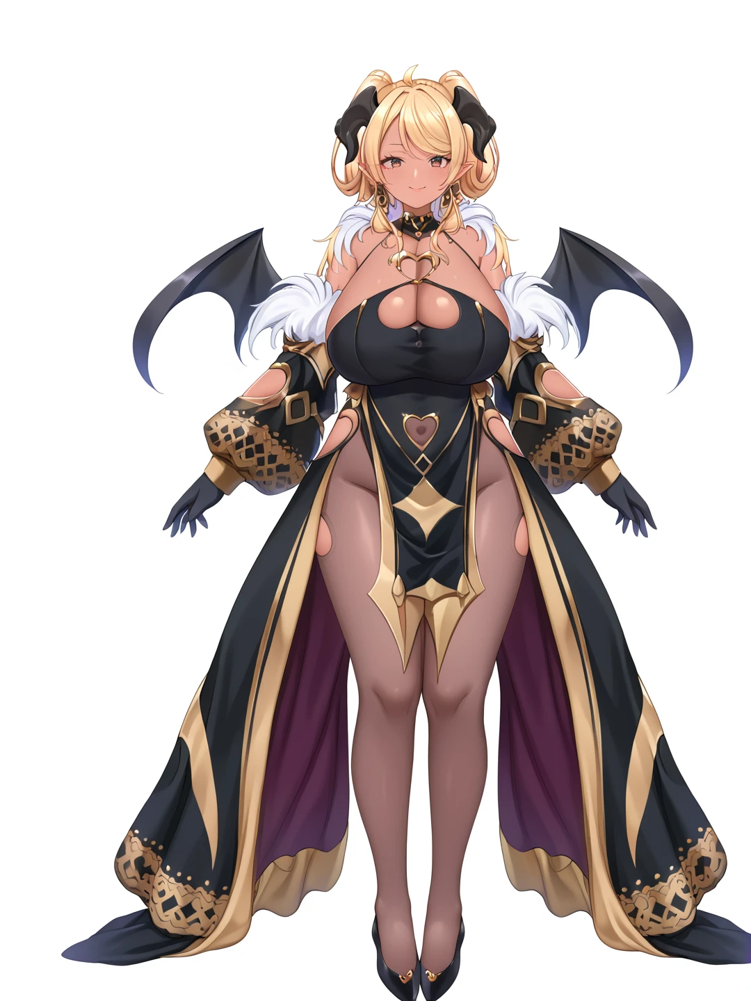succubus_heart,1girl, solo, gloves, long sleeves,dress, navel, cleavage, bare shoulders, tail, pantyhose, thighs, detached sleeves, wings, horns, black gloves, black footwear, mole, huge breasts, black dress, high heels, fur trim, clothing cutout, cleavage cutout, demon girl, animal print, demon horns, demon tail, pelvic curtain, black wings, demon wings, mole on breast, brown pantyhose, low wings, navel cutout, heart cutout