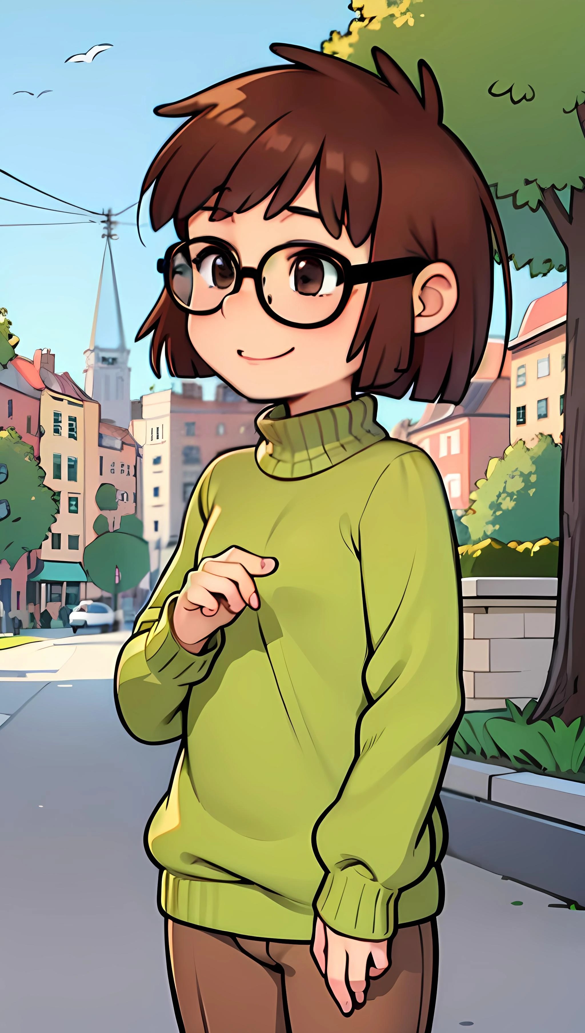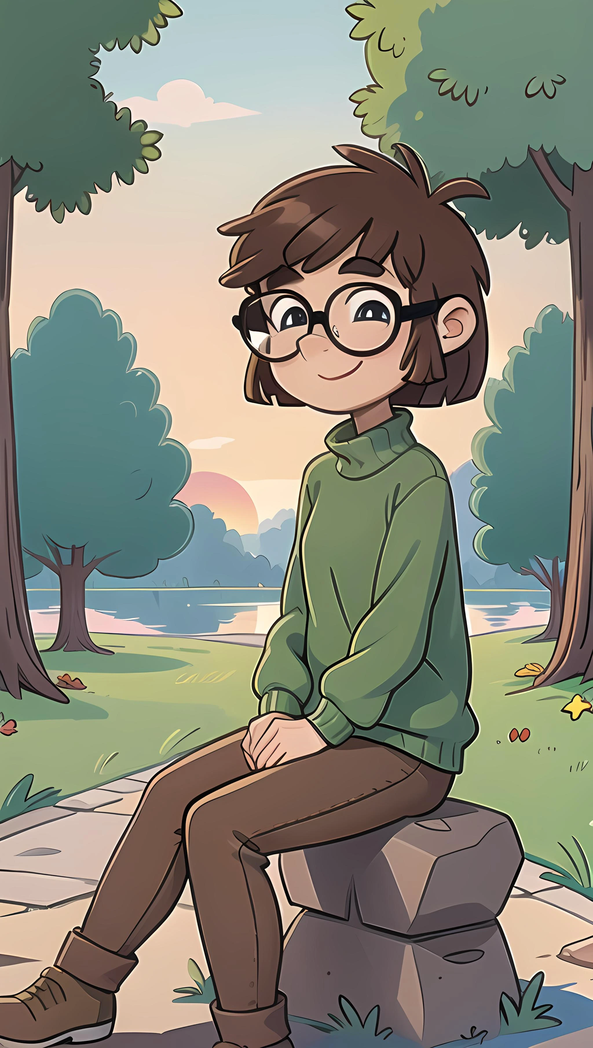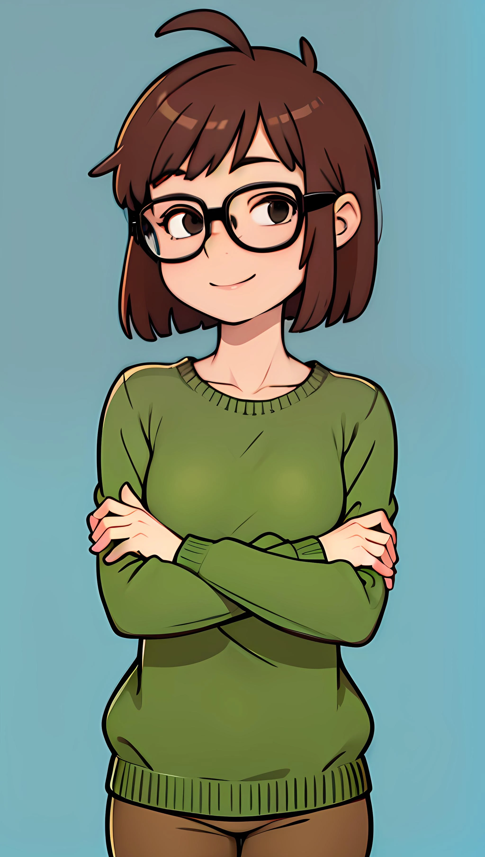 Brown Hair, Thick Black Glasses, short hair, antenna hair, Green Sweater, Brown Pants,