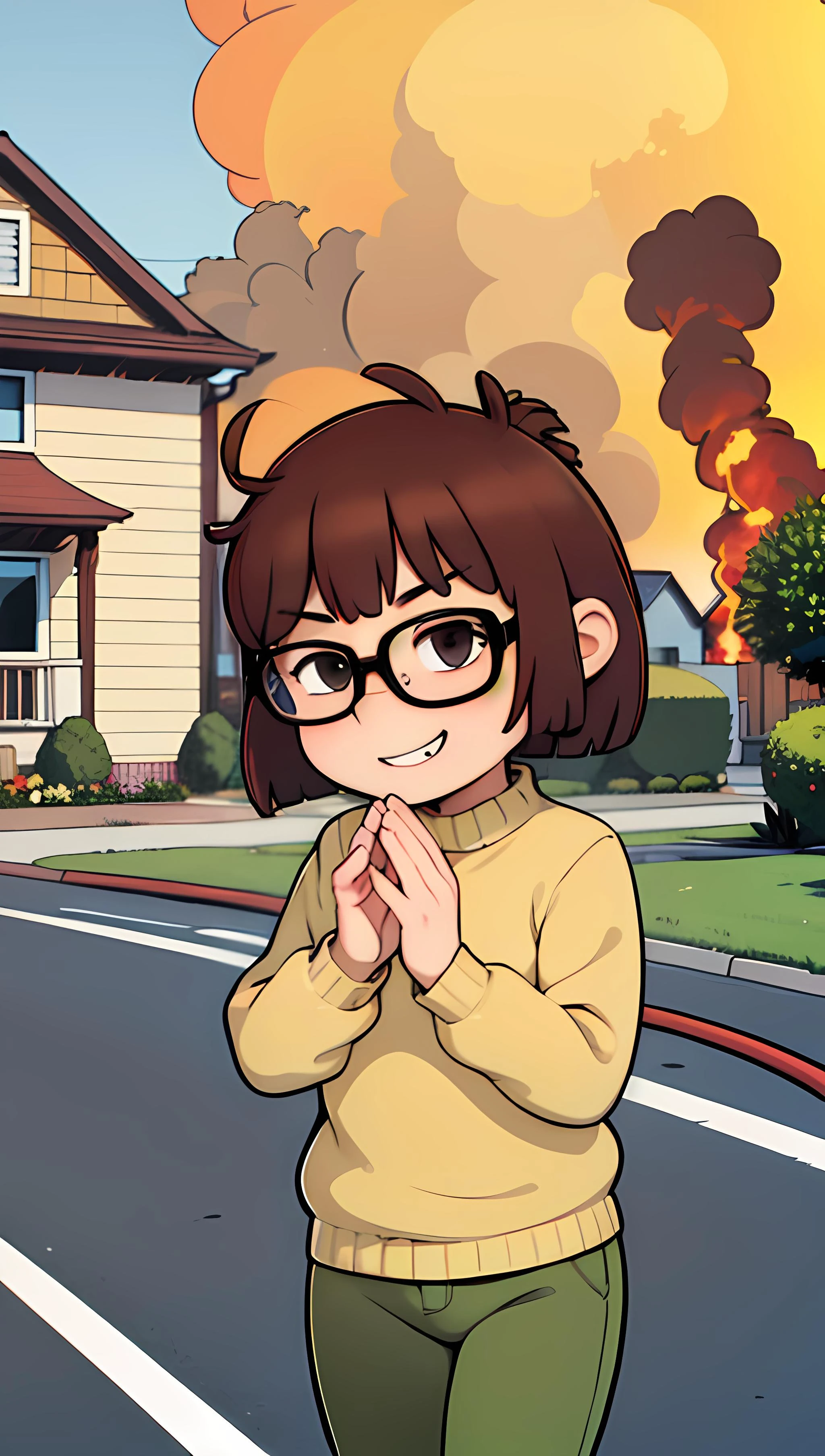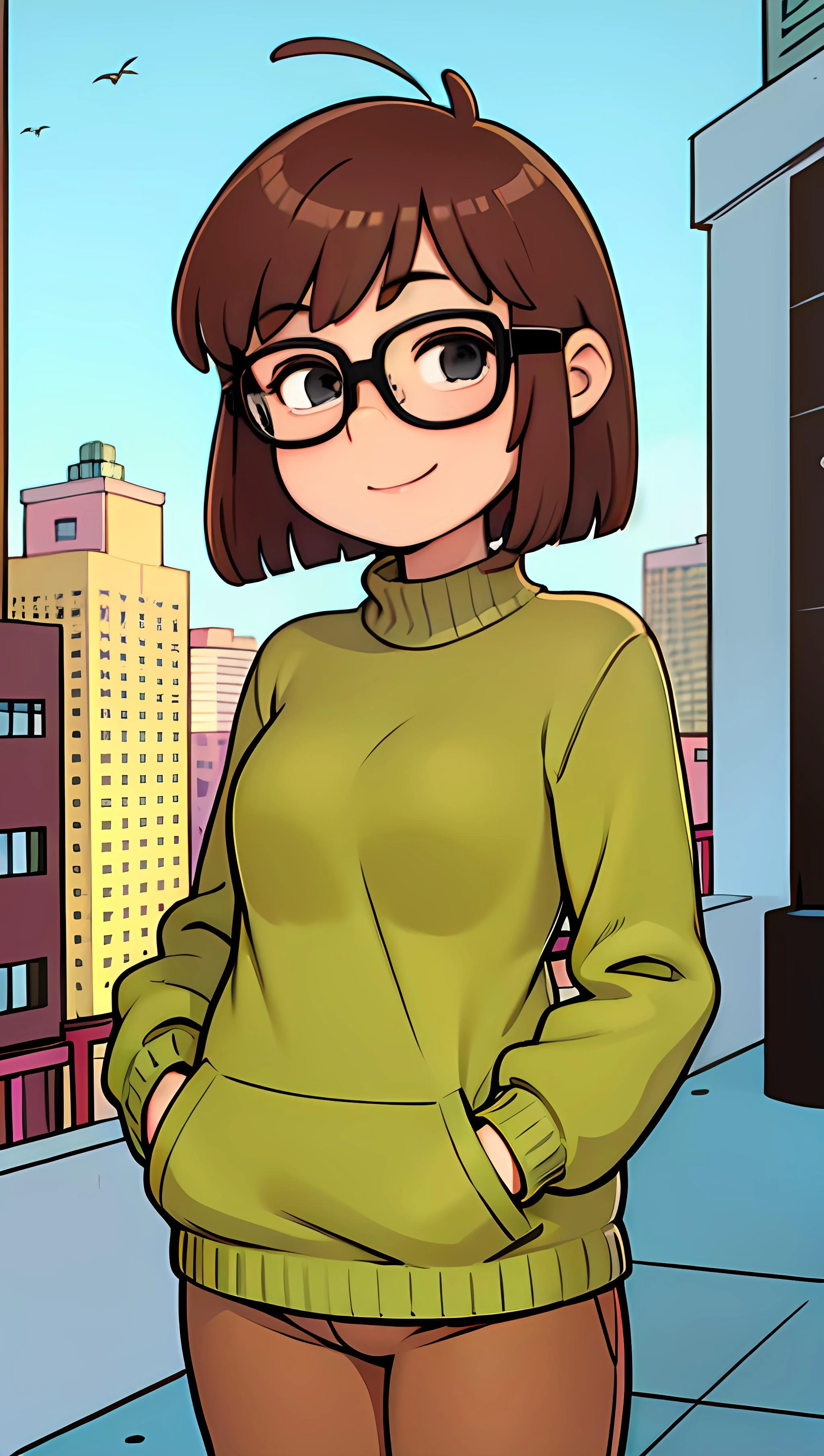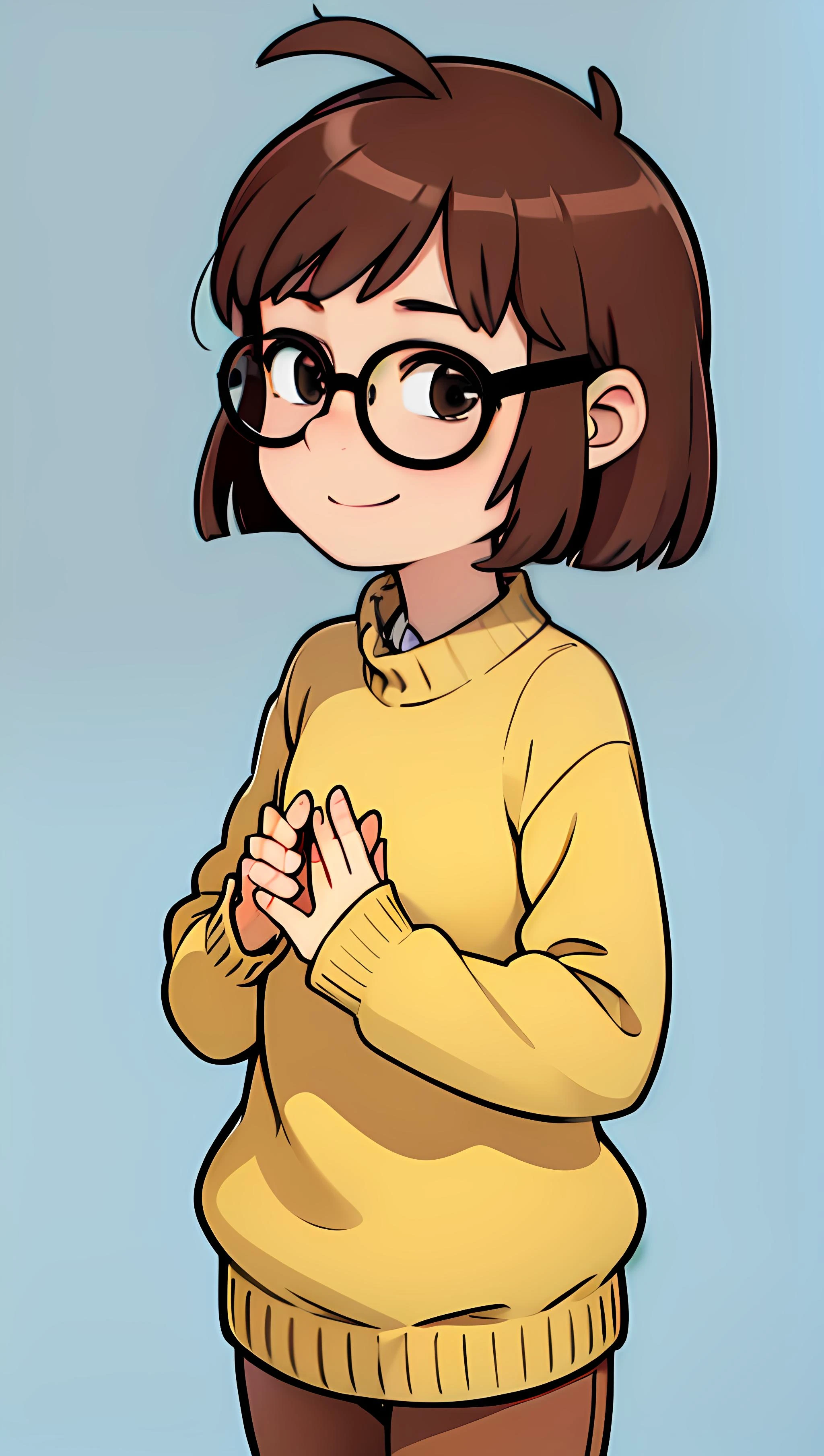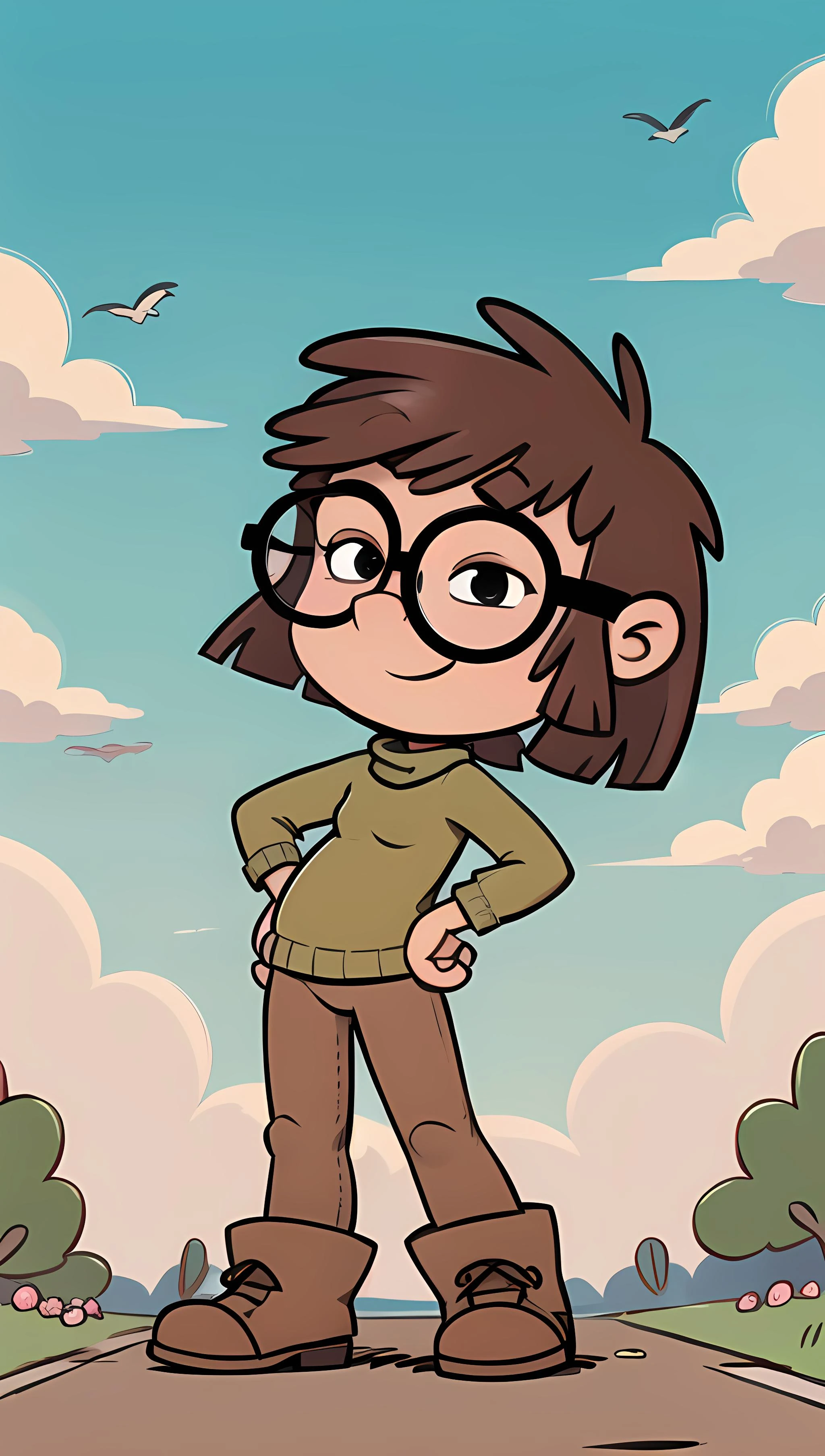 Brown Hair, Thick Black Glasses, short hair, antenna hair, Green Sweater, Brown Pants,