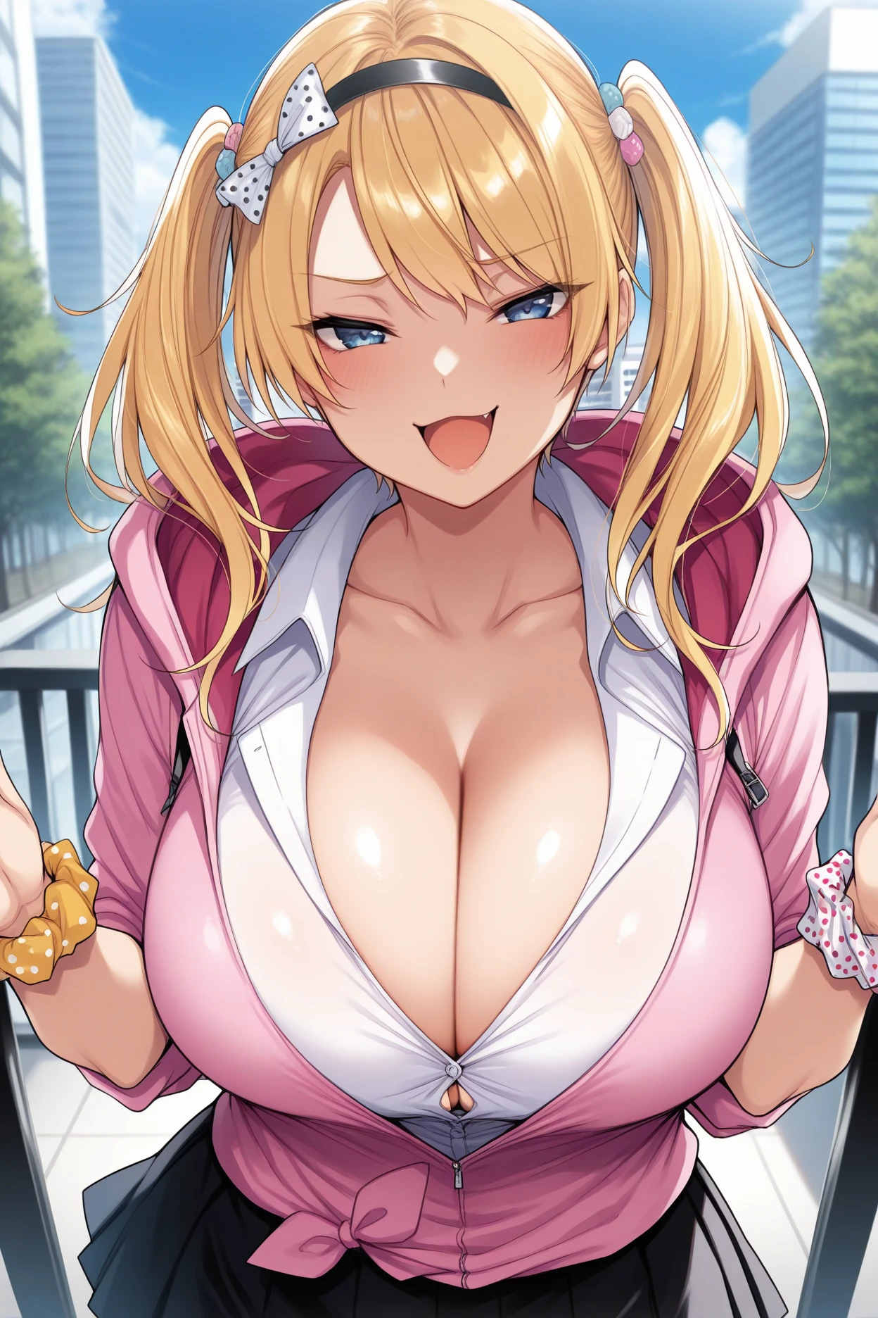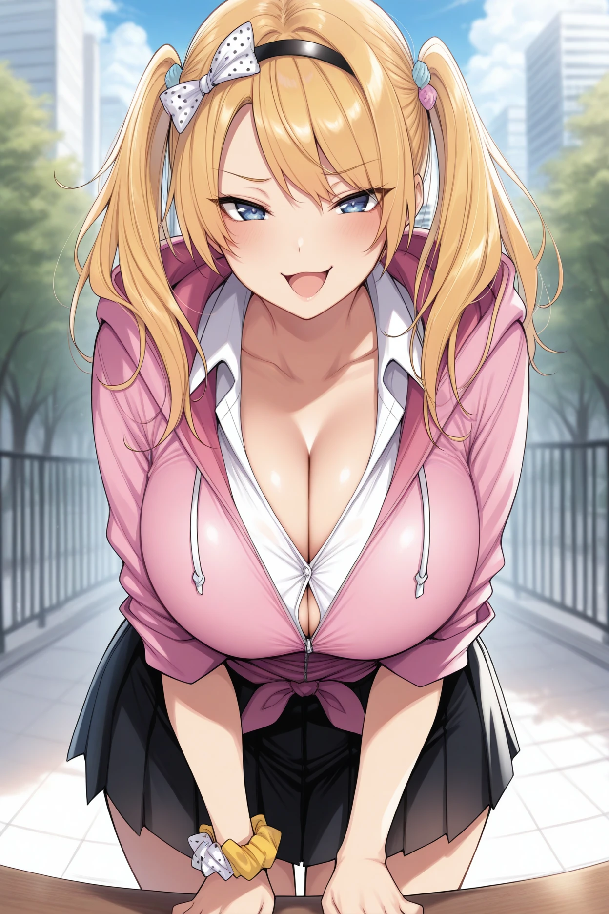 Add "hair bow, hair bobbles, hairband, white shirt, collared shirt, pink hoodie, sleeves rolled up, cleavage, bra, pleated skirt, black skirt, miniskirt, thigh strap, wrist scrunchie, black boots, knee boots" for her most common hoodie/skirt uniform look.