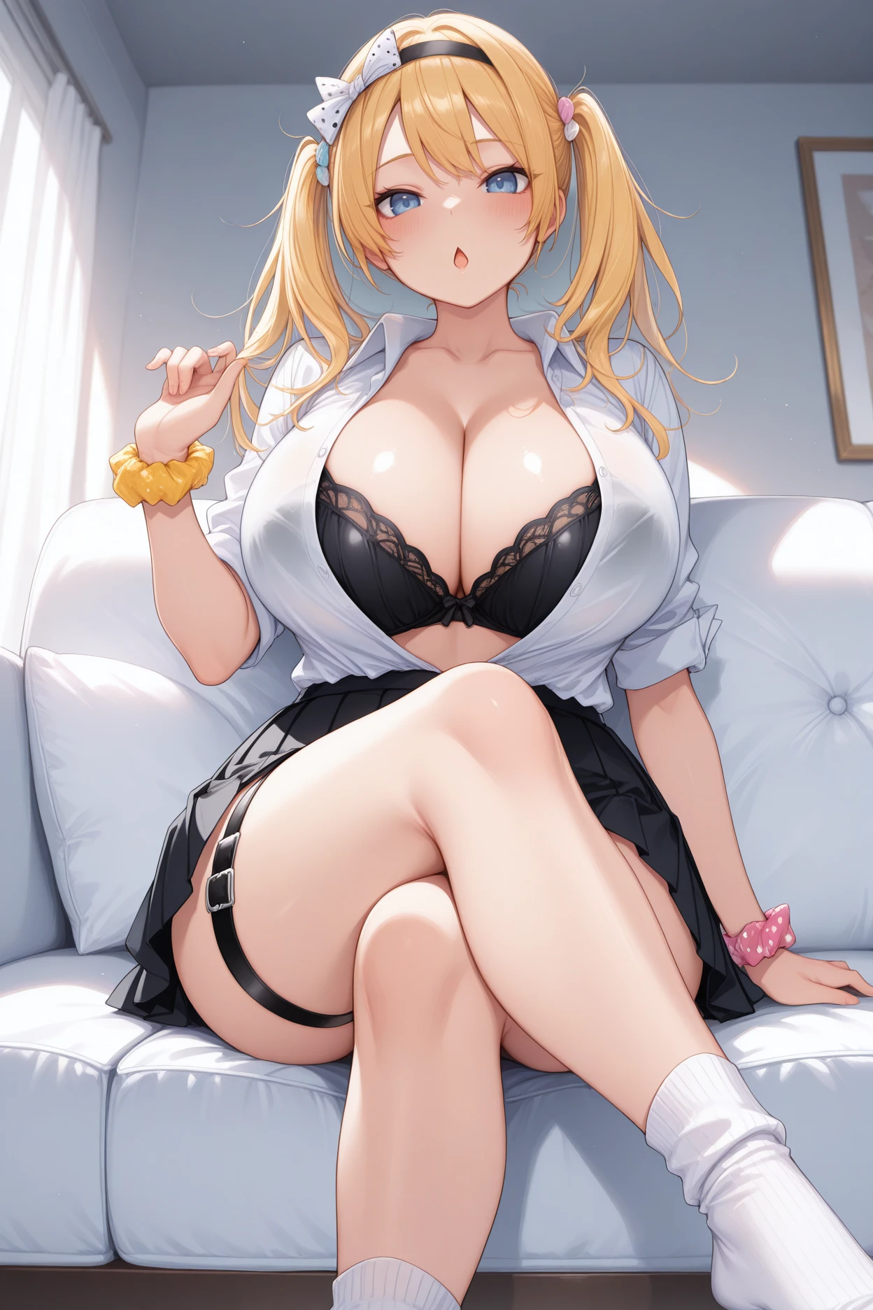 hair bow, hair bobbles, hairband, white shirt, collared shirt, pink hoodie, sleeves rolled up, cleavage, black bra, pleated skirt, black skirt, miniskirt, thigh strap, wrist scrunchie, black boots, knee boots