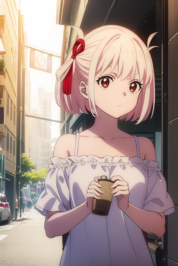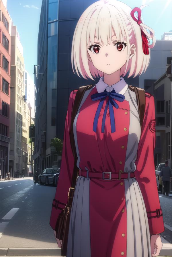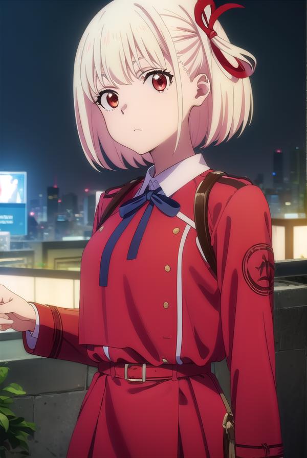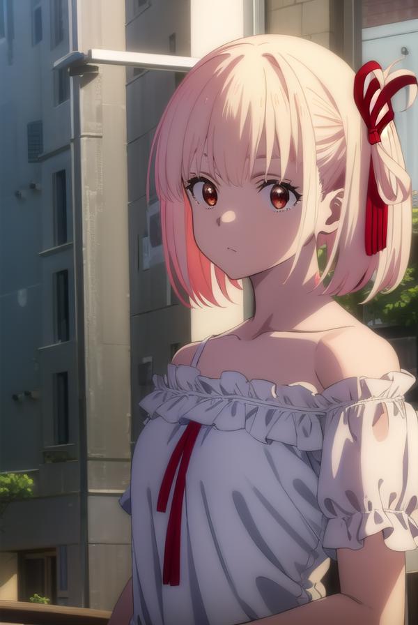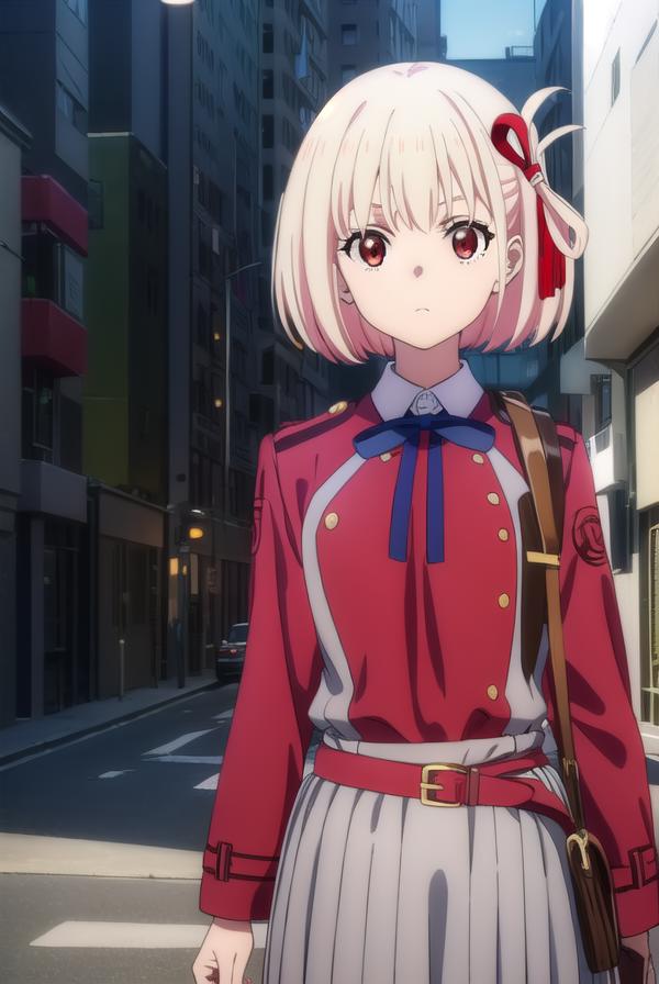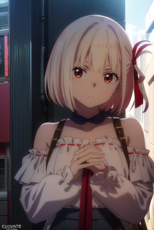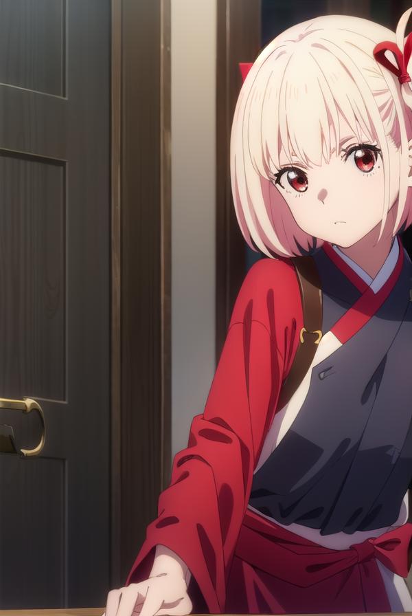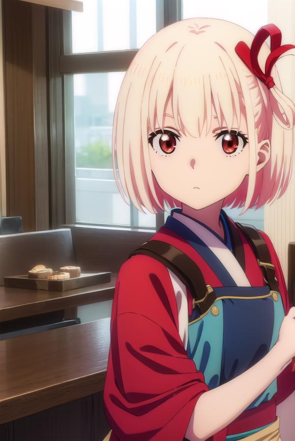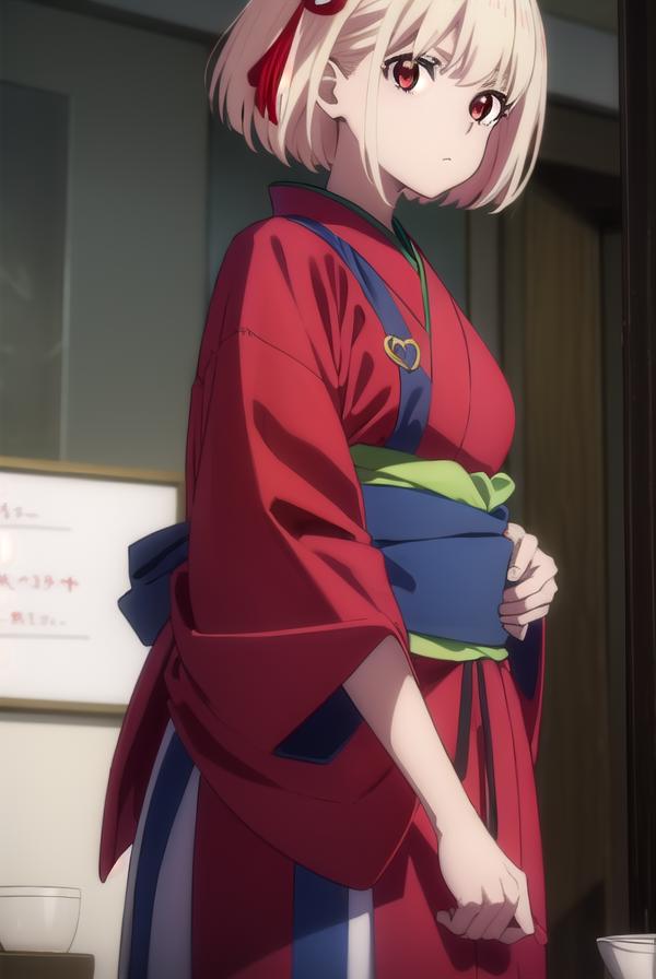 nishikigi chisato, short hair, bangs, blonde hair, (red eyes:1.5), hair ribbon, one side up, bob cut,