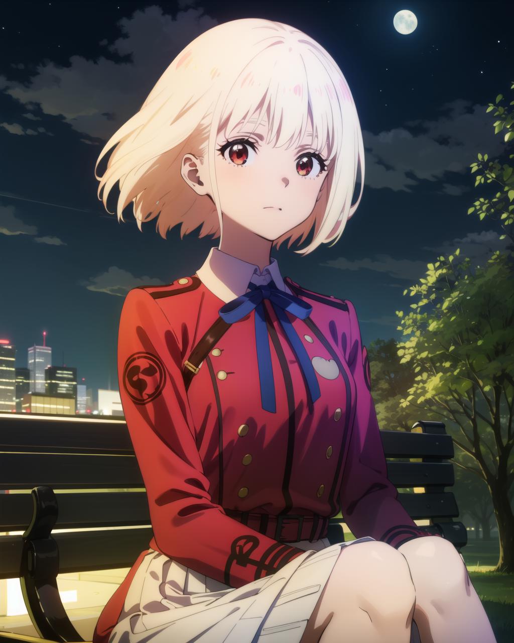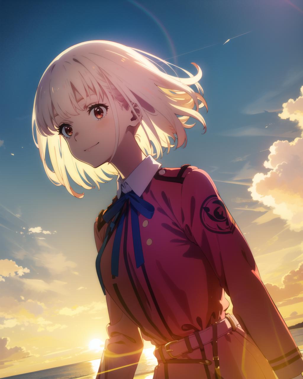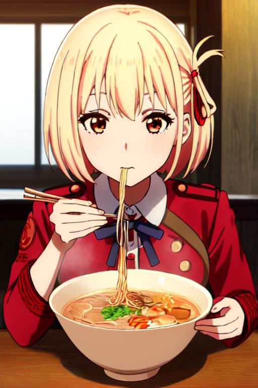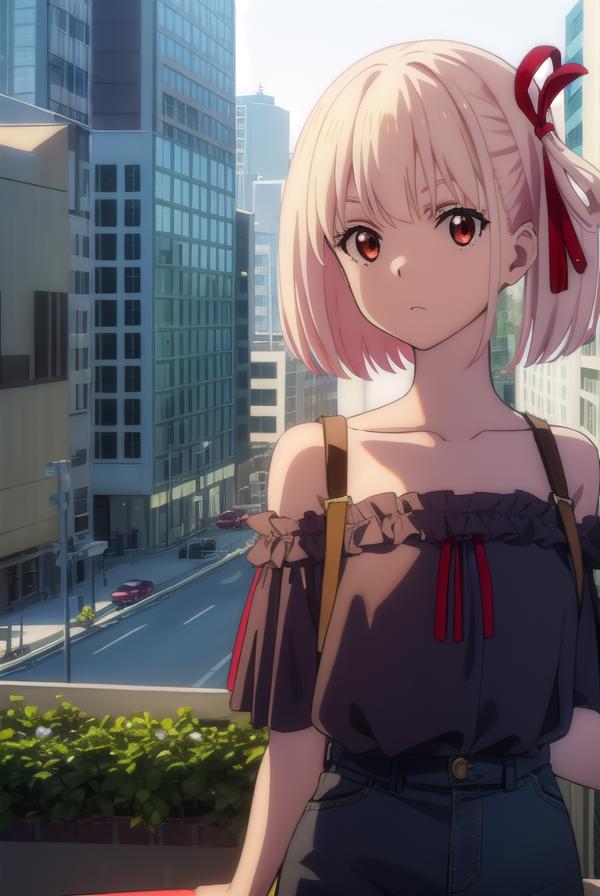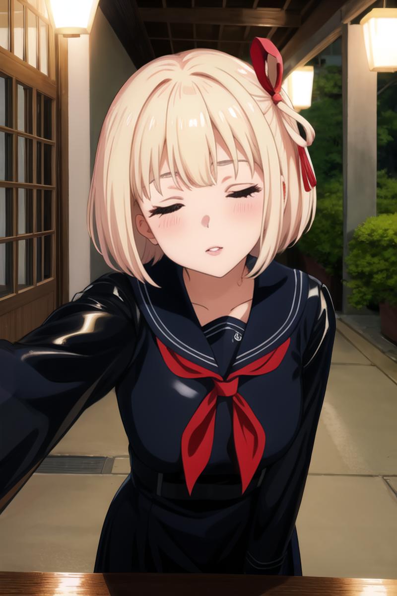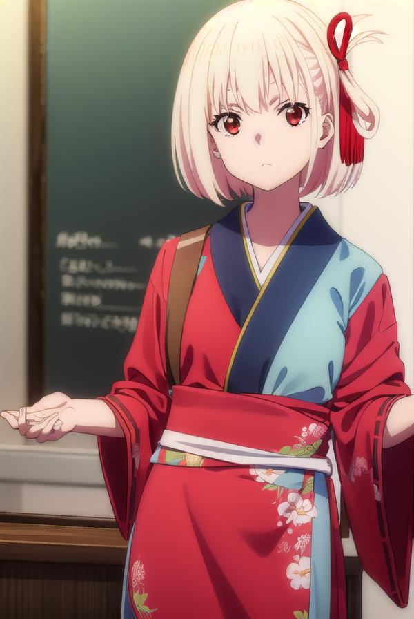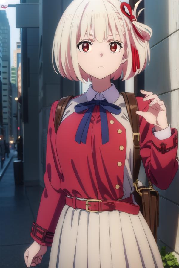 nishikigi chisato, short hair, bangs, blonde hair, (red eyes:1.5), hair ribbon, one side up, bob cut,