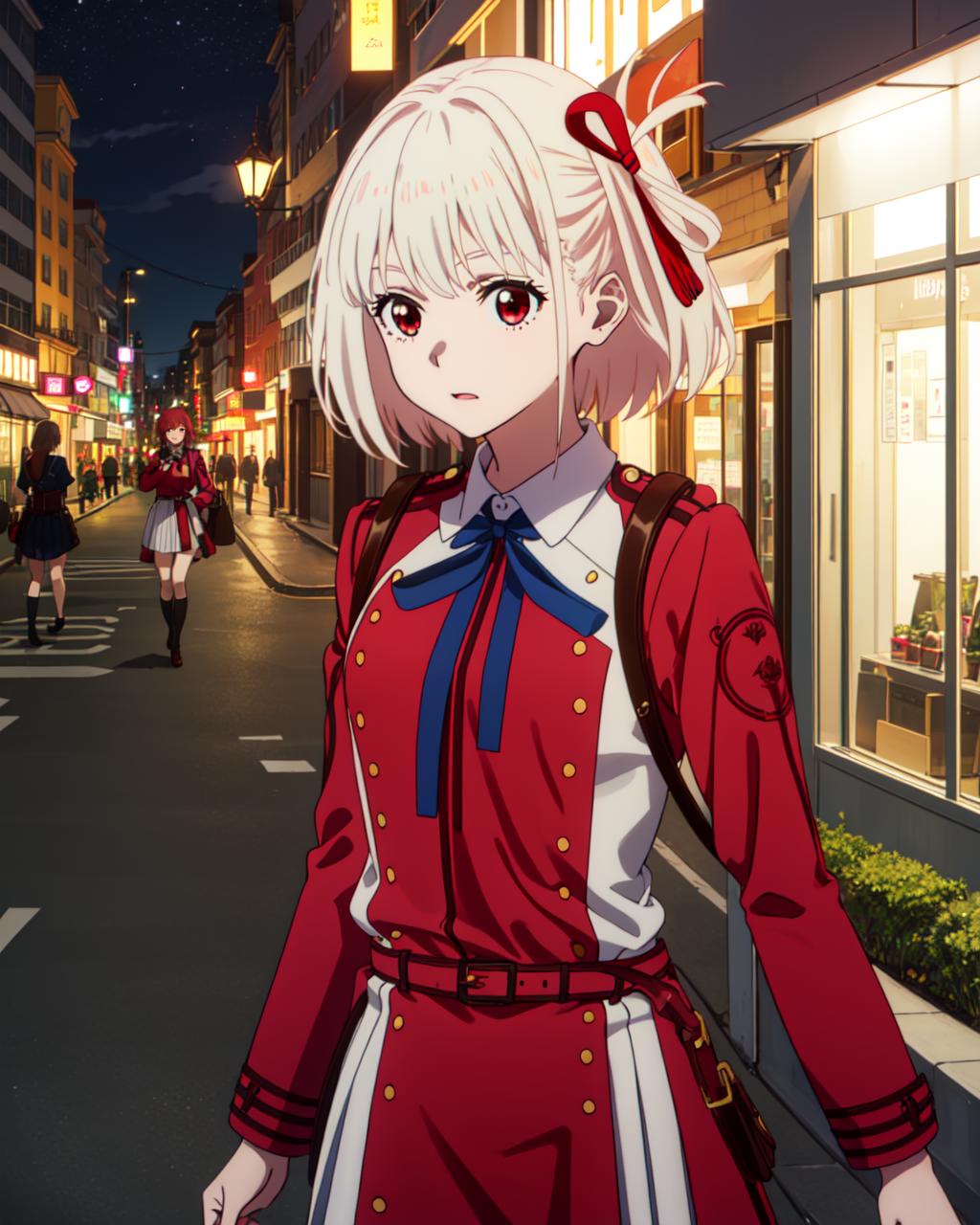 Lycoris Uniform: shirt, long sleeves, dress, ribbon, white shirt, collared shirt, belt, neck ribbon, red dress, blue ribbon, pleated dress, grey dress, two-tone dress, red belt, lycoris uniform,