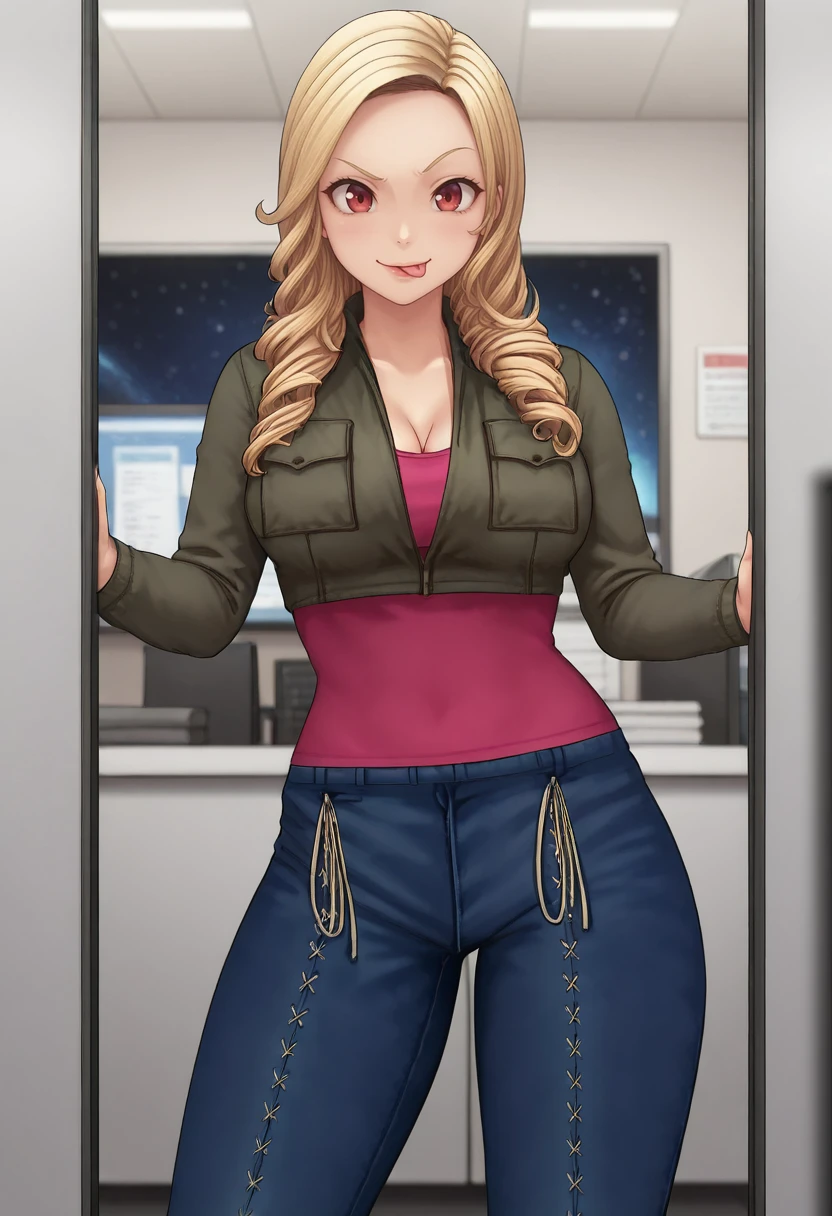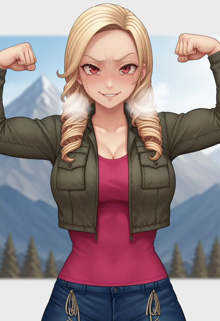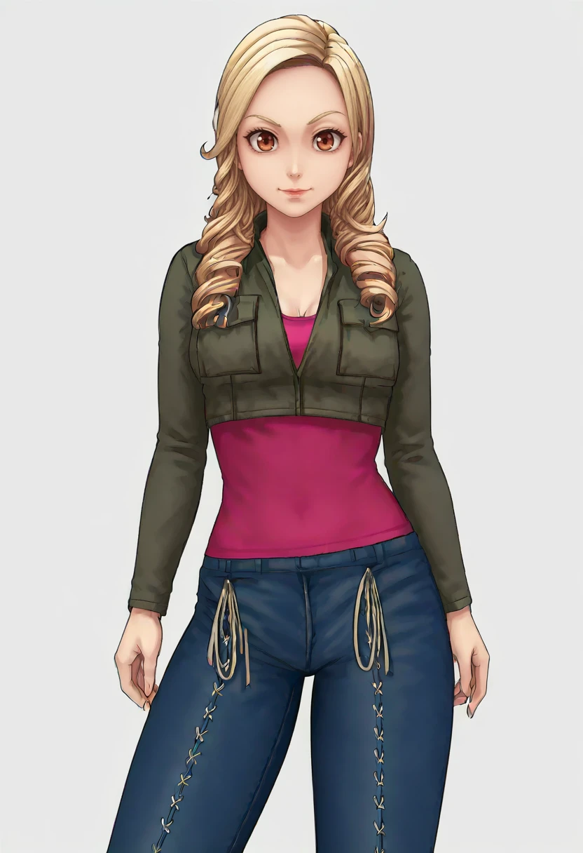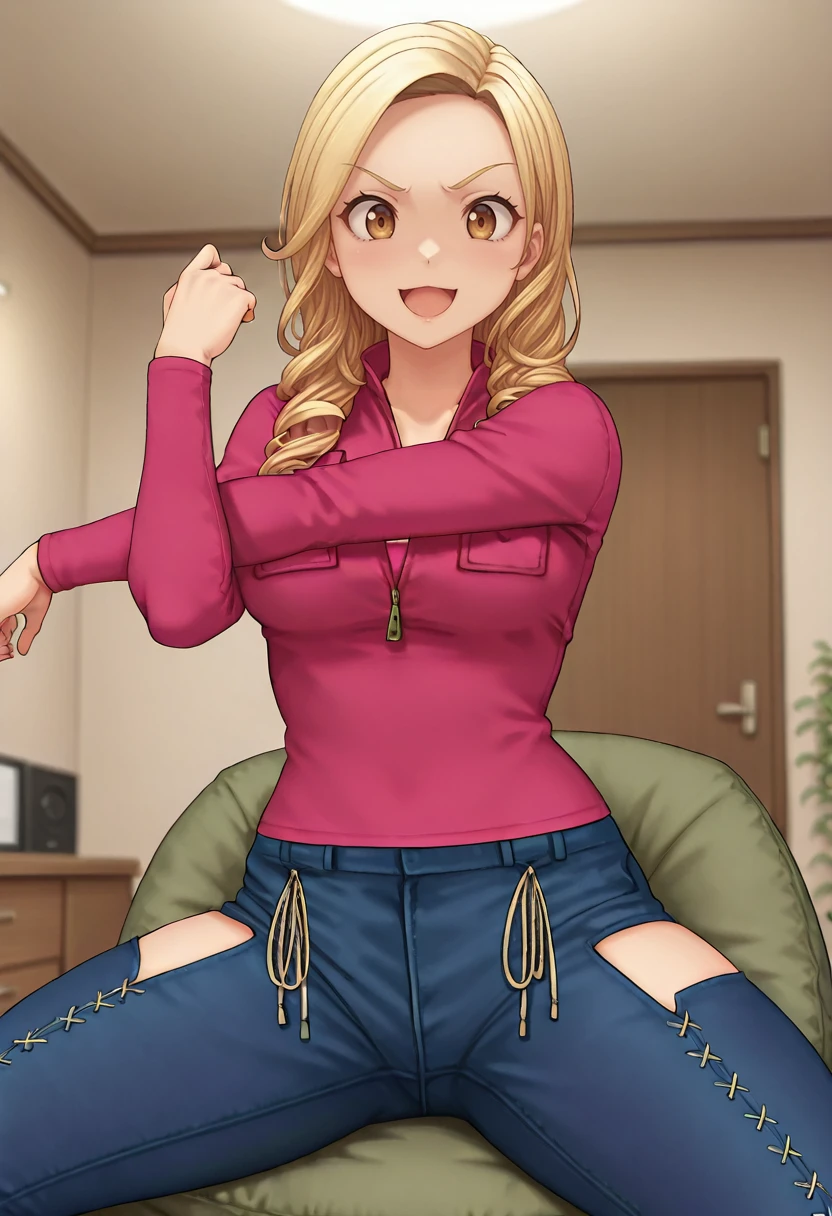 jacket, pink shirt, jeans
