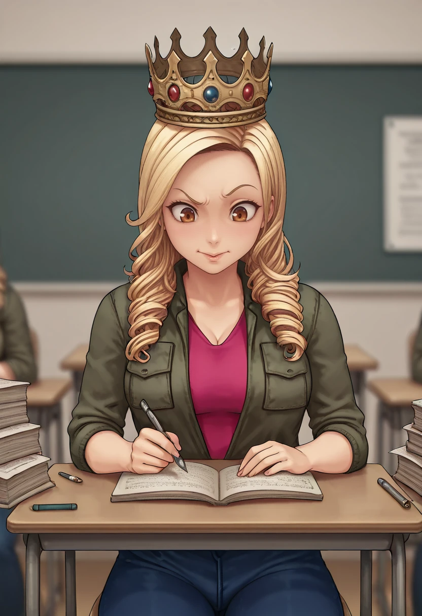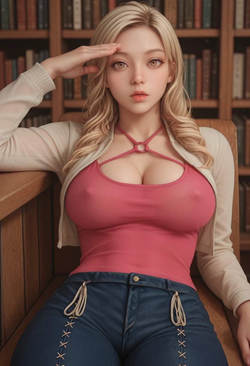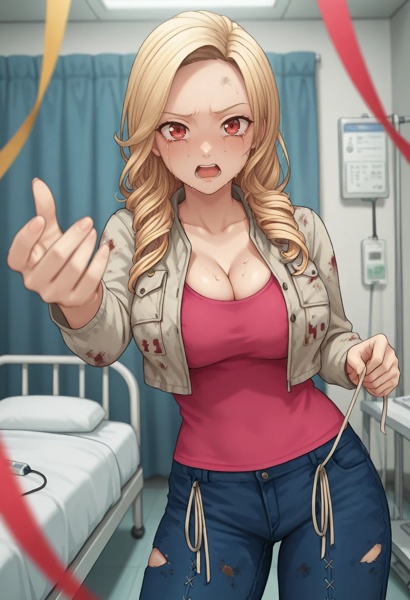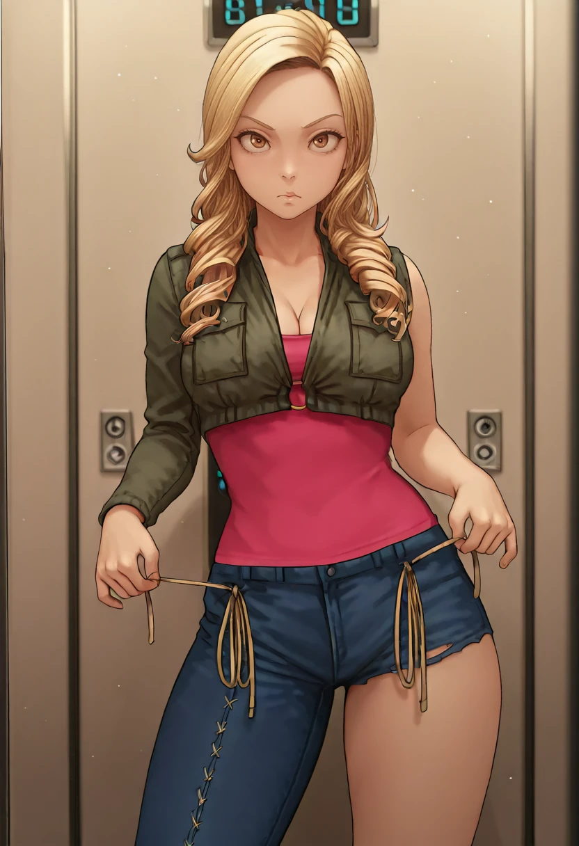 jacket, pink shirt, jeans