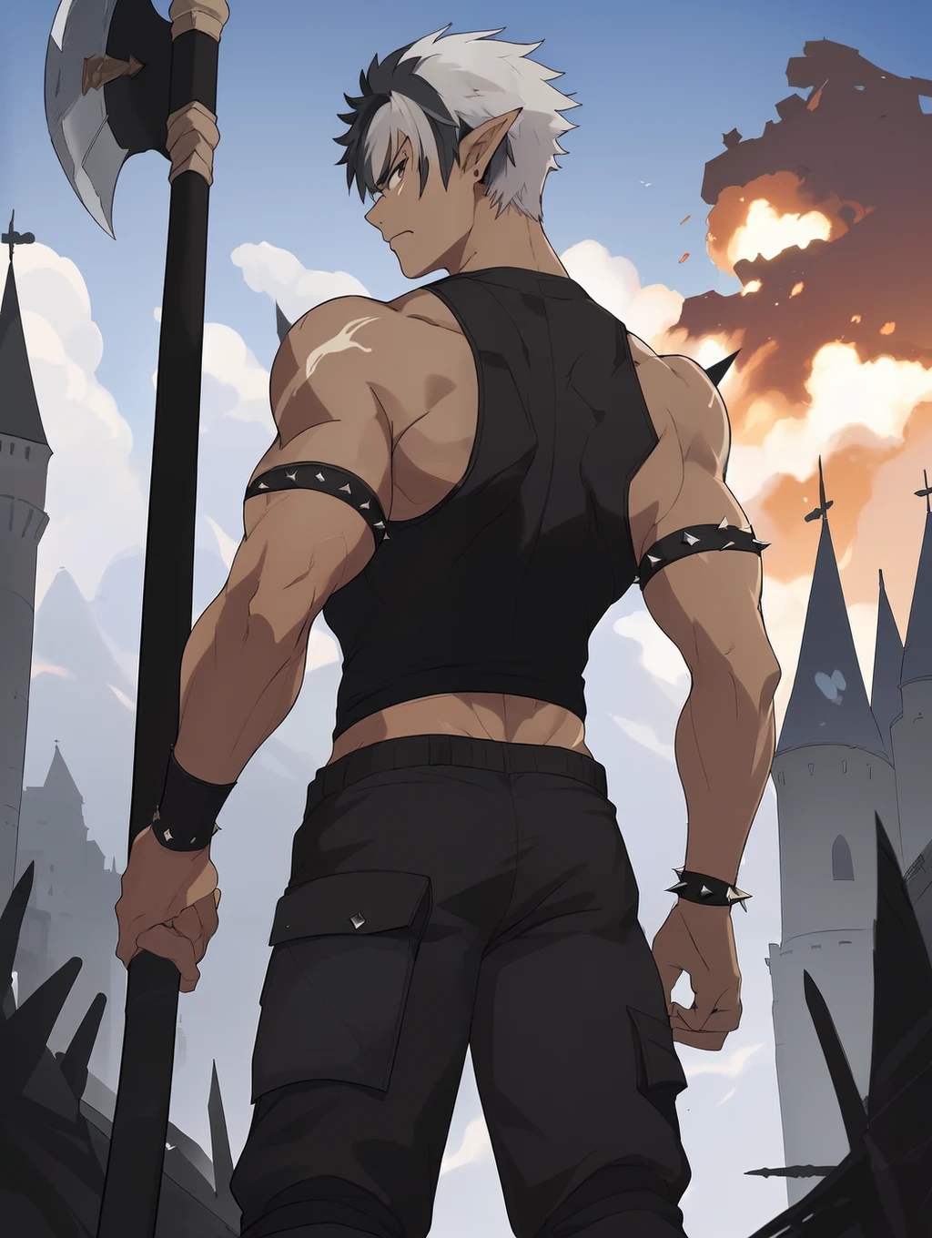 Optional: holding axe, axe, war, smiling, teeth, angry, black tank top, sleevless, biceps,