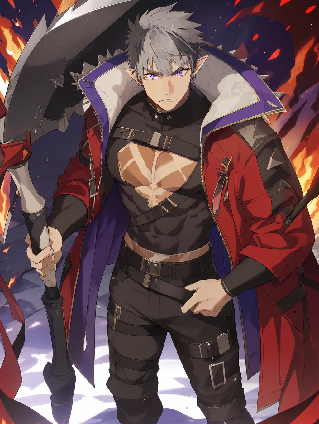 Tags: crimsonruze, (tanned skin), muscular male, pointy ears, spiky hair, grey hair, black streaked hair, pectoral cleavage, red coat, open clothes, purple eyes, spiky shoulders, belts, black pants, earrings,