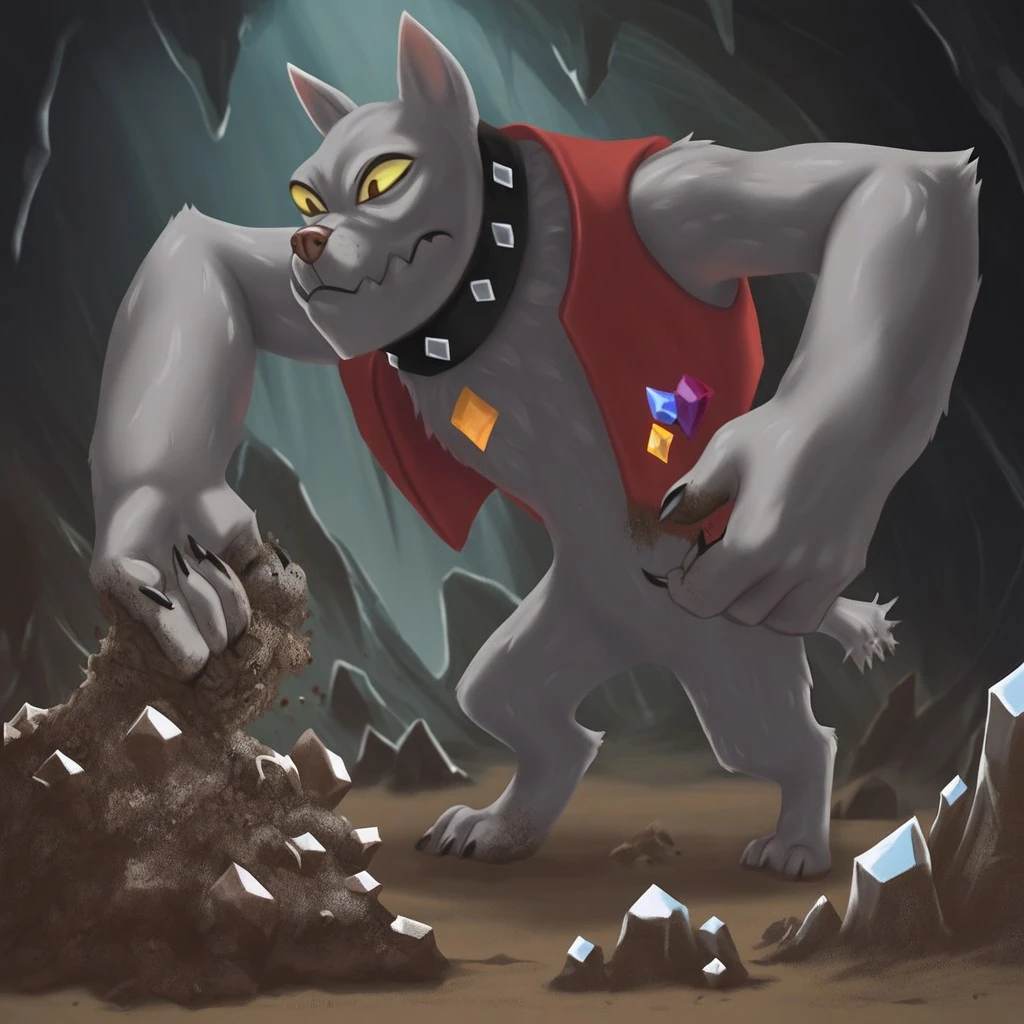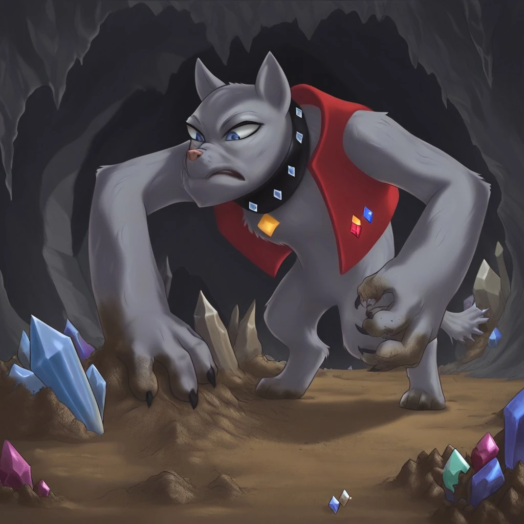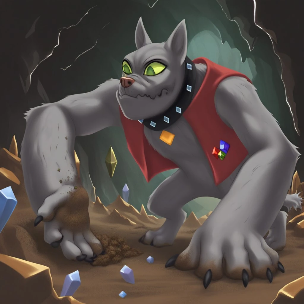 ((solo, Rover_DD, anthropomorphic dog, green eyes, red vest, grey fur, diamond studded collar, four claws))
