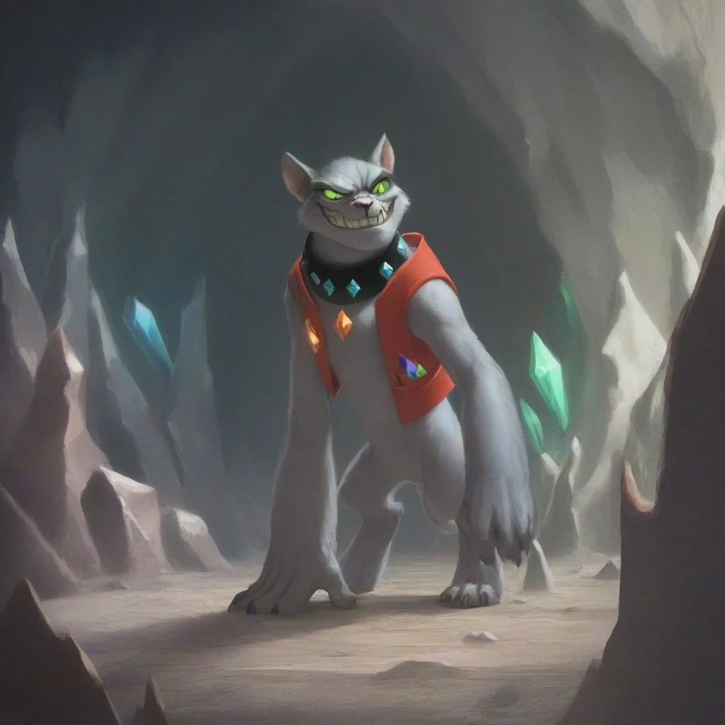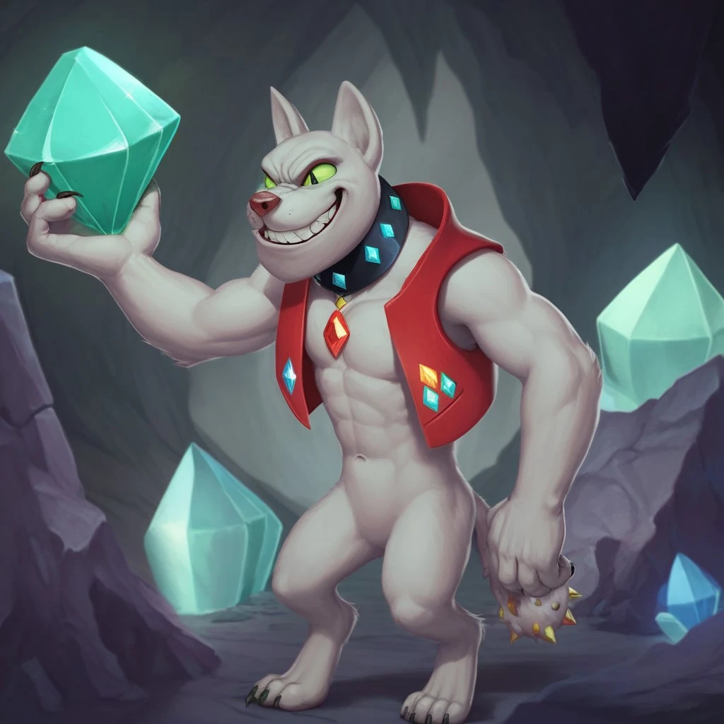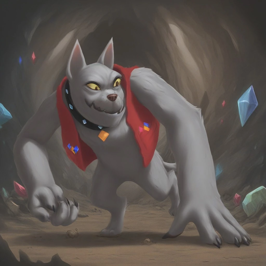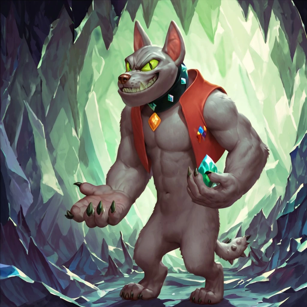 ((solo, Rover_DD, anthropomorphic dog, green eyes, red vest, grey fur, diamond studded collar, four claws))