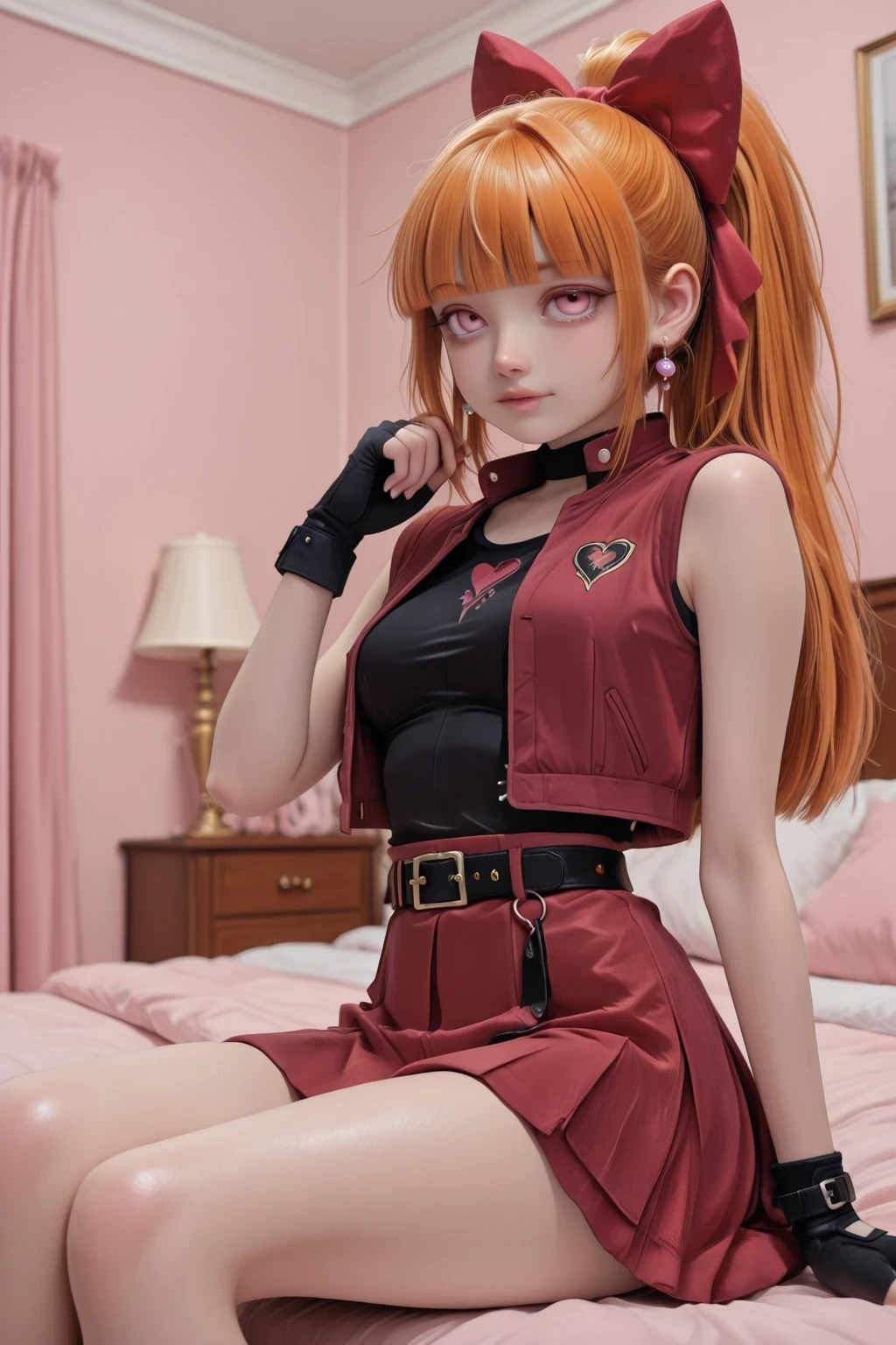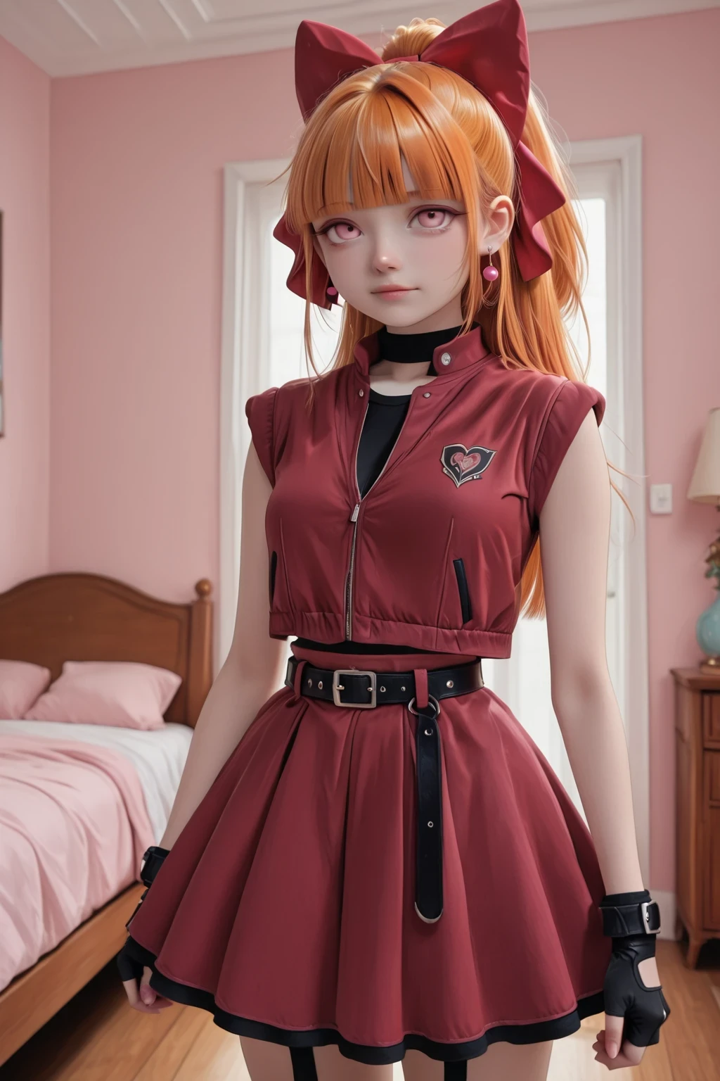 Bombom,pink eyes, orange hair, blunt bangs, hair bow, ponytail, earrings,medium breast,,light skin pink,red bow, fingerless gloves,red skirt, belt, red vest,
