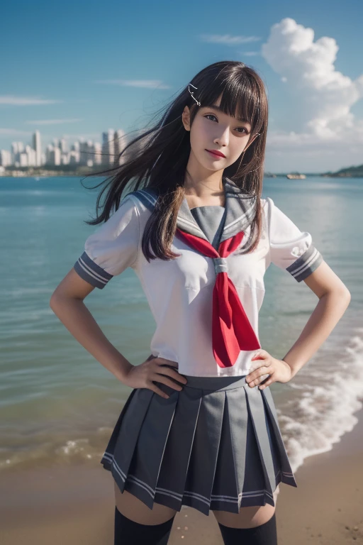 serafuku, sailor collar, short sleeves, necktie, tie clip, pleated skirt,kneehighs,