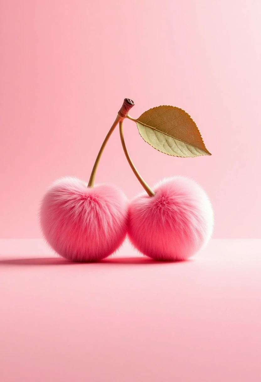 Fluffy texture, fuzzy cherry pairs, soft pink tones, light background, digital illustration, delicate highlights.